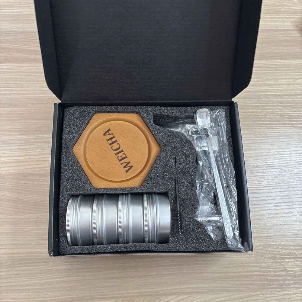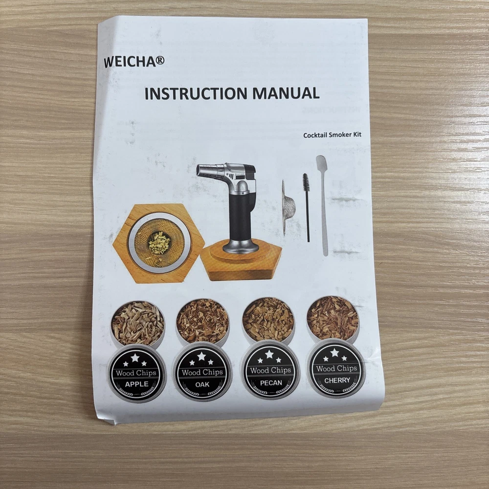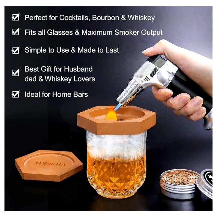The product is a "Weicha" wood cocktail smoker kit designed for making old-fashioned cocktails. It includes 4 wood chips and is suitable for adding a smoky flavor to your drink. It can be a great addition to a home bar setup, especially for those interested in creating unique and flavorful cocktails.