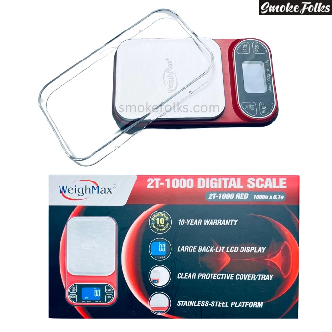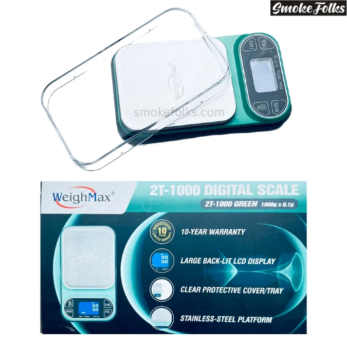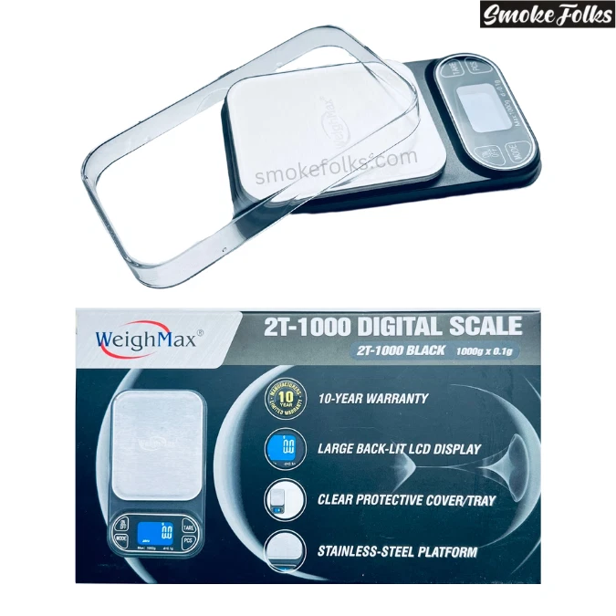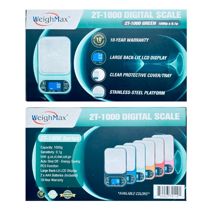 WEIGHMAX 2T-1000 X 0.1G LED DIGITAL SCALE – PRECISION AND HIGH CAPACITY The Weighmax 2T-1000 Digital Scale is designed for precision and versatility, offering a maximum capacity of 1000 grams with 0.1-gram sensitivity . Ideal for measuring ingredients, jewelry, or small items, this scale combines accuracy with convenience. With a TARE function , auto shut-off , and easy calibration mode , it’s the perfect tool for professionals and hobbyists alike. KEY FEATURES High Capacity and Precision: Weigh up to 1000 grams with an accuracy of 0.1 grams , making it suitable for various applications. Multiple Weighing Units: Easily switch between grams (g) , ounces (oz) , carats (ct) , and pennyweight (dwt) to meet your specific needs. TARE Function: Measure items in containers or subtract packaging weight effortlessly with the TARE function. Large Backlit LCD Display: Ensures clear and easy-to-read measurements, even in low-light environments. Energy-Saving Auto Shut-Off: Automatically powers off after inactivity to conserve battery life. Easy Calibration Mode: Simplifies calibration for consistently accurate results over time. Compact and Lightweight Design: Portable and easy to store, while maintaining durability and reliability. SPECIFICATIONS Feature Details Capacity 1000 grams Readability 0.1 grams Weighing Units g, oz, ct, dwt TARE Function Yes Display Large Backlit LCD Auto Shut-Off Yes (energy-saving feature) Calibration Easy Calibration Mode Power Source 2 AAA batteries (included) WHAT’S INCLUDED IN THE BOX? Weighmax 2T-1000 Digital Scale 2 AAA Batteries User Manual WHY CHOOSE THE WEIGHMAX 2T-1000 X 0.1G DIGITAL SCALE? High Precision and Capacity: Accurately measure up to 1000 grams with 0.1g sensitivity , ideal for various uses. Versatile Unit Conversions: Easily switch between different units to suit your needs. Energy Efficient: Auto shut-off preserves battery life for extended use. User-Friendly Features: TARE function and easy calibration simplify weighing tasks. Portable and Durable: Compact, lightweight, and built to last, perfect for home or professional use. The Weighmax 2T-1000 X 0.1G LED Digital Scale offers unmatched accuracy and functionality. Whether you need it for professional tasks or personal projects, this scale provides reliable performance and ease of use.