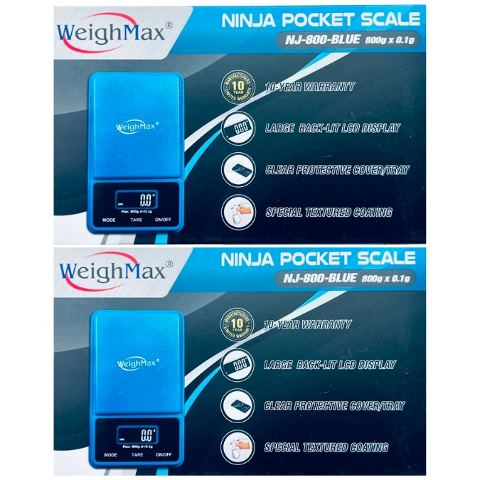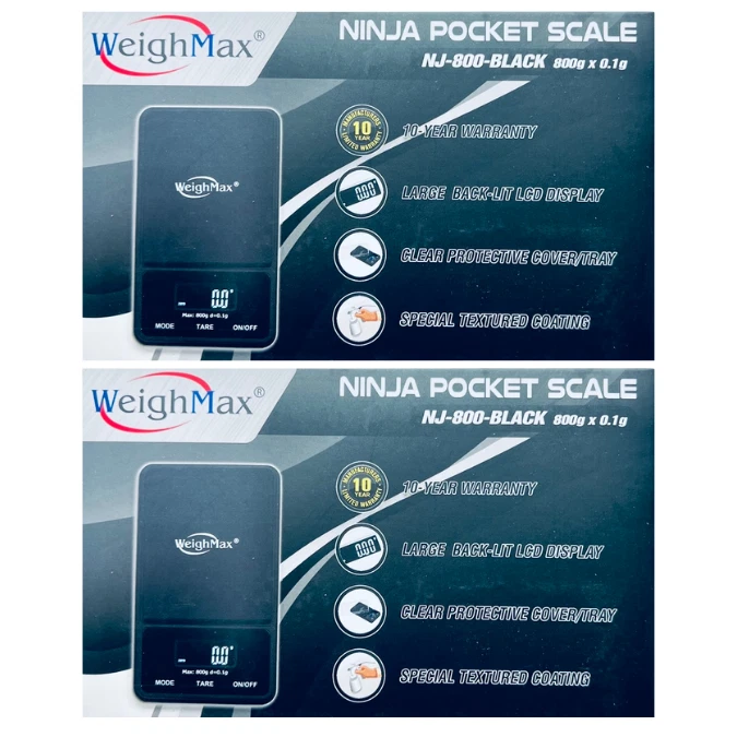 WEIGHMAX NJ-800 X 0.1G DIGITAL POCKET SCALE – PRECISION IN YOUR POCKET The Weighmax NJ-800 Digital Pocket Scale is the perfect combination of precision, durability, and portability. Designed with a capacity of 800 grams and a sensitivity of 0.1 grams , it delivers accurate measurements for professional and personal use. The large back-lit LCD display , protective cover, and user-friendly features make it an excellent choice for a wide range of applications. KEY FEATURES High Precision and Capacity: Accurately measures up to 800 grams with 0.1g sensitivity , suitable for jewelry, ingredients, and more. Large Back-Lit LCD Display: Ensures clear readability of measurements, even in dimly lit environments. Protective Cover Doubles as Tray: Comes with a clear protective cover that can also be used as a weighing tray for added convenience. Special Textured Coating: Provides a premium feel and extra grip for secure handling. Multiple Weighing Units: Easily toggle between grams (g) , ounces (oz) , troy ounces (ozt) , and carats (ct) for versatile use. TARE Function for Accuracy: Measure items in containers or subtract the weight of packaging with ease. Energy-Saving Auto Shut Off: Automatically powers off after a period of inactivity to save battery life. DIY Calibration: Features a simple calibration process to maintain long-term accuracy. Battery-Powered and Portable: Operates on 2 AAA batteries (included), ensuring convenience and portability. SPECIFICATIONS Feature Details Capacity 800 grams Readability 0.1 grams Weighing Units g, oz, ozt, ct Display Large Back-Lit LCD TARE Function Yes Protective Cover Doubles as a weighing tray Auto Shut-Off Yes (energy-saving feature) Calibration Easy DIY Calibration Power Source 2 AAA batteries (included) WHAT’S INCLUDED IN THE BOX? Weighmax NJ-800 Digital Pocket Scale Clear Protective Cover/Weighing Tray 2 AAA Batteries User Manual WHY CHOOSE THE WEIGHMAX NJ-800 X 0.1G DIGITAL POCKET SCALE? Exceptional Precision and Capacity: Measures up to 800 grams with 0.1g accuracy , ideal for various tasks. Compact and Portable: Pocket-sized design with a protective cover for on-the-go convenience. User-Friendly Design: Back-lit LCD, multiple units, and TARE function ensure effortless operation. Durable Build: Special textured coating adds durability and a premium feel. Energy Efficiency: Auto shut-off feature prolongs battery life for extended use. The Weighmax NJ-800 X 0.1G Digital Pocket Scale is the ideal tool for professionals and hobbyists who value precision and portability. Its sleek design and advanced features make it a must-have for weighing tasks, big or small.