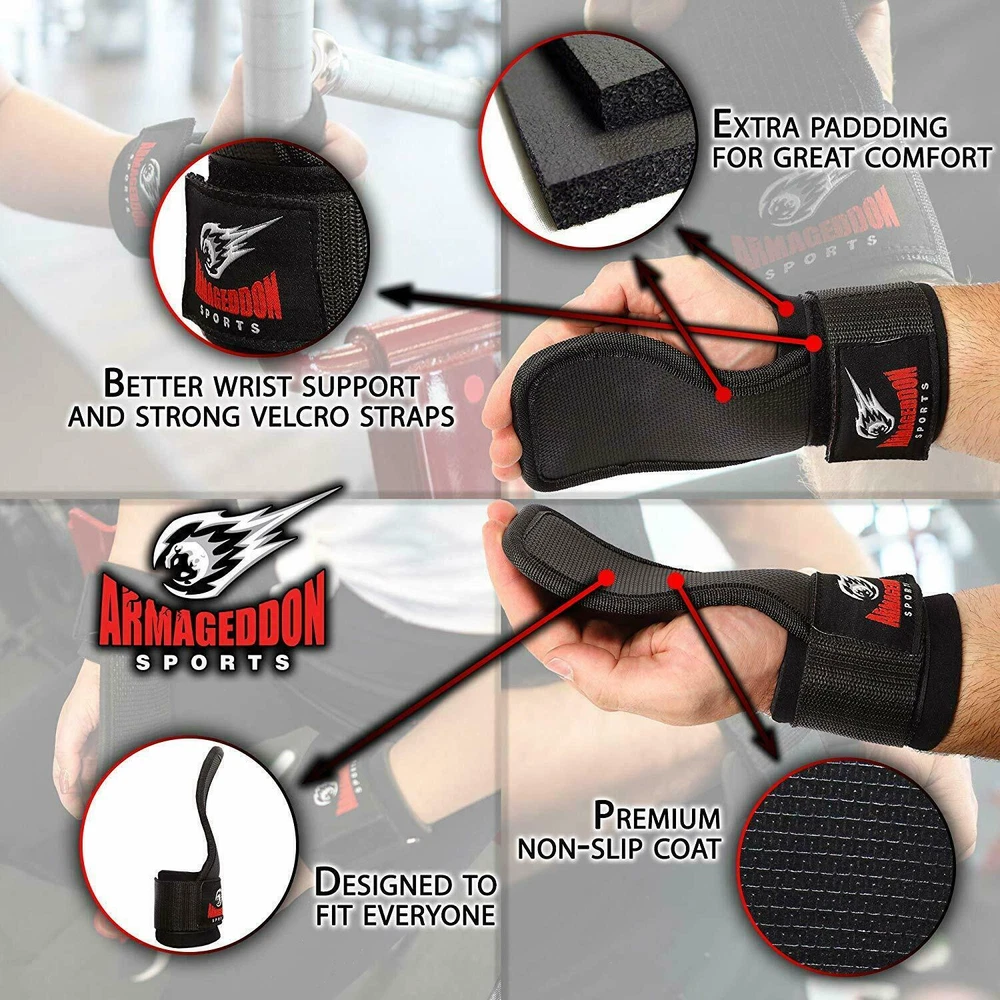 Weight Lifting Hand Grips Workout Pads with With Built in Adjustable Wrist Support Wraps for Power Lifting Pull Up Fitness Gym - Fitness Gloves Alternative by Armageddon Sports- PAIR GET READY FOR SOMETHING NEW! YES! Finally, a weight lifting training grip pads that will last forever and are super comfortable! Exactly what you need to build really strong and big muscles on you and to protect your hands of becoming rude and sore. If you have weak forearms they are this is the right equipment for you! You are not just going to improve your grip, you are going to improve also the power in your whole body in just a few training sessions and you will notice it! ?? TAKE AWAY THE OLD FASHIONED GYM GLOVES! Are you sick and tired of your regular gloves? Now you can replace them with something new and yet so effective and even better - hand pads for weight lifting. No more stinky hands and need to use the washing machine every week for them. Your hands can now breathe free during your workout and will be protected all the time. So, the only way you can be more productive and focused on your workout is to have the right equipment! ??DON?T GIVE UP ON REACHING YOUR GOALS! Thanks to the high-quality, Armageddon Sports pads for workout are perfect for all kind of exercises and sports ? pull-ups, gymnastics, fitness, weight lifting, powerlifting, chin-ups, bodybuilding and many more! Once used, you are not going to want something else, we promise you! A strong grip is super important if you want to build a strong body and prevent some serious injuries! ?? STARVING FOR RESULTS? You are in the right place! No matter our age or gender, we all want to move on. Hand grips for lifting are giving you amazing comfort without any doubt. Change the way you train to change the way you look! With our innovative product, you can make most exercises look easier. Doing more reps will be one of the advantages you will receive from the hand wraps! And by doing more reps, you know what happens next ? YOU GET BIGGER AND STRONGER!