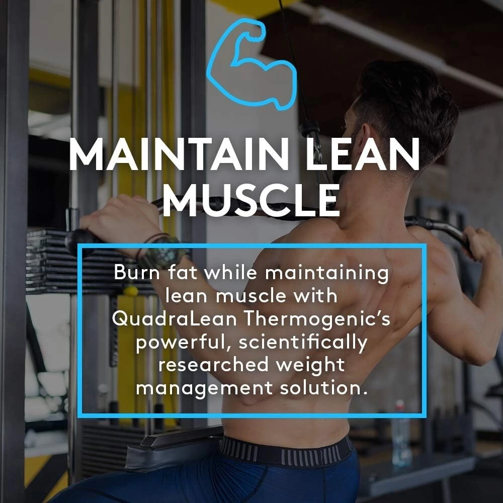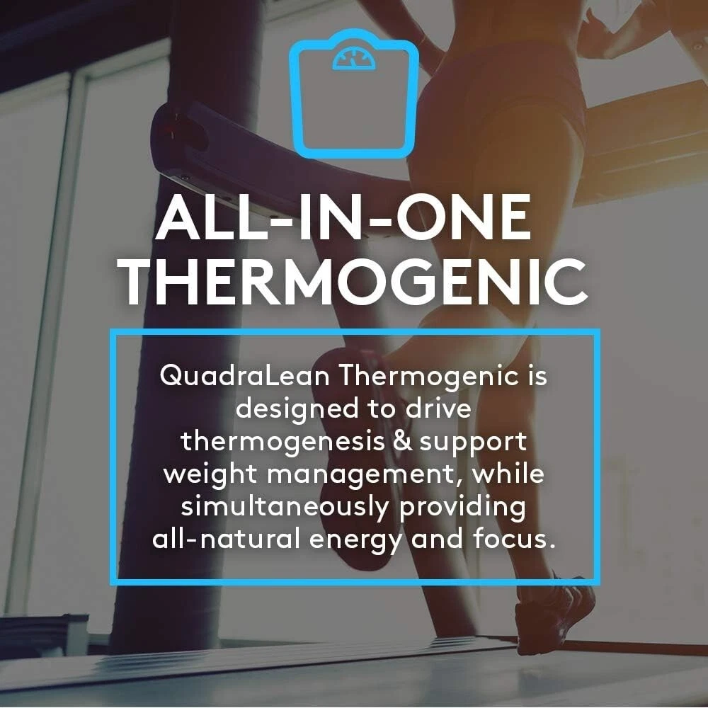 Performance Benefits THERMOGENIC WEIGHT MANAGEMENT QuadraLean Thermogenic is designed to drive thermogenesis and support weight management, while simultaneously providing all-natural energy and focus. No jitters, no crash. BOOSTS ENERGY & FOCUS Maximize your workouts with a clean boost of energy and increased mental focus provided by natural caffeine and Alpha-GPC. ALL-IN-ONE FORMULA QuadraLean Thermogenic is designed to target all critical areas of weight management including fat burning, metabolism support, and appetite suppression, What's Inside Thermogenesis Blend 500mg CLA, 25mg Cayenne Pepper Extract, and 25mg Paradoxine combine to provide complete, scientifically-backed weight management support. Clean Energy Blend 200mg of natural caffeine from Green Tea provides the boost you need to power through the most intense workouts. Neuro Focus Blend Improve focus with 50mg Alpha GPC and 300mg Choline Bitartrate. Metabolism Support Boost metabolism with 500mg of L-Carnitine per serving.