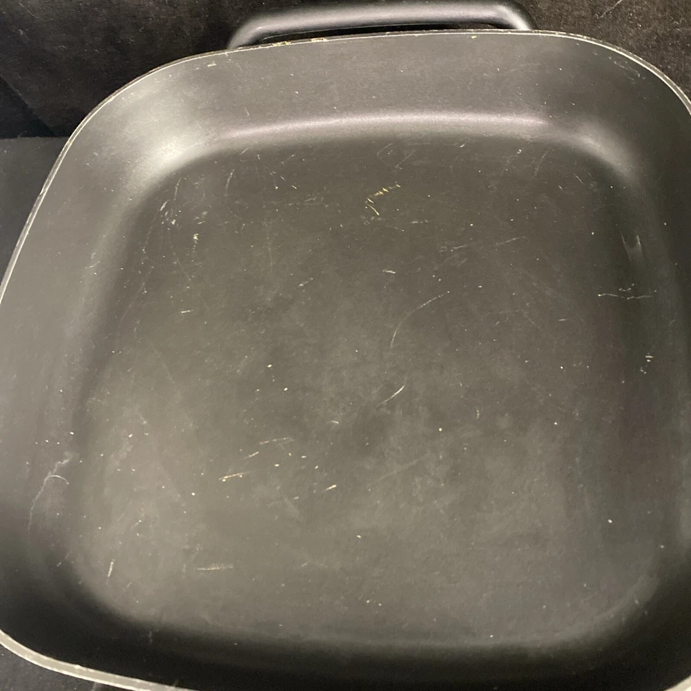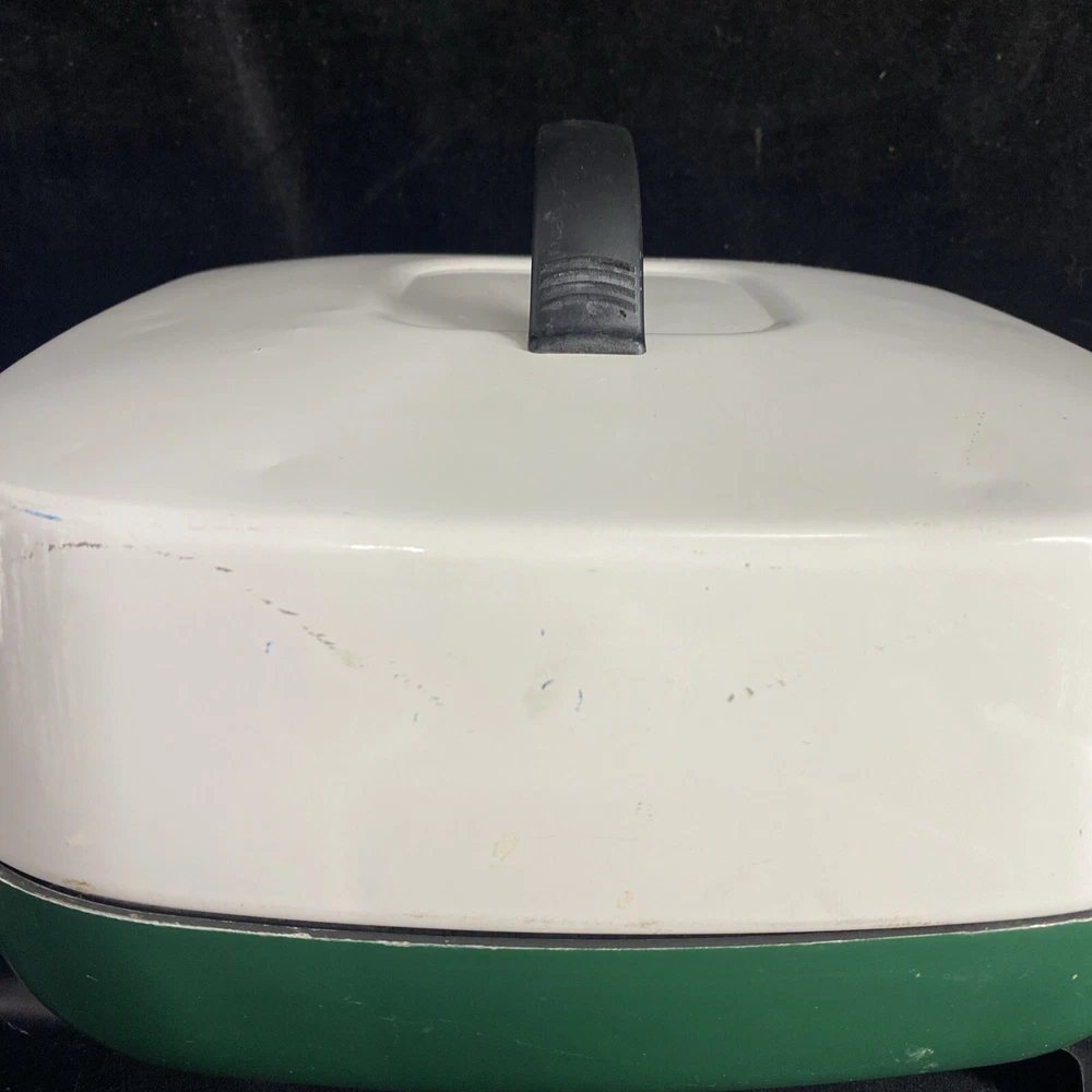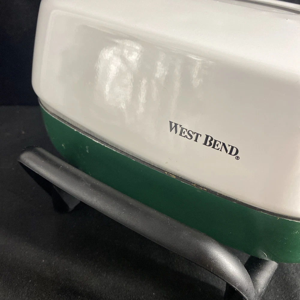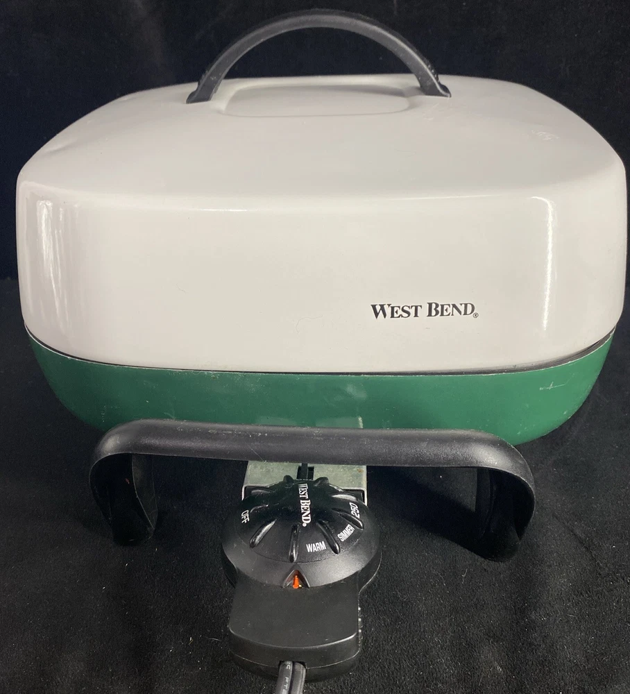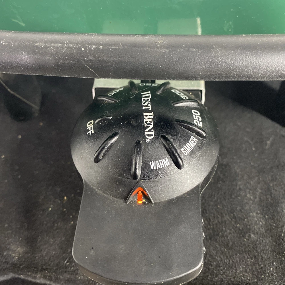 This West Bend 12" Electric Skillet is a must-have for any kitchen. Made of durable aluminum and featuring a non-stick surface, this skillet is perfect for cooking up delicious meals. With a power output of 1200W and a voltage of 120V, this electric skillet is incredibly efficient and versatile. It comes in a beautiful green and white color scheme and is compatible with a variety of appliances. Whether you're making a large meal for your family or just cooking up some bacon, this West Bend Electric Skillet is the perfect addition to your kitchen. Has some small dents in lid. Has some scuffing/scratches on lid. Has some scratches on interior non stick surface. Still works great!