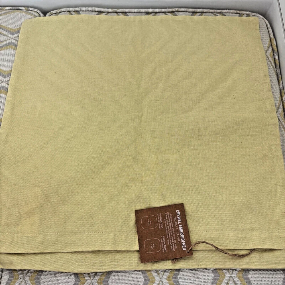 This West Elm pillow cover features a geometric pattern in yellow and white. It is square in shape, measuring 17"x17", made of 100% cotton material, and embroidered with a boho style. The design is a crewel embroidery in a broderie theme, adding a unique touch to any home decor.