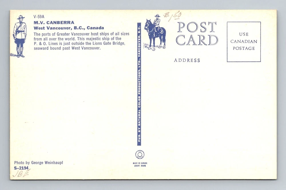 West Vancouver B.C. Canada, Cruise Ship M.V. Canberra, Vintage Souvenir Postcard