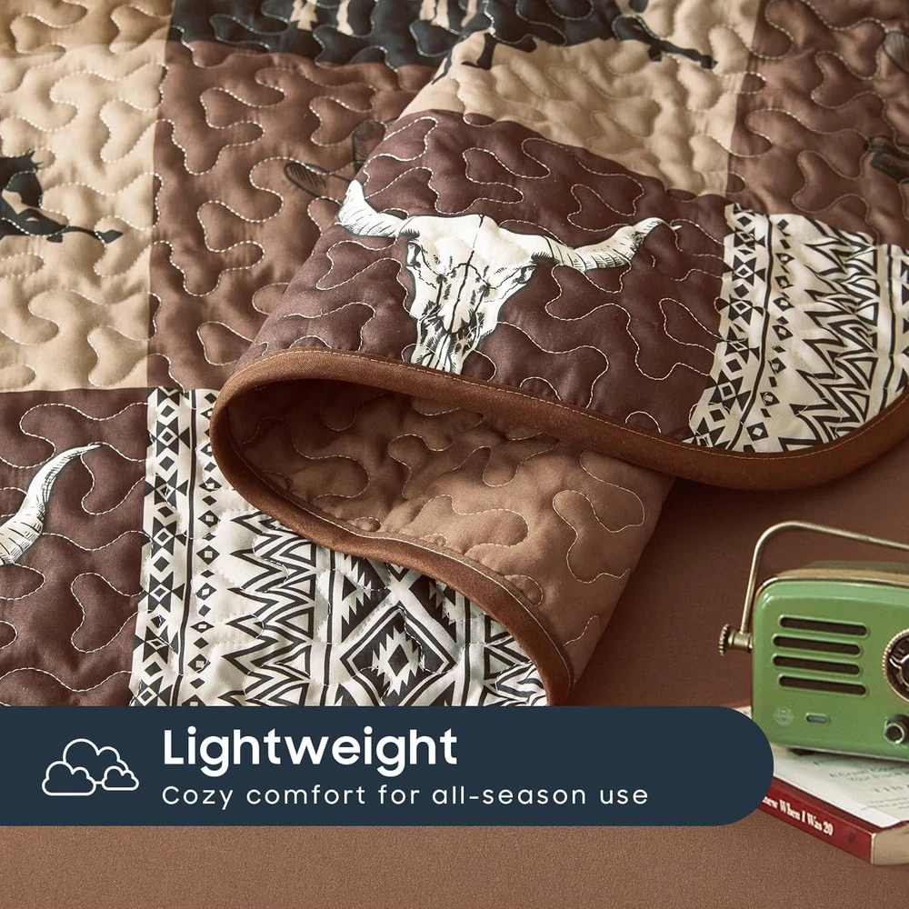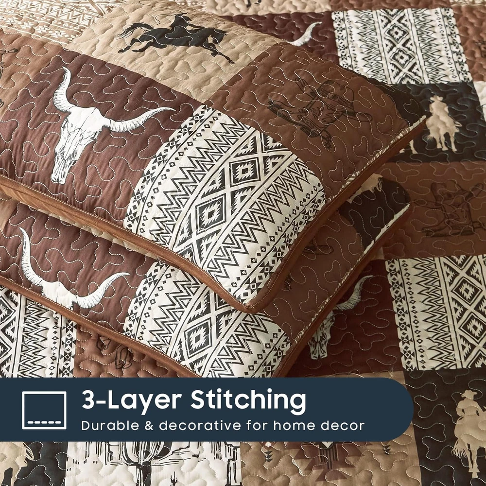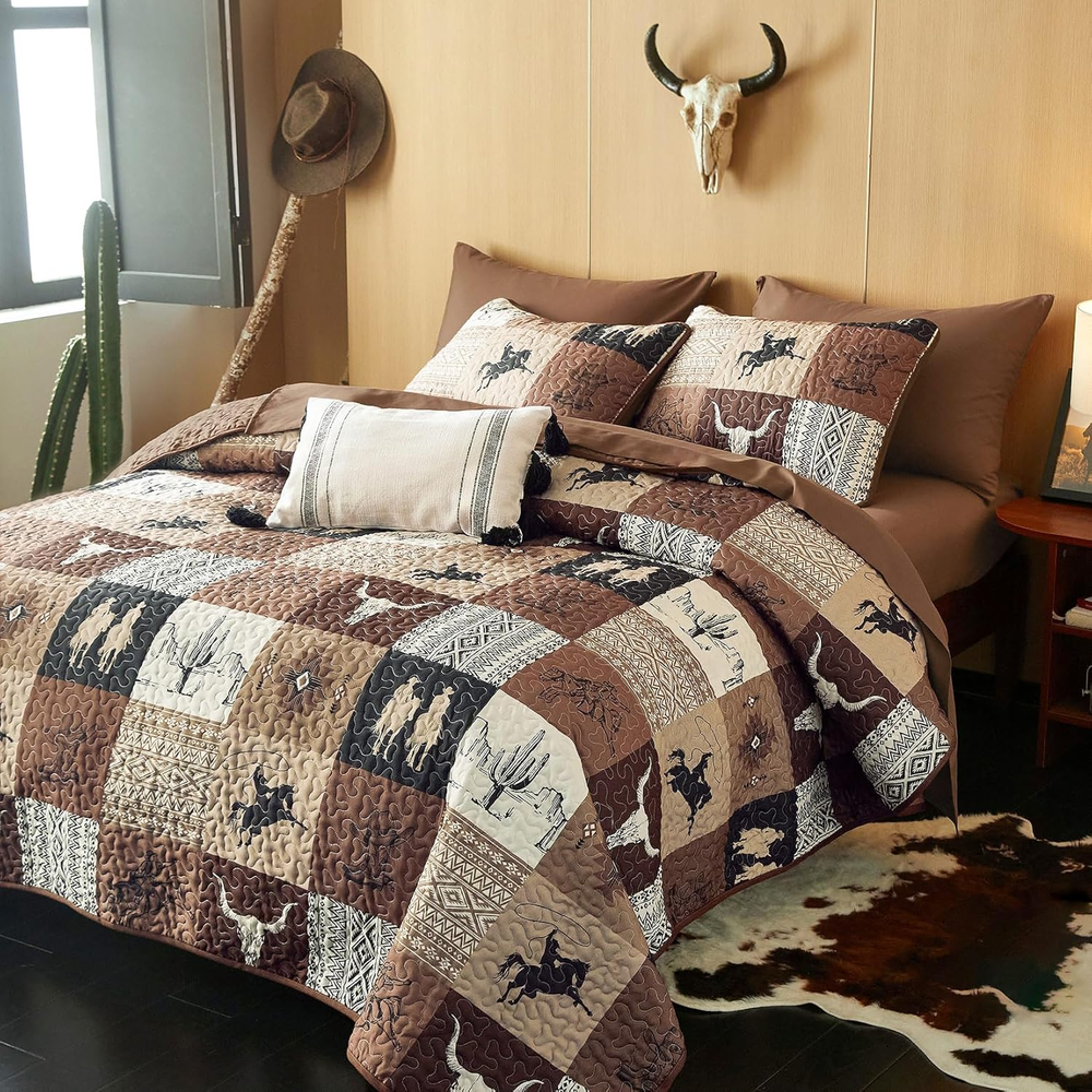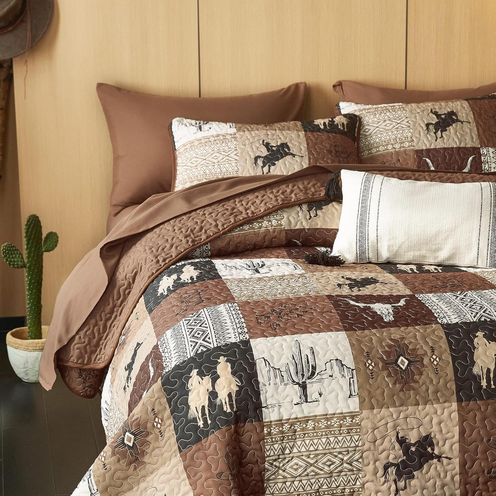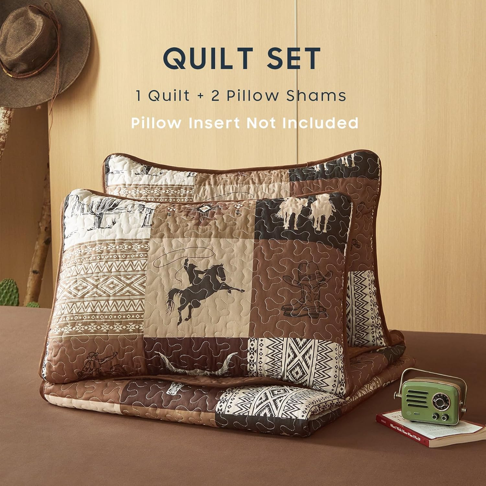 Store New Arrivals Add to Favorite View Feedback Contact Fast deliveries to the customer's home Quality customer service John Make the customers happy! - Western Quilt Set, Southwestern Aztec Country Horse Cowboy Rustic Ranch Pattern Printed, Reversible Lightweight Bedspread Coverlet, 3 Pieces, Tan Brown, King Size Description Western Design: Features a southwestern aztec patchwork pattern that adds a unique aesthetic to your cabin ranch home decor; ideal for fans of western cowboy styles King 3-Piece Set: 1 quilt / bedspread 106″ x 95″, 2 pillow shams 20″ x 36″ Versatile Comfort: Crafted from premium brushed microfiber with a high-grade polyester inner fill, this soft and lightweight quilt set serves as a light summer quilt, an extra winter bedspread, or an elegant coverlet for spring/fall bedding decor Thoughtful Details: Carefully crafted with 3-layer stitches, effectively keep the inner fillings in place, preventing any shifting; elevate your bedroom with timeless and elegant touches Easy Care: Cleaning is a breeze; machine wash in cold water on a gentle cycle, then tumble dry on low or let it air dry; avoid bleach; these simple steps keep it fresh and looking new Product description Included Components 1 Quilt / Bedspread, 2 Pillow Shams Style Southwestern Material Polyester Color Tan Brown Pattern Patchwork Pillowcase Width 20 Inches Fabric Type Microfiber Item Weight 5.59 pounds Theme Western Size King Pillowcase Length 36 Inches Seasons All, Fall, Spring, Summer Package Dimensions 14.3 x 10.56 x 5.71 inches Product Care Instructions Machine Wash Number of Pieces 3 ABOUT US We offer the best prices around on high quality products. Our E-store includes media such as books, movies, music and games while offering electronics, toys, sporting apparel, clothing, tools, general home, garden items and more. SHIPPING We are always working hard to ensure your package arrives as soon as possible. Please understand that some factors like weather, high postal traffic, and the performance of shipping companies are outside of our control. We offer free shipping to the lower 48 states and ship within 2 business days of payment, usually sooner. We do not accept P.O. Boxes. Please provide a physical address. For shipping outside of the continental USA, we only use eBay's Global Shipping Program. The item is shipped to KY and then sent to the rest of the world. International customers are responsible for all duties and taxes. Continue to 'check out' to calculate costs for shipping the item to your country. Messages regarding eBay's Global Shipping Program MUST be directed at eBay EXCLUSIVELY. RETURNS We offer a 30-Day Return Policy on items in which you are not completely satisfied with. You have the option of a full-refund or an exchange of the item. No returns are available on items shipped outside of the USA PAYMENT We accept PayPal. CONTACT US This page content is yet to come Please ad us to your favorite seller and visit again later Thank You CUSTOMER SATISFACTION We try our very best to make sure every customer is completely satisfied. If there's a problem, message us! We're happy to help. WE ACCEPT