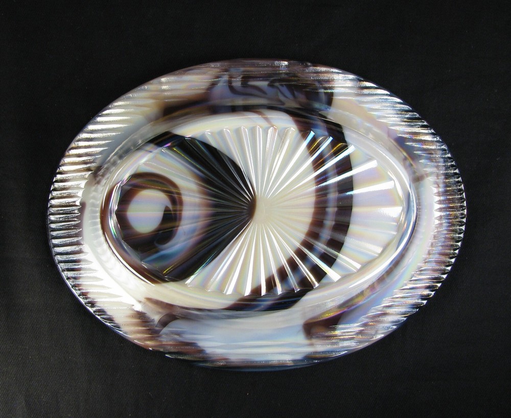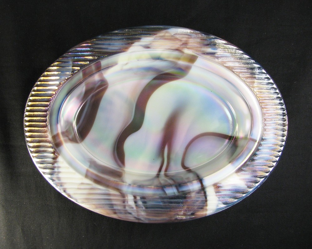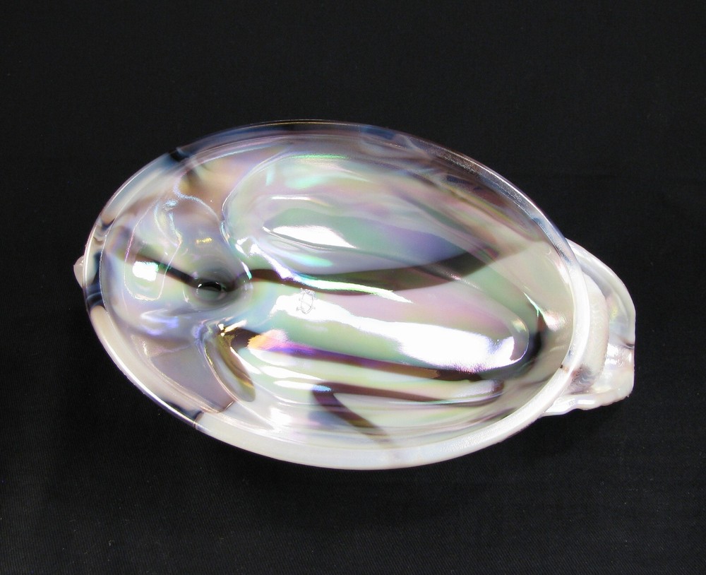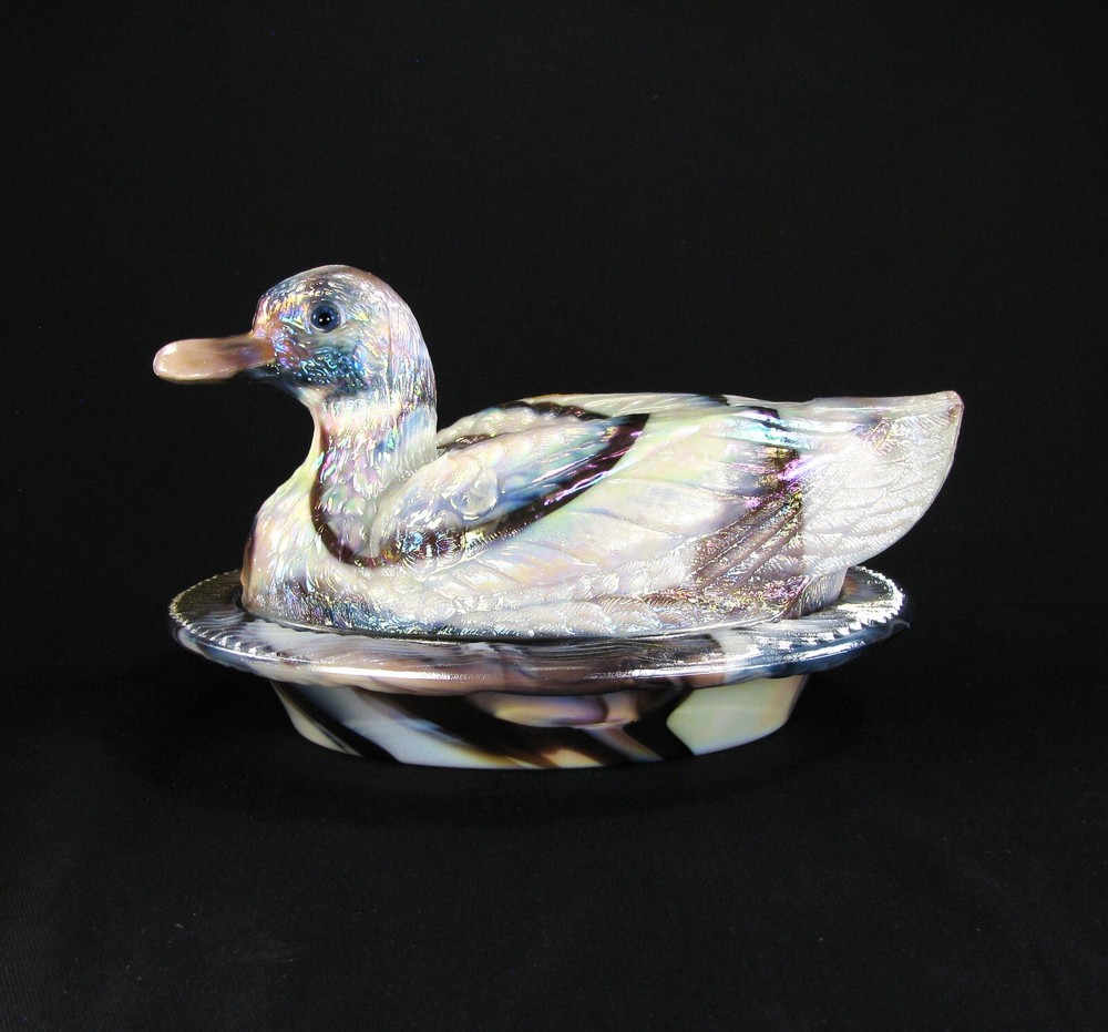 This Purple Slag Carnival Oval Duck Covered Dish was made by Westmoreland Glass as a private production for the Levay Distributing Co. located in Edwardsville, IL in 1978. This piece has a Westmoreland factory foil sticker and a ware tag - see photos. All of the purple slag carnival items made for Levay were made in very limited quantities making this piece quite rare. The mould number is OD-1 and the base measures about 8" across with both the top and bottom being marked with the factory WG logo. Westmoreland did not make any slag carnival items for their catalog items. No damage found. Please Note: This is the actual piece photographed for the book we wrote: Slag & Marble Glass, The Prominent Years, 1959-1985 (N. Taves & D. Jennings) on page 92. Combined shipping may not be possible on this piece. Inv. #1508