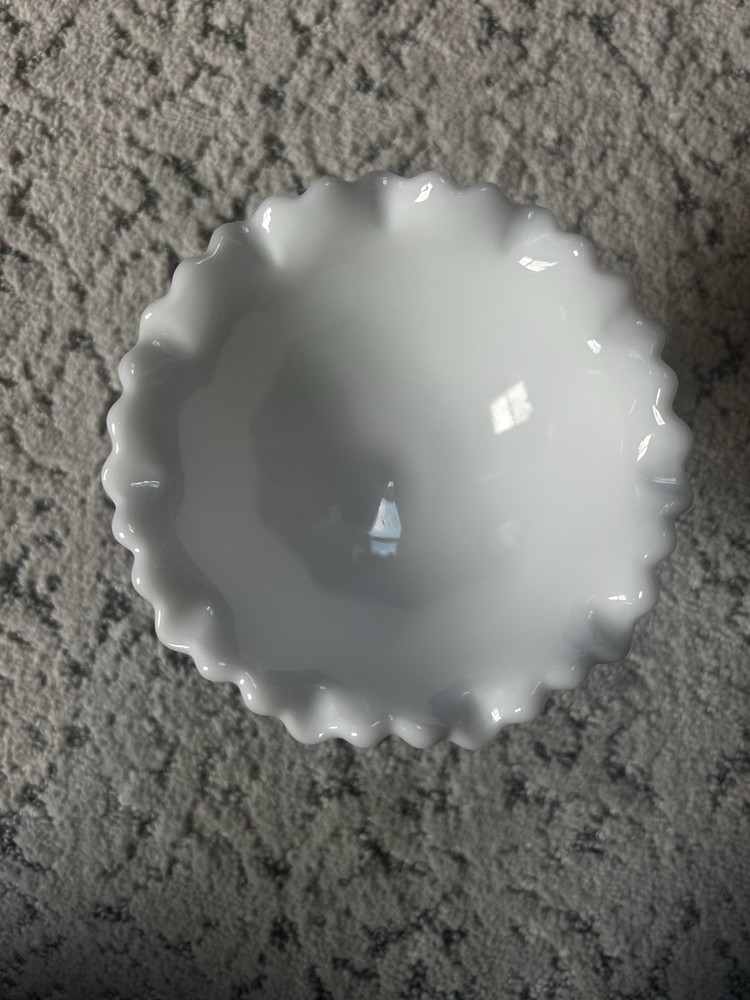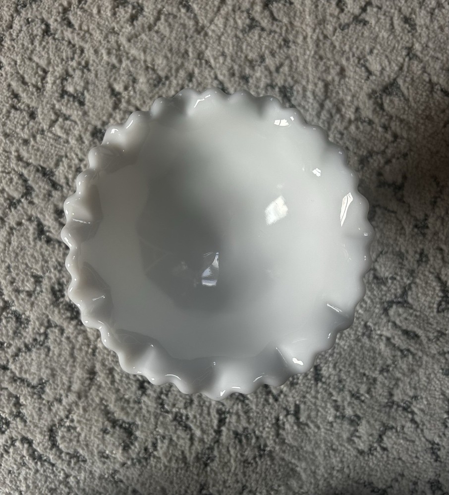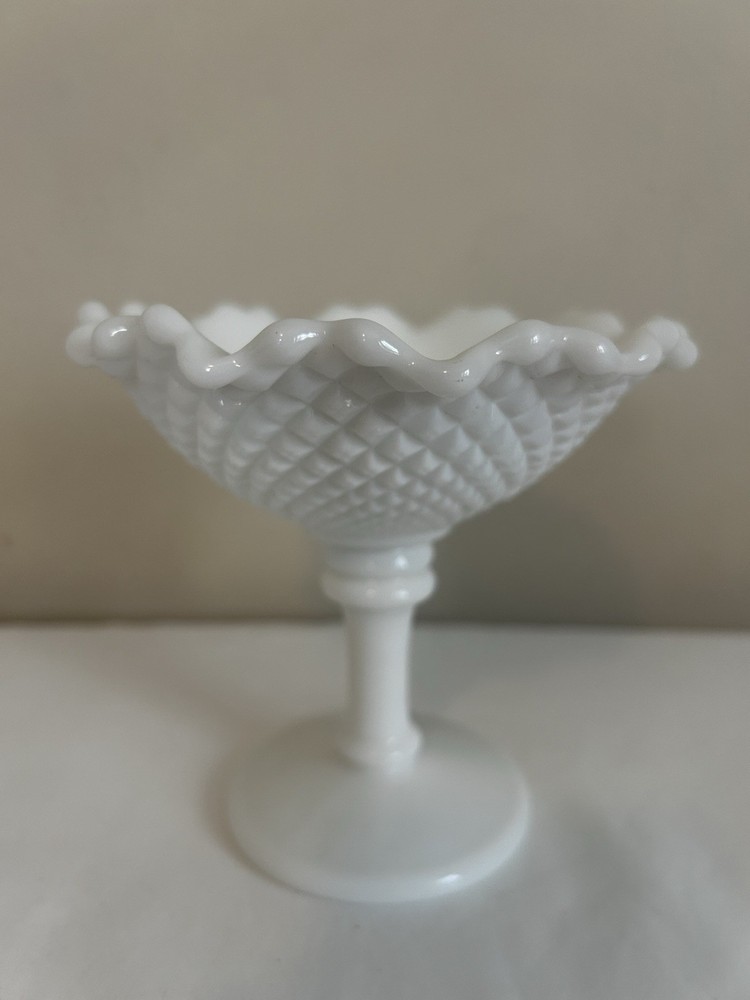 The Westmoreland Milk Glass Diamond Point Hobnail Ruffled Edge Footed Compote is a vintage decorative collectible made in the United States post-1940. This elegant piece features a white milk glass material with a unique diamond point hobnail design and ruffled edge detail. The footed compote adds a touch of sophistication to any space and is a sought-after collectible for those who appreciate vintage decor.