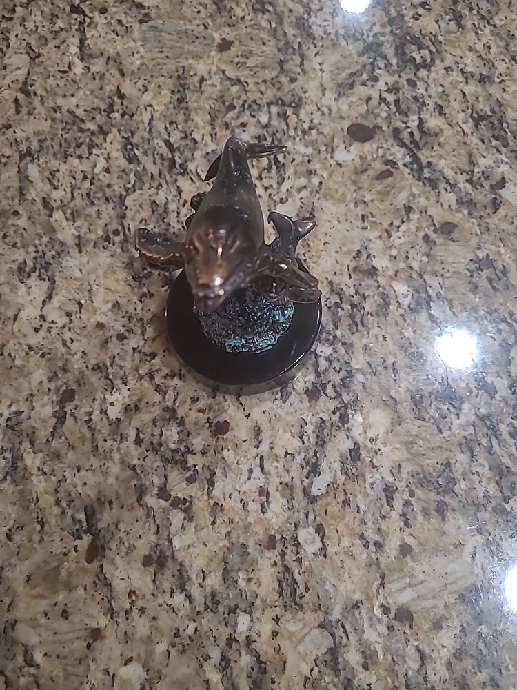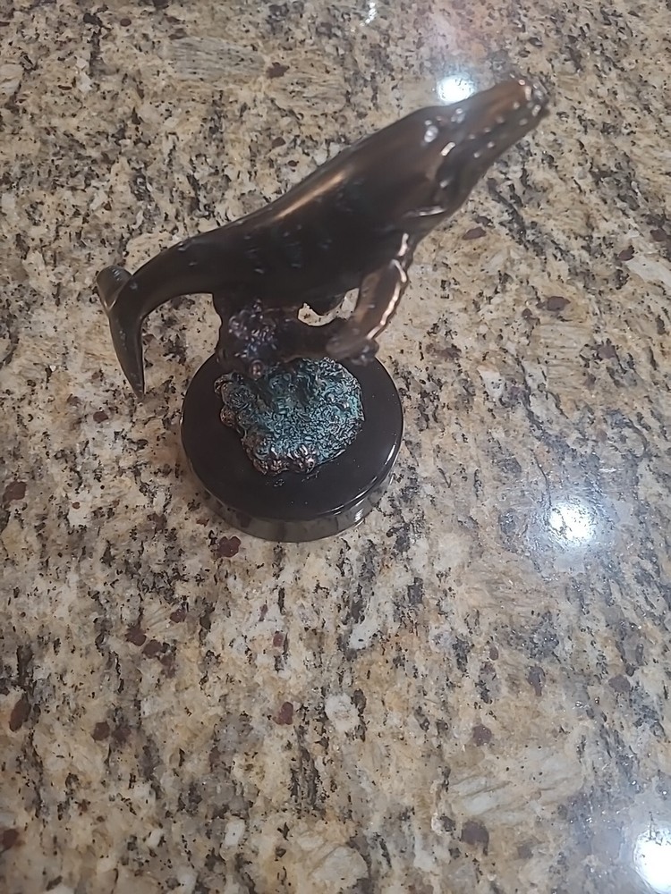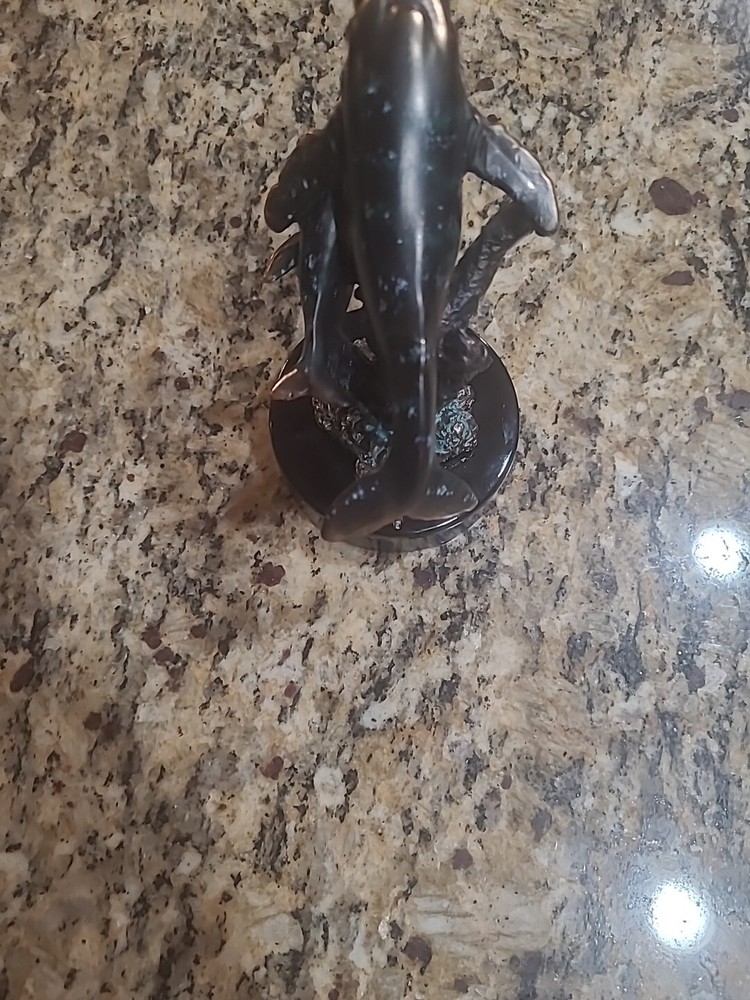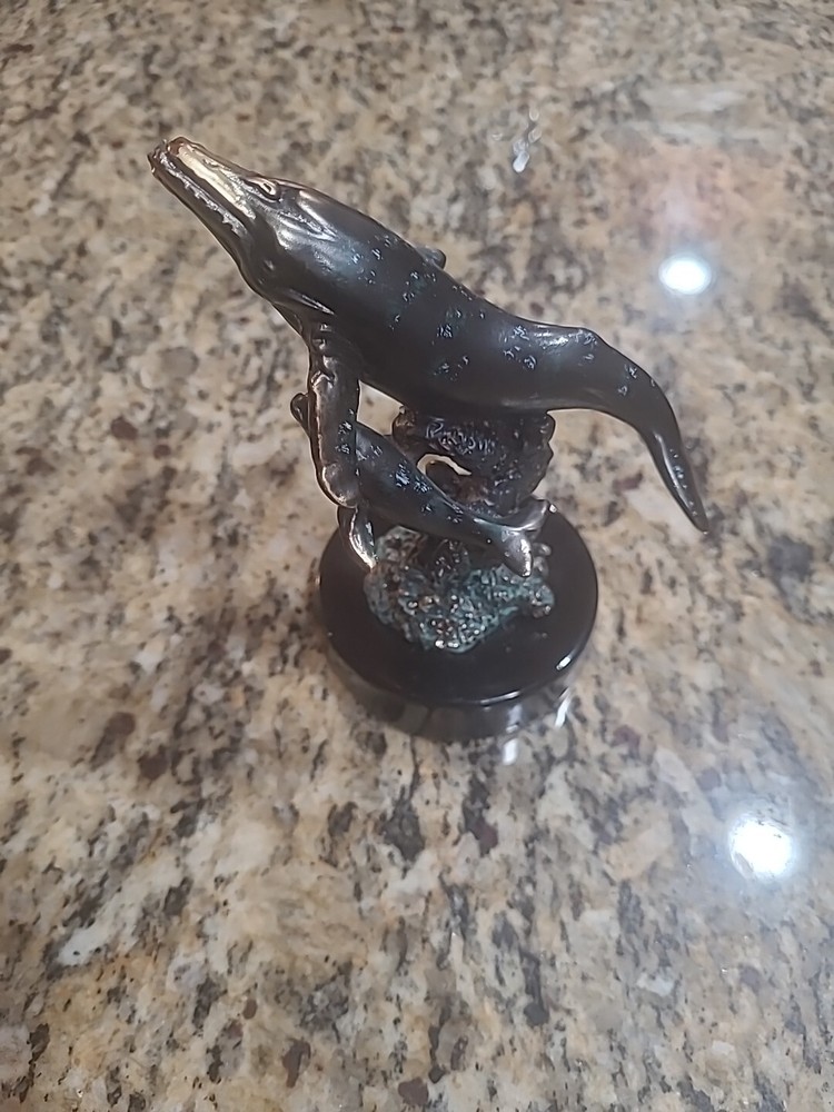 The "Whale And Baby" sculpture is an Art Deco style bronze statue depicting a whale swimming alongside its baby. This figurine beautifully captures the theme of animals in a graceful and elegant manner. The intricate details and craftsmanship of this sculpture make it a stunning piece of art that would be a lovely addition to any art collection or as a focal point in a room.