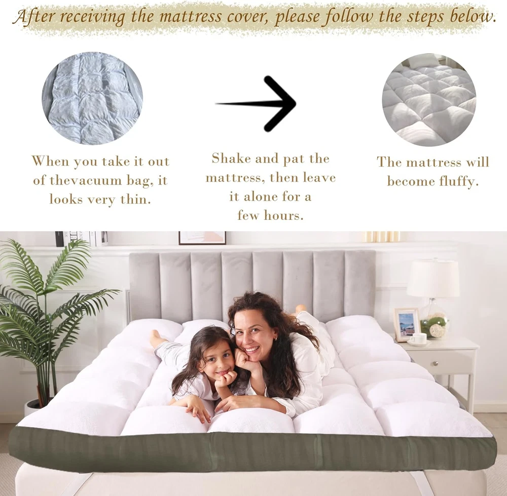 1.???SOFT & COMFORTABLE???: With 3 inches thick memory foam filling, you can sleep deeper on this mattress. Perfect for side, back or stomach sleepers. Once you sleep on it, you'll notice the difference. 3.???Anti-slip Bottom???Anti-slip bottom to prevent sliding and 4 stable anchor elastic straps ensure a secure fit, keep it at the place no matter how you toss or turn on bed. 4.???BOX QUILTED DESIGN & SOFT FILLING???: The unique box quilting design can fix the padding in each box, which is not easy to shift, providing sufficient support for your body and making you feel refreshed every morning when you wake up. 5.???100% Customer Satisfaction??????Please leave it several hours before use for fluffier. We provide 100% satisfaction after sale service, if there is anything wrong with your order, just feel free to contact us, we will make every effort to solve your problem. 2.???Warm & Breathable???: The mattress topper surface features good ventilation to help regulate temperature. It will wick away sweat and keep you warm and dry. Reduce hot feeling caused by memory foam mattress or foam mattress topper.