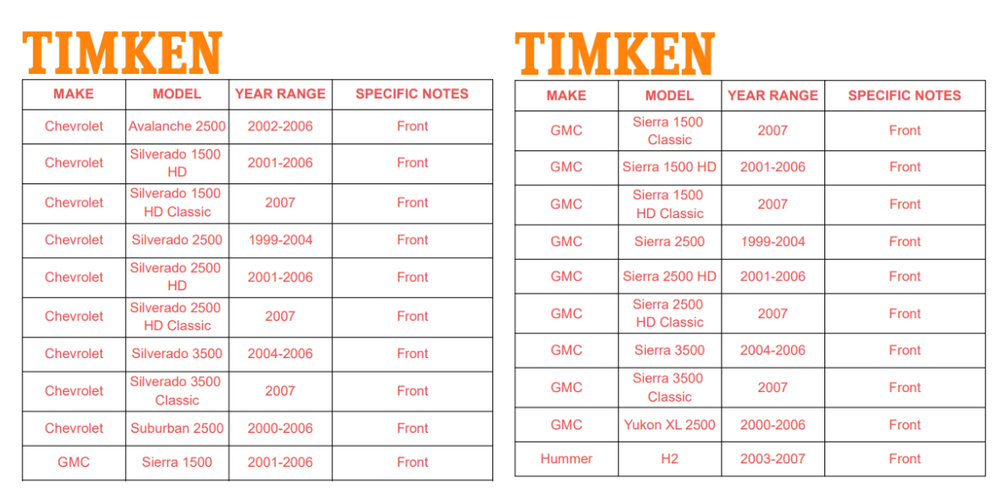 Door Handle Hub Bearing&Accessories Air Filter Brake Control Arms Water Pump Brake Rotor Store Categories Door Handle Window Switch Hub Bearing&Accessories Air Filter Car Emblem Carburetor Accessory Brake Tools Control Arms LED headlight Water Pump Leveling Lift Kit Brake Rotor AC Compressor Other 4WD Front Timken Wheel Bearing and Hub for Chevy Silverado GMC Sierra 1500 2500 Items Description TIMKEN Front Wheel Hub and Bearing Assembly Fits Driver or Passenger Side Kit Includes: 1x Front Wheel Hub & Bearing Assembly - SP580310 Hub Specifications Position: Front Left and Right Drive: 4WD Lugs: 8 Bolts ABS on Hub: YES ***WARNING*** Only for use with 4-Wheel Drive (4WD / 4x4) Models! Installation on 2-Wheel Drive (2WD) vehicle will cause bearing failure! MAKE MODEL YEAR RANGE SPECIFIC DETAILS CHEVROLET AVALANCHE 2500 2002 - 2006 **4WD / 4x4 MODELS ONLY** CHEVROLET SILVERADO 1500 2001 - 2006 **4WD / 4x4 MODELS ONLY** CHEVROLET SILVERADO 1500 HD 2001 - 2003/2005 - 2006 4WD Heavy Duty Suspension ONLY CHEVROLET SILVERADO 1500 HD CLASSIC 2007 4WD Heavy Duty Suspension ONLY CHEVROLET SILVERADO 2500 1999 - 2004 **4WD / 4x4 MODELS ONLY** CHEVROLET SILVERADO 2500 HD 2001 - 2006 4WD Heavy Duty Suspension ONLY CHEVROLET Silverado 2500 HD Classic 2007 4WD Heavy Duty Suspension ONLY CHEVROLET SILVERADO 3500 2001-2003 **4WD / 4x4 MODELS ONLY** CHEVROLET SILVERADO 3500 2004 - 2006 4WD; with 9900 (lb) Gross Vehicle Weight (GVW) CHEVROLET Silverado 3500 Classic 2007 4WD Heavy Duty Suspension ONLY CHEVROLET SUBURBAN 2500 2000 - 2006 **4WD / 4x4 MODELS ONLY** GMC SIERRA 1500 2001 - 2006 **4WD / 4x4 MODELS ONLY** GMC SIERRA 1500 HD 2001 - 2003 4WD Heavy Duty Suspension ONLY GMC SIERRA 1500 HD 2005 - 2006 4WD Heavy Duty Suspension ONLY GMC SIERRA 1500 HD CLASSIC 2007 4WD Heavy Duty Suspension ONLY GMC SIERRA 2500 1999 - 2004 **4WD / 4x4 MODELS ONLY** GMC SIERRA 2500 HD 2001 - 2006 4WD Heavy Duty Suspension ONLY GMC Sierra 2500 HD Classic 2007 4WD Heavy Duty Suspension ONLY GMC SIERRA 3500 2001-2003 **4WD / 4x4 MODELS ONLY** GMC SIERRA 3500 2004-2006 4WD; with 9900 (lb) Gross Vehicle Weight (GVW) GMC SIERRA 3500 CLASSIC 2007 **4WD / 4x4 MODELS ONLY** GMC YUKON XL 2500 2000 - 2006 **4WD / 4x4 MODELS ONLY** HUMMER H2 2003 - 2007 **4WD / 4x4 MODELS ONLY** Payment PayPal Preferred, Credit or debit card through PayPal Delivery Details All Items will be shipped to buyer's Paypal confirmed Address. We only ship to the confirmed address provided by PayPal. Please make sure your address in PayPal matches the shipping address. Please make sure your PayPal address is up-to-date. All items will be shipped within 24 business hours upon receipt of payment (except Saturday and Sunday). If you do not receive your item on time, please contact us immediately for further assistance. We will track the shipment and get back to you in 24-48h with a reply. Terms of sales Please leave us a good rating after you have received the item and are happy with our transaction. If there are any issues, please contact me first before leaving a neutral, negative or 5 star rating. Customer Satisfaction is our top priority!! We promise we can make you happy if you give us a fair chance. Thanks and happy bidding! About us Yusinauto is a leading company in the range of automotive parts , battery products , Door Handle, Window Switch, Hub bearing. we are an America company , Our Products are manufactured in TS16949 or ISO9001 certified facilities. We enjoy providing the highest quality, lowest price, best service on the market. We hope we can give you amazing shopping experience in our online store Payment | Shipping | Return policy | About us Copyright © 2020, yusinauto All Rights Reserved