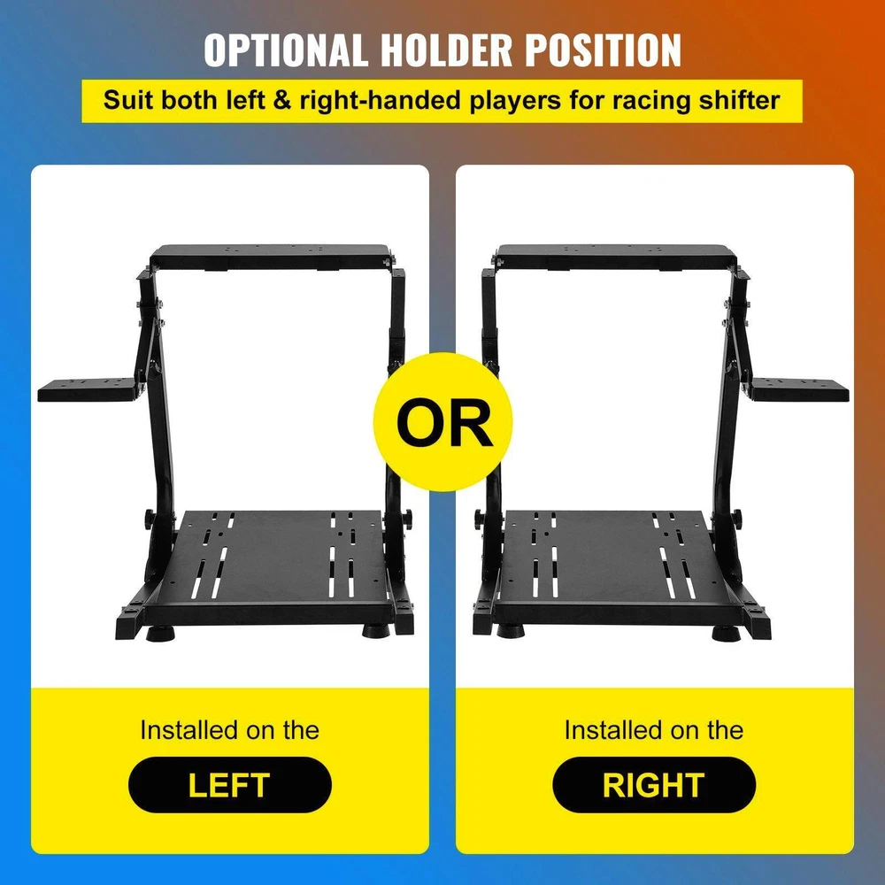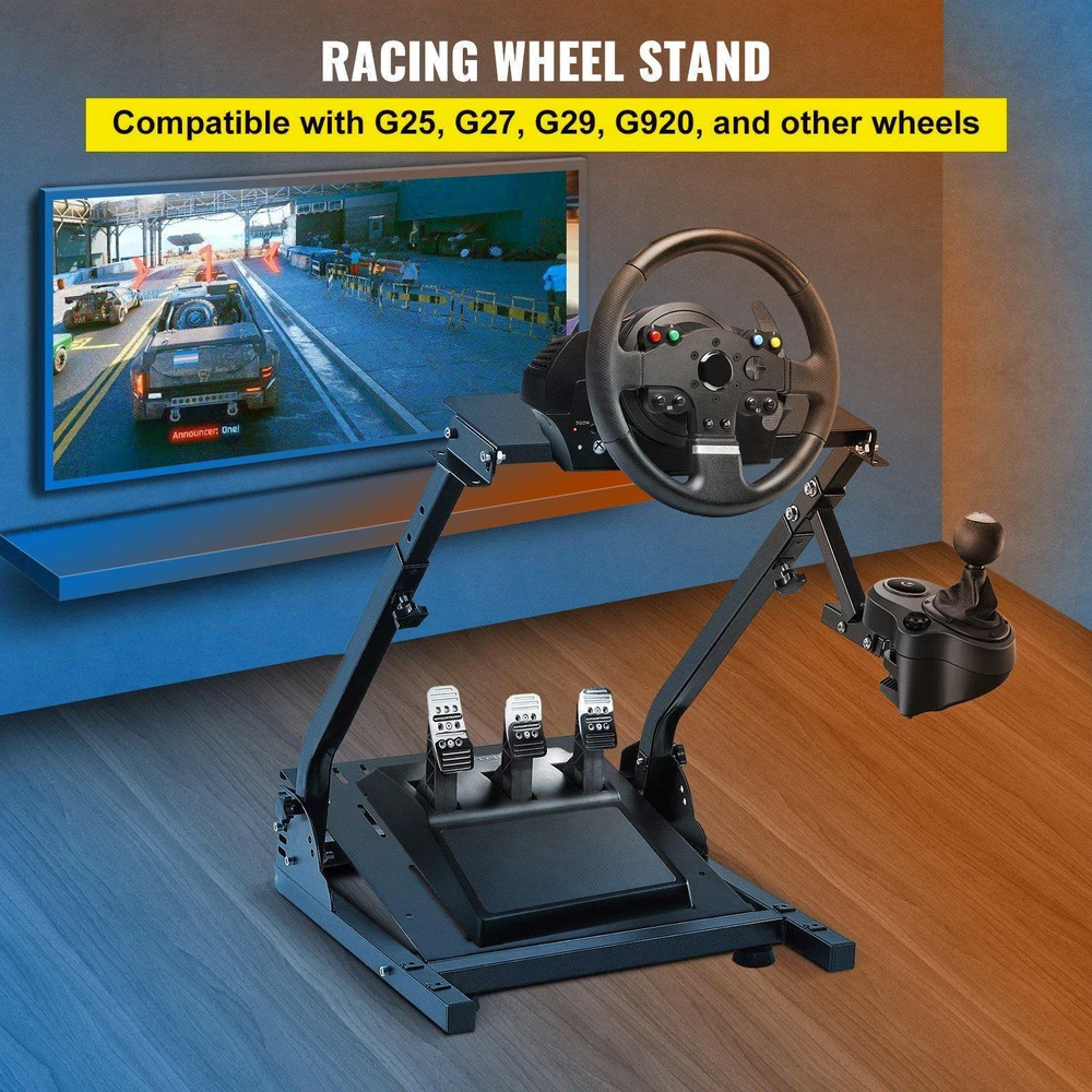 Default:Default This universally designed sim cockpit is compatible with, Fanatec, Thrustmaster, CSR wheels, pedals, and shifters. The cockpit allows players of different heights to use, featuring a sturdy carbon steel structure and entirely adjustment. As a result, you can enjoy a more comfortable and flexible game experience. It also can be folded for space-saving storage. The wheel, shifter, and pedals are NOT included. High Compatibility Fully Adjustable Durable Wheel Stand Foldable & Compact Optional Holder Position is a leading brand that specializes in equipment and tools. Along with thousands of motivated employees, is dedicated to providing our customers with equipment & tools at incredibly low prices. Today, has occupied markets of more than 200 countries with 10 million plus global members. Why Choose ? Premium Quality Incredibly Low Prices Fast & Secure Delivery 30-Day Free Returns 24/7 Attentive Service Wide Compatibility This wheel stand is compatible with G25, G27, G29, G920, Thrustmaster, Fanatec, and CSR pedals on the market with pre-drilled holes. Other wheels also can be clamped on the holder. Flexible Height & Angle The steering wheel stand is adjustable in angle, tilt, and height (27"-31.5"/68.5-80 cm), allowing players of different sizes to use it. In addition, you can tune your wheel and pedal to any ergonomic position. Sturdy Carbon Steel Our wheel stand is made of solid carbon steel, with maximum durability to prevent falling off. Besides, its sturdy frame gives you a reliable game experience in-lasting use. Folding in Seconds This wheel stand folds up fast and reduces to a small size without disassembling the device. Its foldable and compact design is convenient for you to put under the sofa or in the corner. Optional Shifter Mounting The gear shifter holder on the gaming wheel stand can be flexibly mounted on either side. So whether you drive left or right, you can use our bracket to enjoy sim games. Non-Skid Rubber Pads There are four non-skid rubber pads at the simulator cockpit's bottom, holding the floor firmly and keeping the bracket stable. So you never need to worry about the damage to the floor. Specifications Model: G920ZDJ Material: Carbon Steel Adjustable Height: 27"-31.5"/68.5-80 cm Base Size (L x W): 18.9" x 22.6"/48 x 57.5 cm Wheel Holder Size (L x W): 16.5" x 5.9"/42 x 15 cm Shifter Holder Size (L x W): 6.3" x 4.7"/16 x 12 cm Folding Size (L x W x H): 18.9" x 30.3" x 7.5"/48 x 77 x 19 cm Product Weight: 24.9 lbs/ 11.3 kg Compatible Model Thrustmaster T300RS, TX F458, T500RS, T3PA /GT) pedals Fanatec Clubsport & CSR pedals Package Content 1 x Steering Wheel Stand 4 x Rubber Pads 4 x Hand Knob Tightening Screws 4 x Straps 1 x Open-Ended Spanner 2 x Allen Wrenches 1 x Screws Kit