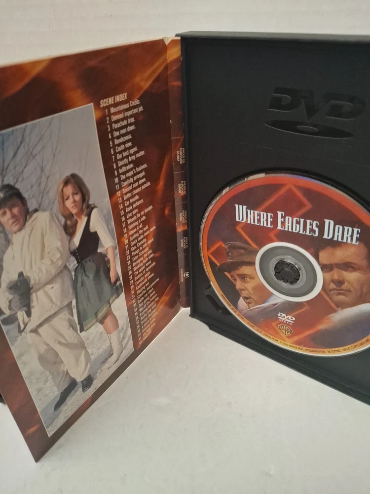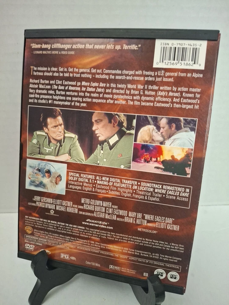 Studio:Warner Home VideoMovie/TV Title:Where Eagles DareUPC:0883929107605Actor:Clint EastwoodRating:PGProducer:Elliott Kastner, Jay PetersonFormat:DVDRun Time:155 min.Director:Brian G. HuttonSubtitle Language:English, French, SpanishSub-Genre:War-World War IIgtin13:0883929107605Release Year:1968Genre:War DramaLanguage:English, French