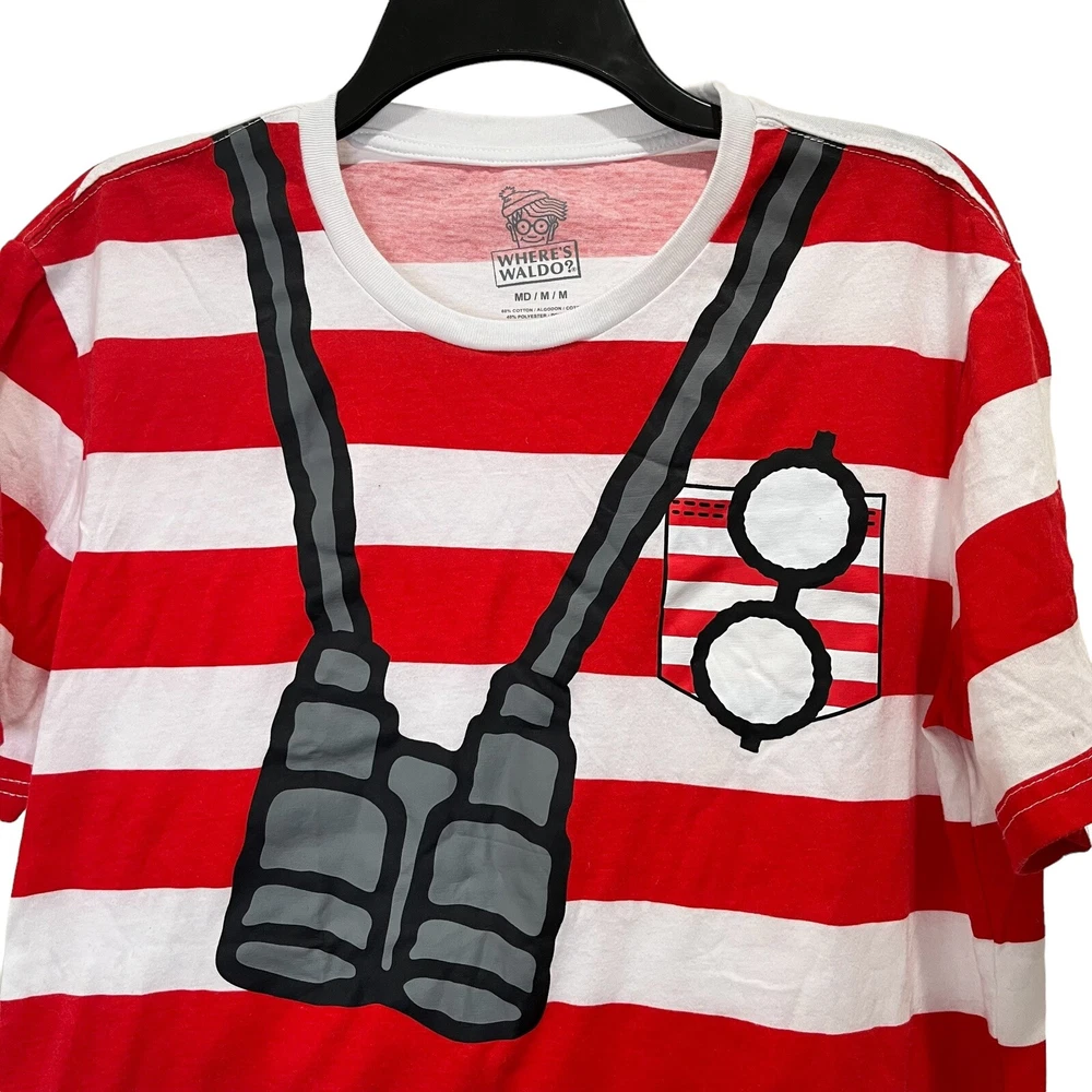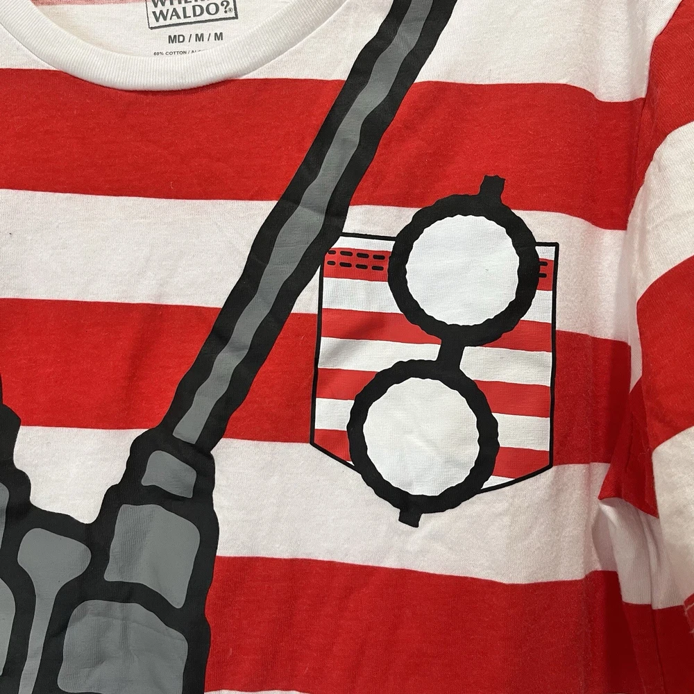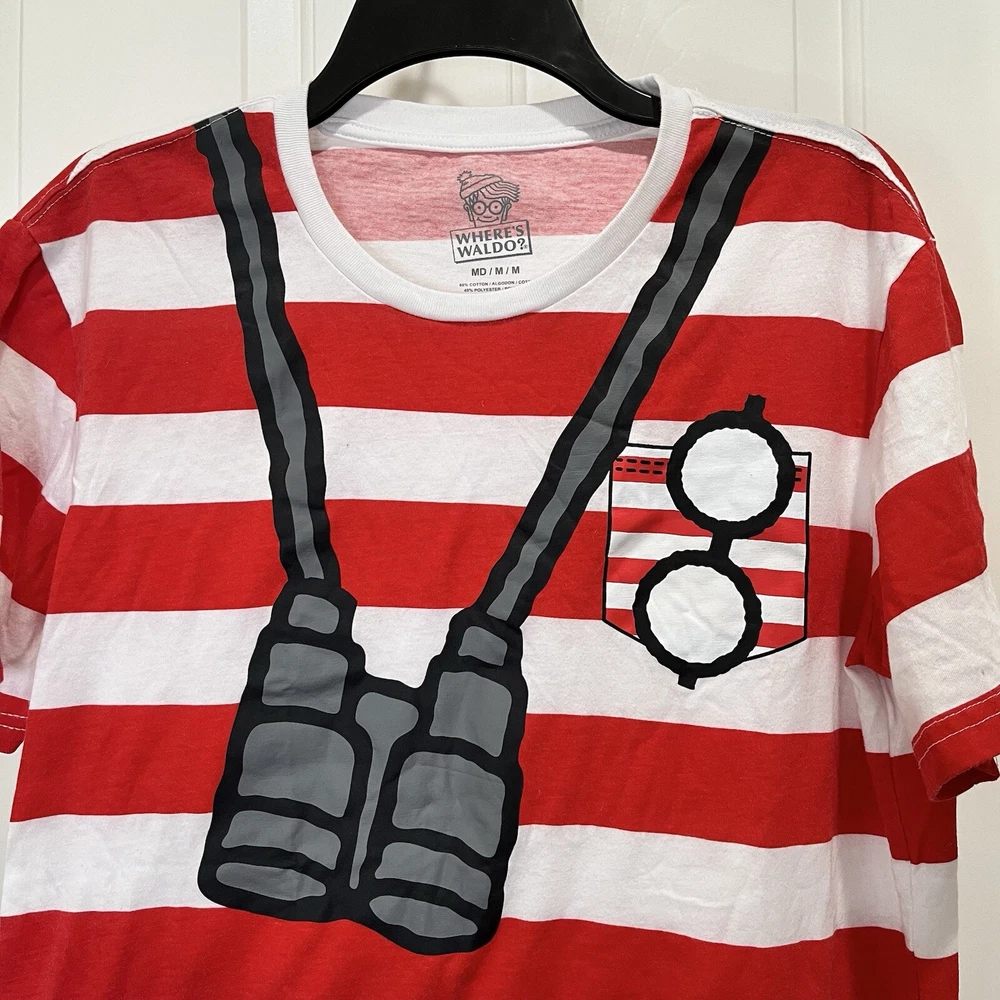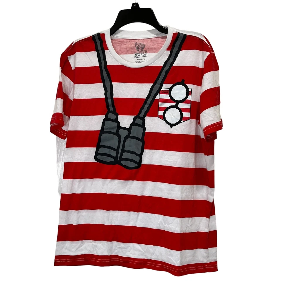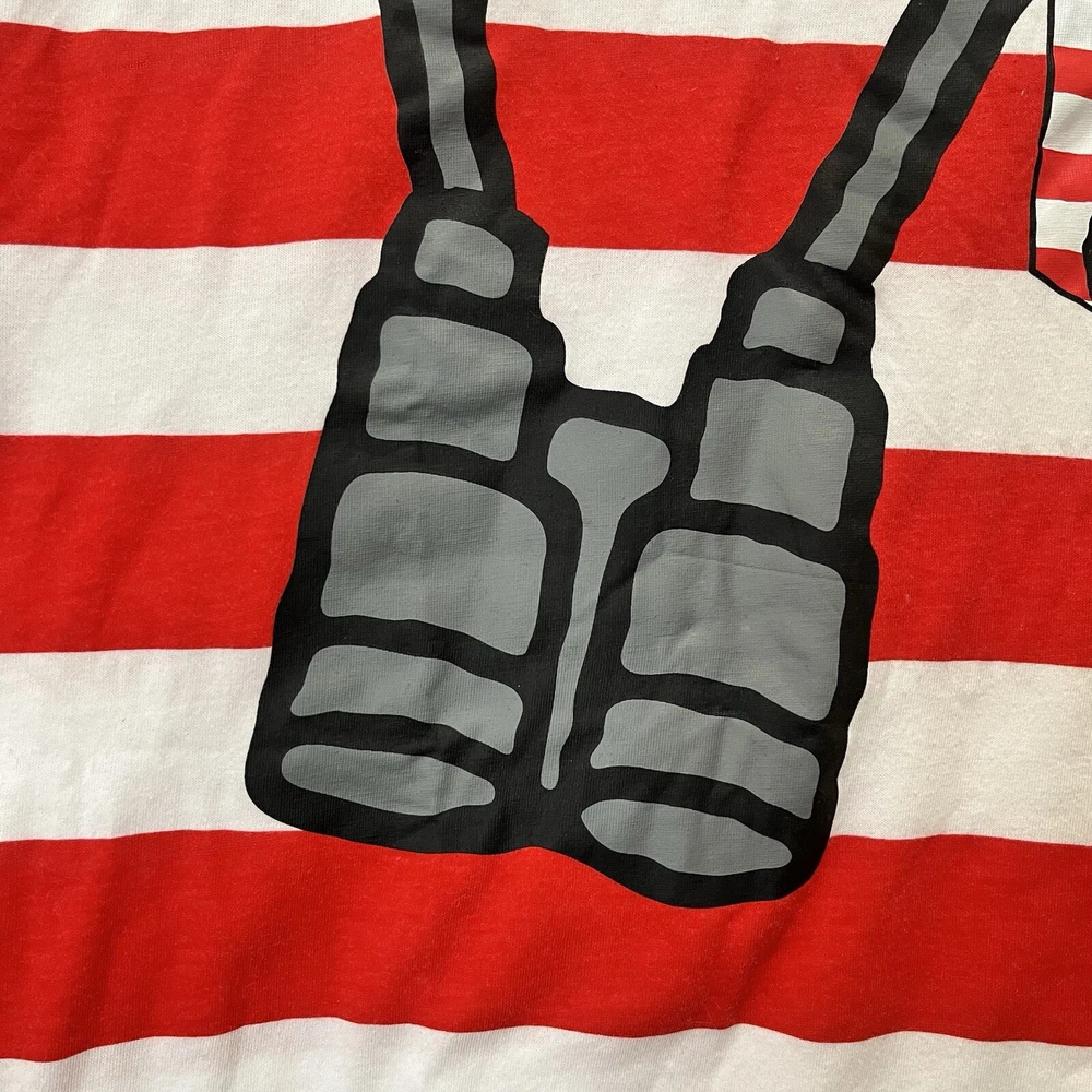 Where’s Waldo T-shirt Red and white striped shirt Adult size medium Has binoculars and glasses silkscreened on the front of a red and white striped t-shirt Cotton polyester blend Pit to pit 20” Length 27” Adult Sz medium Halloween costume