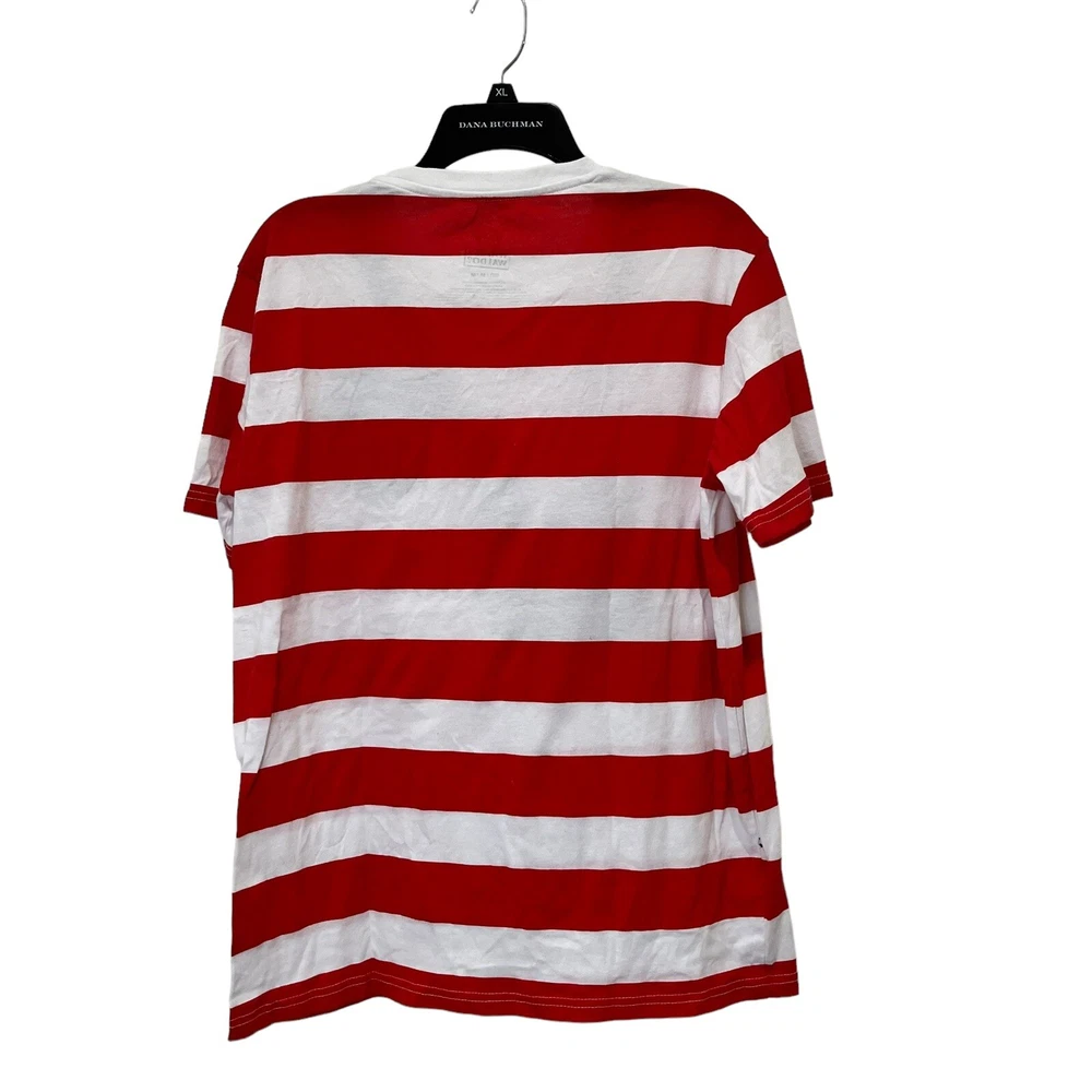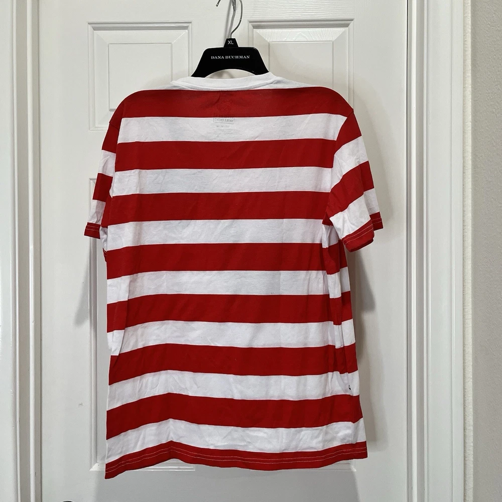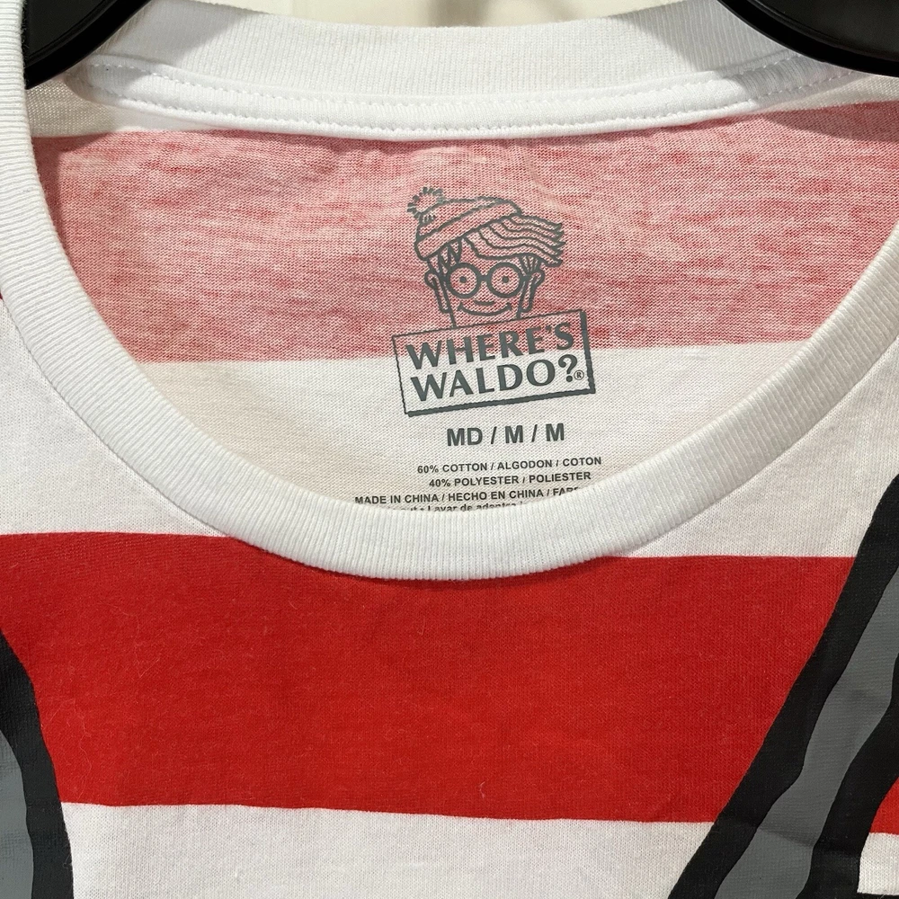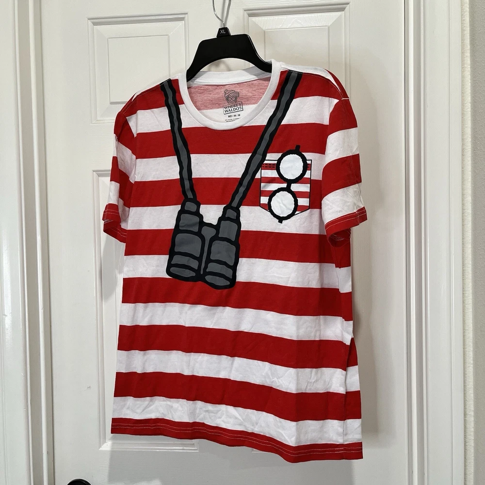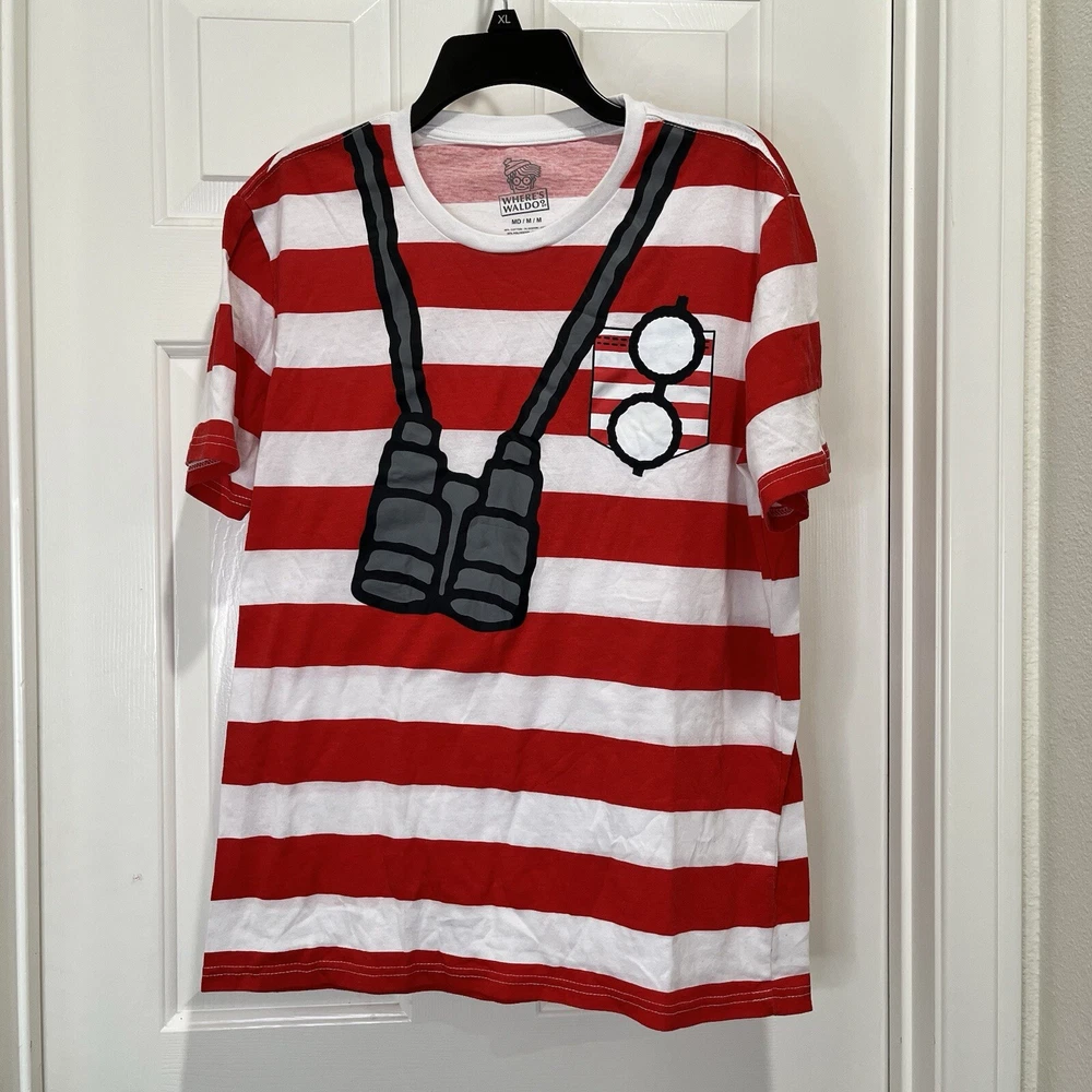 Where’s Waldo T-shirt Red and white striped shirt Adult size medium Has binoculars and glasses silkscreened on the front of a red and white striped t-shirt Cotton polyester blend Pit to pit 20” Length 27” Adult Sz medium Halloween costume