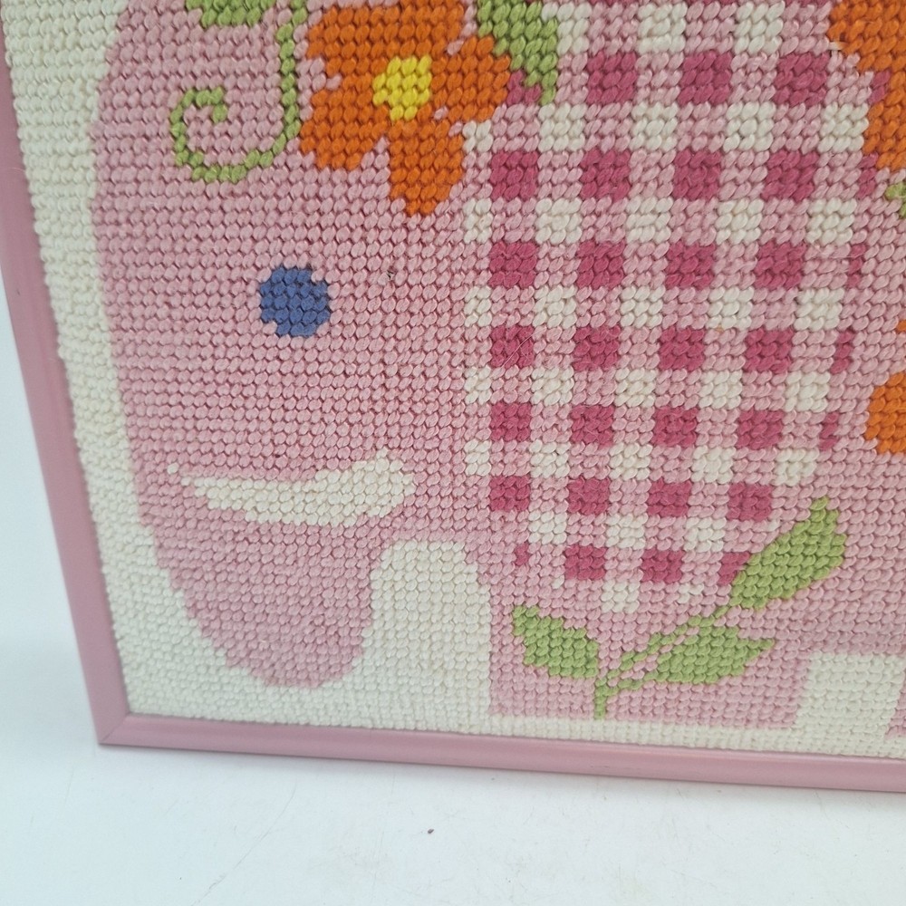 Add a touch of whimsy to your child's room with this framed pink elephant needlepoint art, featuring vibrant orange flowers and charming gingham ears. Perfect for nursery decor. The pink frame is metal. • Whimsical pink elephant design • Orange floral accents • Gingham patterned ears • Framed for easy hanging • Ideal for nursery or child's room decor Size: Unisex Kids 11.5" x 8.5" Condition: Pre-Owned Good No stains or tears Thank you for shopping with Gardenspire. All items are carefully packaged for maximum protection during shipping. We ship on Mondays, Wednesdays and Fridays. We had select all of our items from a variety of sources. While our home is smoke free, we cannot guarantee that these items originated from a smoke free environment. We do our best to inspect each item and to accurately describe any and all blemishes. However, we are human and we sometimes make mistakes. Please do reach out to us if you are unsatisfied with your purchase so we can work with you to make it right. We offer 30 day refunds. Please check out our store for more great items.