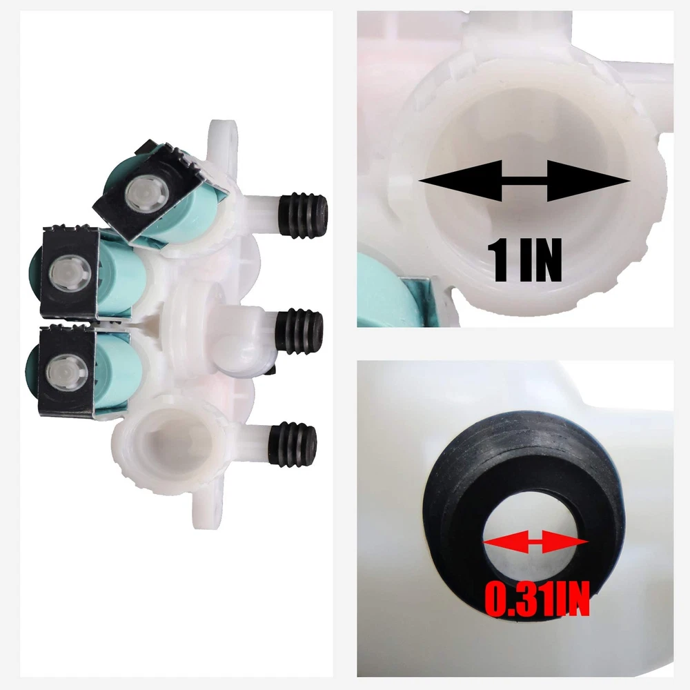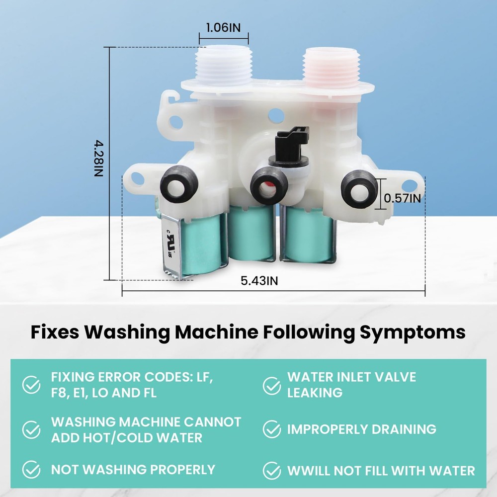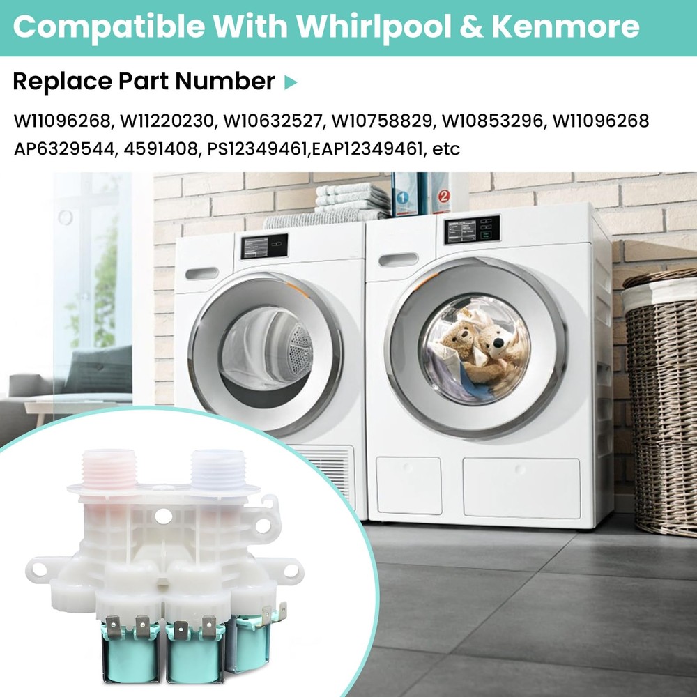 W11096268 (W11220230) Water inlet valve This water inlet valve part number W11096268(W11220230) is for washers. Water inlet valve W11096268(W11220230) controls the water flow into the washer. Package Includes: 1 × W11096268 (W11220230) Water inlet valve Specifications: 120V 60Hz Fixes the following symptoms: Fixes whirlpool error codes: E1 F8 FL LF LO etc. The washer not to fill properly or not fill at all etc. Directly Replaces: W11220230 W10632527 W10758829 W10853296 W11096268 AP6329544 4591408 PS12349461 EAP12349461 etc. Fits Brands and Compatible Models: whirlpool & Kenmore etc. Compatible Models:7MWTW7000EW1 7MWTW7300EW0 7MWTW7300EW1 MVW6200KW0 MVW6230HC0 WTW6120HC0 WTW6120HC1 WTW6120HW0 WTW7000DW0 WTW7000DW1 WTW7000DW2 WTW7000DW3 WTW7000DW4 WTW7040DW0 WTW7040DW1 WTW7040DW2 WTW7120HC0 WTW7300DC0 WTW7300DW0 WTW7300DW1 WTW7300DW2 WTW8000DW0 WTW8000DW1 WTW8000DW2 WTW8000DW3 WTW8000DW4 WTW8000DW5 WTW8040DW0 WTW8040DW1 WTW8040DW2 WTW8040DW3 WTW8040DW4 etc. Please Note: 1.Unplug the washer and shut off the water supply before installing this part. Wear work gloves to protect your hands. 2.The brands mentioned above are their own and are mentioned here only to prove compatibility. 3. If you are unsure our replacement part will fit your appliance model, you can ask in Customer questions & answers section. W11096268 (W11220230) water inlet valve:W11096268 (W11220230) water inlet valve controls the water flow into the washer.W11096268 (W11220230) water inlet valve has two threaded ports to control hot and cold water respectively.(120V 60Hz) Directly Replaces:W11220230 W10632527 W10758829 W10853296 W11096268 AP408 PS12349461 EAP12349461 etc. Solve The Following Problems:Compatible with whirl-pool ken-more error codes: E1 F8 FL LF LO etc. The washer not to fill properly or not fill at all etc. Fits Brands and Compatible Models :Compatible with whirl-pool ken-more etc.Compatible Models:7MWTW7000EW1 7MWTW7300EW0 7MWTW7300EW1 MVW6200KW0 MVW6230HC0 WTW6120HC0 WTW6120HC1 WTW6120HW0 WTW7000DW0 WTW7000DW1 WTW7000DW2 WTW7000DW3 WTW7000DW4 WTW7040DW0 WTW7040DW1 WTW7040DW2 WTW7120HC0 WTW7300DC0 WTW7300DW0 WTW7300DW1 WTW7300DW2 WTW8000DW0 WTW8000DW1 WTW8000DW2 WTW8000DW3 WTW8000DW4 WTW8000DW5 WTW8040DW0 WTW8040DW1 WTW8040DW2 WTW8040DW3 WTW8040DW4 etc. Azdele Professional Customer Service:I hope our W11096268 (W11220230) water inlet valve can solve your problem.If you need any assistance, please contact our 24-hour online service team. Azdele continually provides the warm shopping experience for all customers.We will show you a sincere attitude and satisfactory solution.