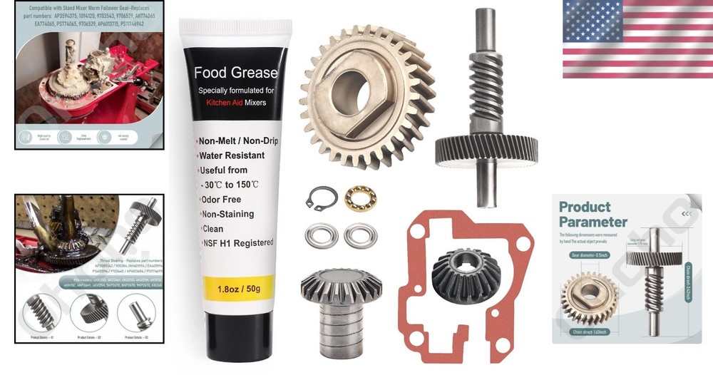 Whirlpool/Kitchenaid Worm Gear Replacement Kit with Thrust Bearing & Grease ‹ › ‹ › ‹ › ‹ › ‹ › ‹ › ‹ › ‹ › ‹ › ‹ › Whirlpool/Kitchenaid Worm Gear Replacement Kit Complete with Thrust Bearing & Grease Compatibility: Compatible with Whirlpool Stand Mixers. Replaces Thrust Bearing Part Numbers: AP3085342, 905384, AH401594, EA401594, PS401594, 9703445, AP6013684, PS11746911. Mixer Gear Part Numbers: AP3854320, 1094181, 9703446, 9703699, 9706590, 9706769, 9706770, AH986966, EA986966, PS986966, 9709231, AP6013785, PS11747012. Compatible Stand Mixer Models Include: 4KB25G, 4KD2661, 4KG25G, 4KG25H, 4KN15C, 4KN15E, 4KP26M1, 4KV25H and many more. Features: Complete replacement kit including thrust bearing and grease ensures optimal performance of your stand mixer. Crafted with precision, guaranteeing a perfect fit for compatible stand mixer models. Restore your stand mixer to its full capacity and enhance your culinary creations. Benefits: Extend the life of your mixer with high-quality replacement parts. Easy installation process will have your mixer running smoothly in no time. Restore functionality and efficiency, allowing you to create your favorite recipes effortlessly. Why Choose Our Worm Gear Replacement Kit? If you're in need of a reliable and effective solution to keep your Whirlpool Stand Mixer performing at its best, look no further. This Worm Gear Replacement Kit, complete with thrust bearing and grease, promises durability and a precise fit to keep your mixing at peak efficiency. Compatible with a wide range of models, this kit is the ultimate tool for any home chef who relies on their stand mixer for culinary creativity. Enhance your cooking experience—order your Whirlpool/Kitchenaid Worm Gear Replacement Kit today and ensure your mixer is ready to tackle any recipe with confidence! Shipping Free & Fast Shipping - We offer free shipping to most of the USA with a normal delivery time of 3-7 days. However, due to the current situation, additional delivery time (up to 3 weeks) may be required for some items. Alternative Carriers - We may use alternative carriers (e.g. USPS, FedEx, UPS, etc.) to ensure your package arrives safely and on time. Due to the use of multiple carriers, we are unable to provide a tracking number automatically. Handling Time - Orders are processed and shipped within 1-2 business days of receiving cleared payment. Shipping Restrictions - Shipping to Alaska, Hawaii, Puerto Rico, Guam, and other US territories may incur shipping charges or delivery restrictions. Please contact us before ordering, or your order can be refunded/cancelled. State Restrictions - There may be restrictions based on your state of purchase. For example, certain items may not be shipped to California due to state regulations. Contact for Tracking Updates - If you require tracking updates or have any concerns about the delivery of your order, please feel free to contact us, and we will be happy to assist you. Return 30-Day Hassle-Free Returns - We want you to be completely satisfied with your purchase. If you are not, you can return the item within 30 days of receiving it for a full refund or exchange. Easy Return Process - To start a return, simply contact us and we will provide you with a prepaid return shipping label and detailed instructions. Restocking Fee - There are no restocking fees for returns. However, the buyer is responsible for return shipping costs if the return is not due to a seller's error. Refund Processing Time - Refunds will be processed within 5 business days of receiving the returned item in its condition. Payment We accept all major credit cards, PayPal, and Apple Pay for your convenience. Your payment information is secure and encrypted to ensure a safe and seamless transaction. Please complete your payment within 3 days of purchase to avoid any delays in shipping. Feedback Your feedback is extremely important to us. We strive to provide the best products and customer service possible. If you are satisfied with your purchase, please take a moment to leave us a positive review. If you have any concerns or issues with your order, please contact us before leaving negative feedback. We are committed to resolving any problems and ensuring your satisfaction. Contact Us If you have any questions or concerns, please feel free to out to our customer support team. You can contact us through the eBay messaging system. We are available Monday to Friday, 9:00 am to 5:00 pm EST, and we will do our best to respond to your inquiry within 24 hours. Buy it now and enjoy a pleasant shopping experience! Unit Quantity: 1 Components Included: Worm Gear,Snap Ring,Grease,Thrust Bearing Appliance Uses: Mixing,Baking Appliance Capabilities: Replace,Support Features: Compatible,Replacement Parts,Easy Installation Model: Whirlpool Kitchenaid Number of Settings/Programs: 1 Number of Items: 1 Number of Speeds: 1 Color: Black Power Source: Manual Type: Worm Gear Material: Metal Item Weight: 1.15 lbs Unit Type: lb