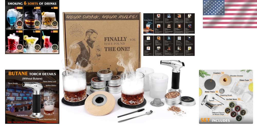 Whiskey Cocktail Smoker Kit with Torch and 6 Wood Chips - Perfect Gift for Him ‹ › ‹ › ‹ › ‹ › ‹ › ‹ › ‹ › ‹ › Whiskey Cocktail Smoker Kit with Torch and 6 Wood Chips The Perfect Gift for Him What's Inside: Torch Lighter Six Different Flavors of Wood Chips Spoon & Cleaning Brush Two Elegant Glass Cups with Coasters Two Metal Filters Two Ice Ball Molds Handcrafted Wooden Smoker made from Quebec Oak Please note: Butane and whiskey are not included. Your Drink, Your Rules: Unleash your creativity with our whiskey smoker, perfect for crafting unique, naturally flavored drinks. Infuse your cocktails, wine, coffee, cheese, dried fruits, BBQ, and more, tailoring flavors to your exact palate. Whether preparing for a cozy night in or hosting an outdoor picnic, our smoke infuser sets the perfect ambiance for unforgettable gatherings. An Unforgettable Gift: Searching for the ideal gift for a loved one? This Whiskey Cocktail Smoker Kit makes an impressive New , Thanksgiving, or Valentine's gift that’s sure to steal the spotlight at any party. Break away from the ordinary and surprise your boyfriend, father, husband, or son with the perfect blend of fun and flavor. While everyone else may opt for whiskey, you stand out by giving the gift of experience! Savor a Smoked Old Fashioned: Ignite your senses with our Cocktail Smoker Kit — a warm embrace of tender, smoky flavors. Cold smoke your favorite beverages and let the aromatic essence of natural wood envelop your drink for a truly sophisticated experience. Ideal for whiskey aficionados and those who appreciate the art of pairing with cigars. Effortless Enjoyment: A hand-held smoker is simple to operate. Just prepare your smoking gun, mix your drink, ignite the wood chips, and apply smoke to your cocktails. After a few moments, revel in the rich flavors that bring your beverages to life. *Note: The torch is butane-free and requires filling before the first use.* Why Choose Our Whiskey Cocktail Smoker Kit? Transform your drinking experience and impress your guests with the endless possibilities of flavor. This comprehensive kit offers unparalleled quality, versatility, and charm, making it a must-have for any cocktail enthusiast. Elevate your celebrations — order your Whiskey Cocktail Smoker Kit today! Shipping Free & Fast Shipping - We offer free shipping to most of the USA with a normal delivery time of 3-7 days. However, due to the current situation, additional delivery time (up to 3 weeks) may be required for some items. Alternative Carriers - We may use alternative carriers (e.g. USPS, FedEx, UPS, etc.) to ensure your package arrives safely and on time. Due to the use of multiple carriers, we are unable to provide a tracking number automatically. Handling Time - Orders are processed and shipped within 1-2 business days of receiving cleared payment. Shipping Restrictions - Shipping to Alaska, Hawaii, Puerto Rico, Guam, and other US territories may incur shipping charges or delivery restrictions. Please contact us before ordering, or your order can be refunded/cancelled. State Restrictions - There may be restrictions based on your state of purchase. For example, certain items may not be shipped to California due to state regulations. Contact for Tracking Updates - If you require tracking updates or have any concerns about the delivery of your order, please feel free to contact us, and we will be happy to assist you. Return 30-Day Hassle-Free Returns - We want you to be completely satisfied with your purchase. If you are not, you can return the item within 30 days of receiving it for a full refund or exchange. Easy Return Process - To start a return, simply contact us and we will provide you with a prepaid return shipping label and detailed instructions. Restocking Fee - There are no restocking fees for returns. However, the buyer is responsible for return shipping costs if the return is not due to a seller's error. Refund Processing Time - Refunds will be processed within 5 business days of receiving the returned item in its condition. Payment We accept all major credit cards, PayPal, and Apple Pay for your convenience. Your payment information is secure and encrypted to ensure a safe and seamless transaction. Please complete your payment within 3 days of purchase to avoid any delays in shipping. Feedback Your feedback is extremely important to us. We strive to provide the best products and customer service possible. If you are satisfied with your purchase, please take a moment to leave us a positive review. If you have any concerns or issues with your order, please contact us before leaving negative feedback. We are committed to resolving any problems and ensuring your satisfaction. Contact Us If you have any questions or concerns, please feel free to out to our customer support team. You can contact us through the eBay messaging system. We are available Monday to Friday, 9:00 am to 5:00 pm EST, and we will do our best to respond to your inquiry within 24 hours. Buy it now and enjoy a pleasant shopping experience! Unit Quantity: 18 Set Includes: Spoon,Torch Lighter,Wood Chips,Cleaning Brush,Glass Cups,Coasters,Metal Filters,Ice Ball Molds,Wooden Smoker Material: Oak Features: Multifunctional,DIY,Infuser,Hand-held Smoker,Butane-Free,Easy to Operate Type: Cocktail Kit Color: Brown Number of Items in Set: 18 Occasion: All Occasions Unit Type: Unit