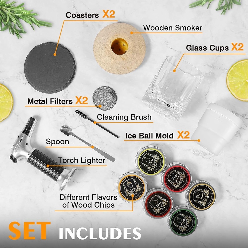 This whiskey smoker kit is a game-changer for cocktail lovers! The elegant wooden design and high-quality accessories make it feel luxurious. The torch works perfectly, and the variety of wood chips adds amazing smoky flavors to drinks. The included glass cups and ice molds are a nice touch—great for impressing guests. It’s well-crafted, easy to use, and makes an awesome gift for any whiskey enthusiast. Highly recommend for elevating home bartending!