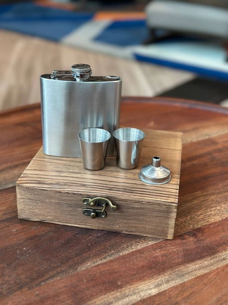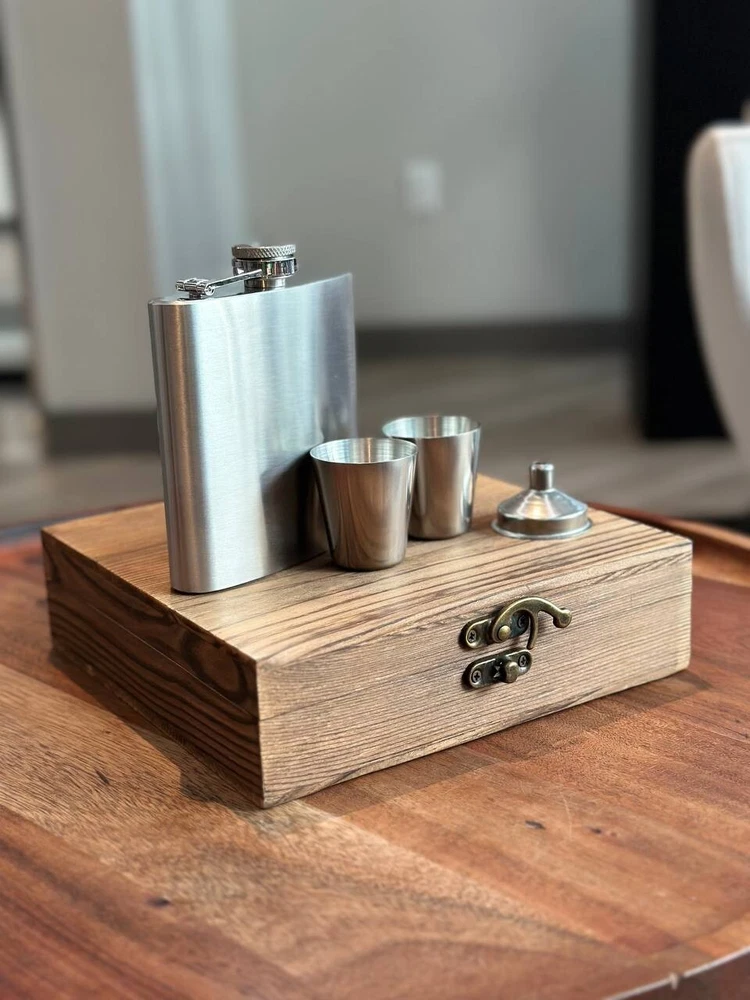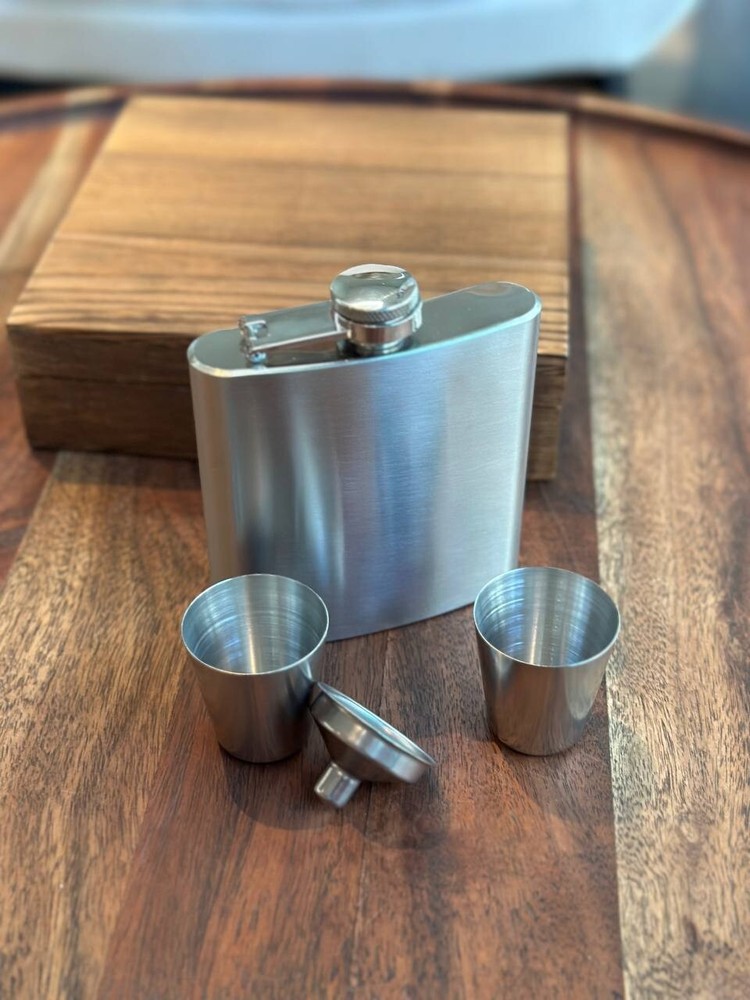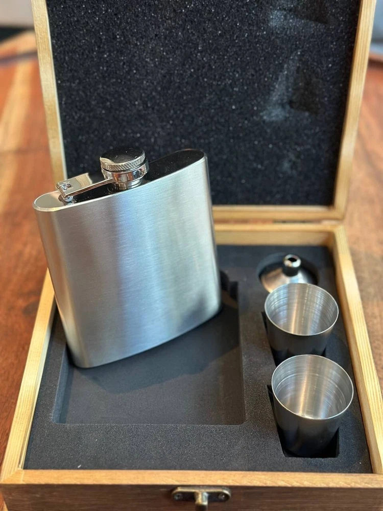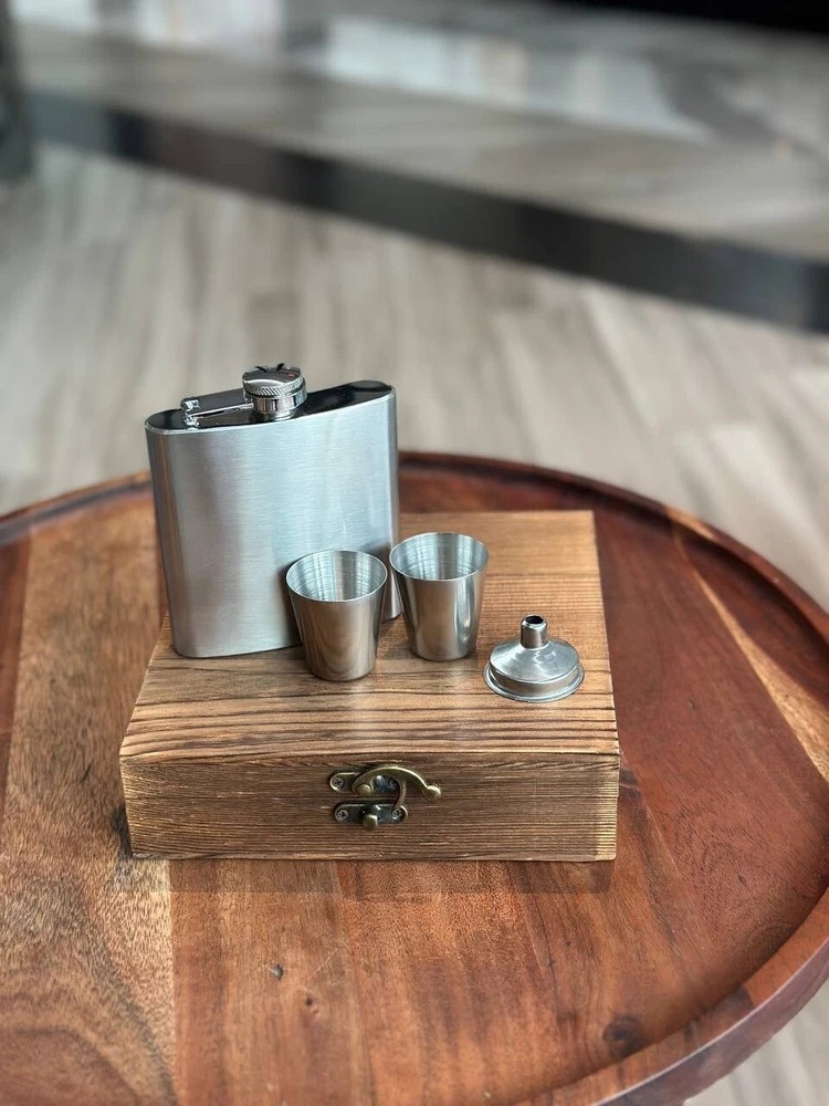 π Product Description: Elegant Metal Flask Gift Set with Wooden Box β Perfect for Whiskey Lovers & Groomsmen! Celebrate in style with this classic 6oz metal flask set, beautifully presented in a rustic wooden gift box. Ideal for best man gifts, groomsmen, birthdays, or any whiskey lover in your life. π Measurements: Wooden Box: 7.5" (L) x 6.75" (W) x 1.75" (H) Flask: 3.75" (L) x 0.81" (W) x 4.25" (H) β holds 6oz Shot Glasses: Each holds 1oz (30ml) β¨ Features: Durable stainless steel flask Two 1oz shot glasses included Handsome keepsake wooden box Makes a perfect wedding or groomsmen gift Personalization available β message us to customize! π Give the gift of great taste βwhether it's for a celebration or just because. This stylish, compact set is a timeless favorite for whiskey fans and party hosts alike!