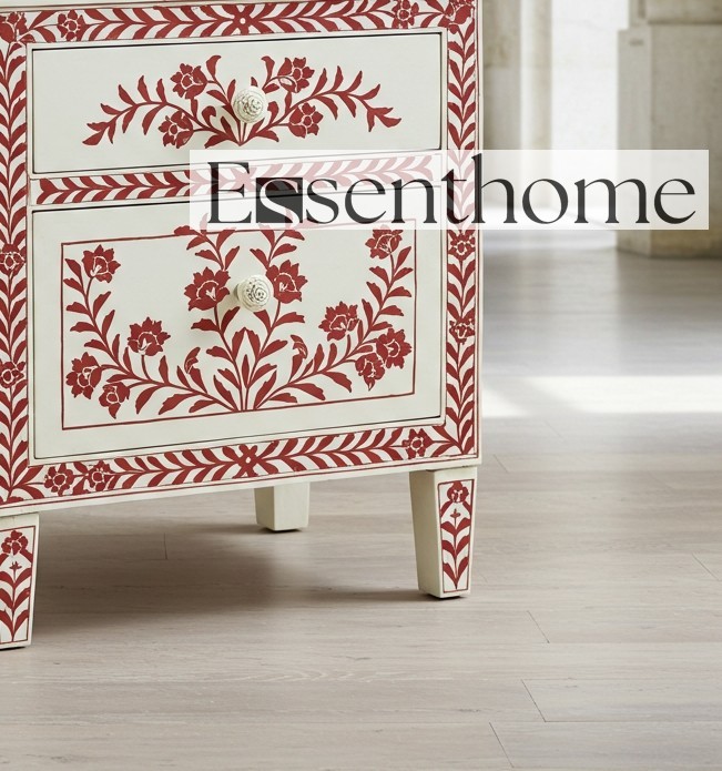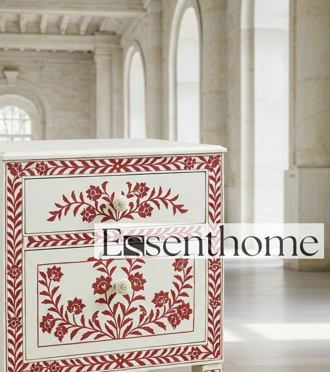 Elevate your interior with timeless elegance through this handcrafted White Bone Inlay Bedside Table, featuring a delicate floral motif and two practical drawers. Made by skilled artisans in Rajasthan, India, this piece celebrates traditional craftsmanship with a clean and modern all-white palette. Each floral design is meticulously hand-carved from ethically sourced camel bone and inlaid into a smooth white resin base, creating a graceful vine pattern that wraps the top, sides, and drawer fronts. The matching bone knobs add a cohesive, refined finish, while the two drawers provide ample storage for nighttime or everyday essentials. The all-white finish makes this bedside table exceptionally versatile — ideal for minimalist, bohemian, coastal, or classic interiors. It brings sophistication and serenity to bedrooms, guest rooms, or even stylish entryways. As every piece is handmade, slight variations in inlay detail and tone highlight the authenticity and uniqueness of the craftsmanship, ensuring no two tables are exactly alike. Product Specifications: Material: Bone Inlay, Solid Wood, Resin Pattern: Hand-Inlaid Floral Vine Motif Color: All White – White Resin with White Bone Drawers: 2 Drawers with Bone Knobs Style: Ethnic Minimal, Luxe Bohemian, Modern Artisan Finish: Smooth Matte Finish Origin: Handmade in Rajasthan, India Care Instructions: Wipe gently with a soft, dry or slightly damp cloth Assembly: Arrives fully assembled