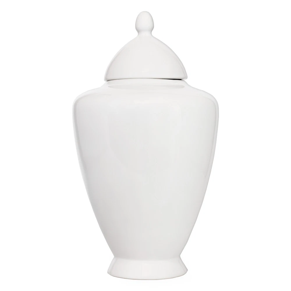 Add elegance to your home with this 10.5-inch tall ginger jar, crafted from ceramic/porcelain with a classic silhouette. Its smooth white finish brings sophistication to any decor, ideal for mantelpieces, bookshelves, or as a centerpiece. The jar's size (10.5" tall, 6" diameter) and 2.75" mouth opening make it a stylish yet functional piece, perfect for holding treasured items or simply enhancing your space. With a 50 oz. capacity and cool white undertones, it's a versatile addition to any room, harmonizing with various color schemes. This timeless ginger jar is a must-have for those who appreciate beauty and elegance in home decor. Kurated Korner Our eBay Store About Us Contact Us Add to Favorite Sellers AuldHome Design White Ceramic Ginger Jar, Decorative Antique Style Home Decor Vase w/ Lid Historical charm: Inspired by traditional oriental ginger jars once used to store spices or decorate temples. Classic elegance: Timeless white finish with smooth, rounded lines for a sophisticated style. Versatile use: Suitable as a decorative piece, shelf decor, vase or centerpiece. Ideal dimensions: Stands 10.5 inches tall, 6 inches wide—perfect for display on shelves or tables Pure & durable: Crafted from high-quality ceramic with a glossy white glaze. This exquisite white ginger jar, standing at 10.5 inches tall with a 6-inch diameter and crafted from premium ceramic/porcelain, offers both elegance and practicality. Its seamless white finish, with cool undertones, radiates purity and sophistication, creating a timeless decorative piece perfect for enhancing the decor of any mantelpiece, bookshelf, or as a centerpiece in dining or living areas. The jar's classic silhouette and smooth contours, topped with a simple yet stately lid, promise to complement various color schemes and styles. With a mouth opening of 2.75 inches and a generous capacity of 50 fluid oz. (1.5 liter), it serves not just as a beautiful ornament but also as a discreet container for holding treasured items, blending harmoniously into any setting. Auction format and description, in-house images and in-house photos © 2023 and ™ Webbed Sphere Inc. All rights reserved.