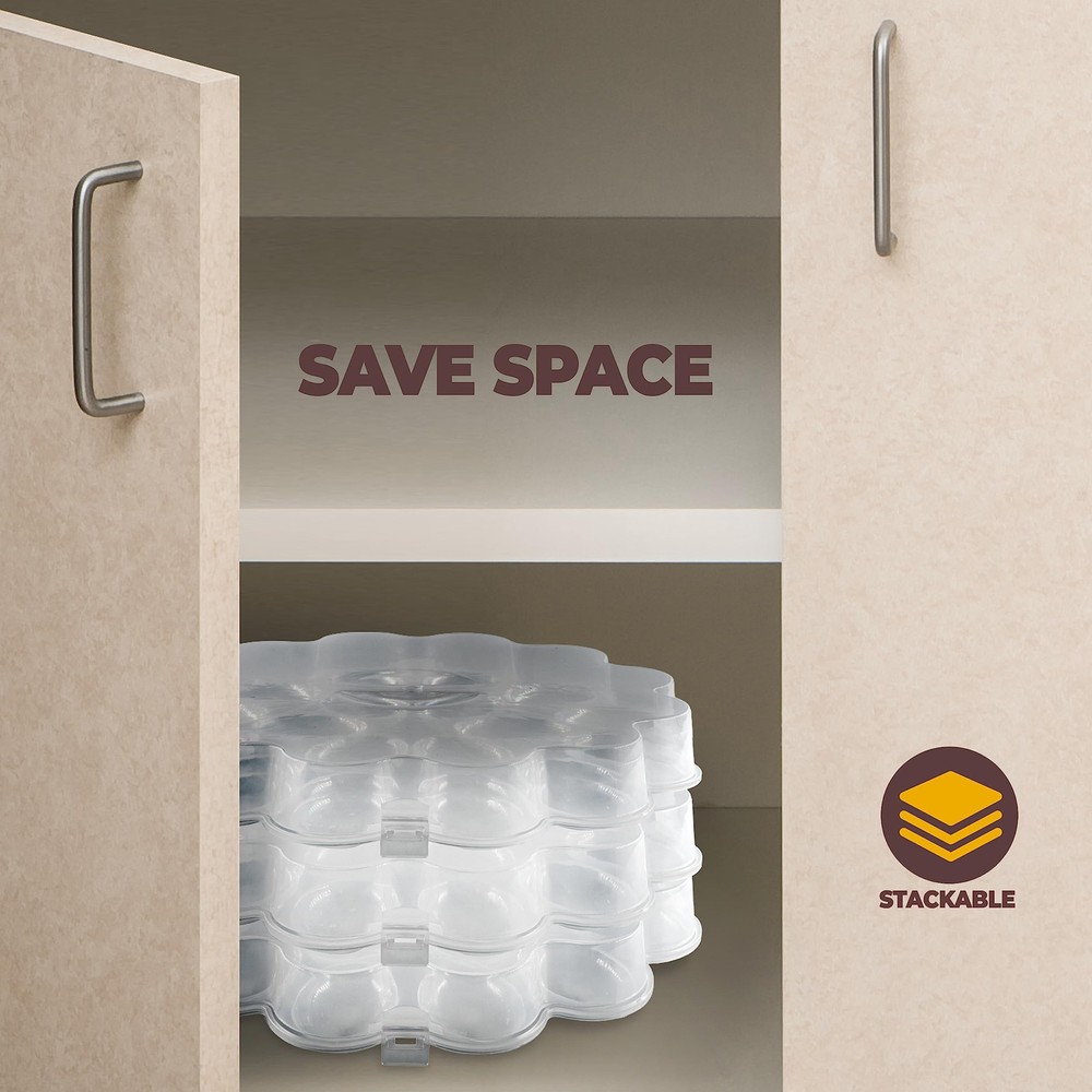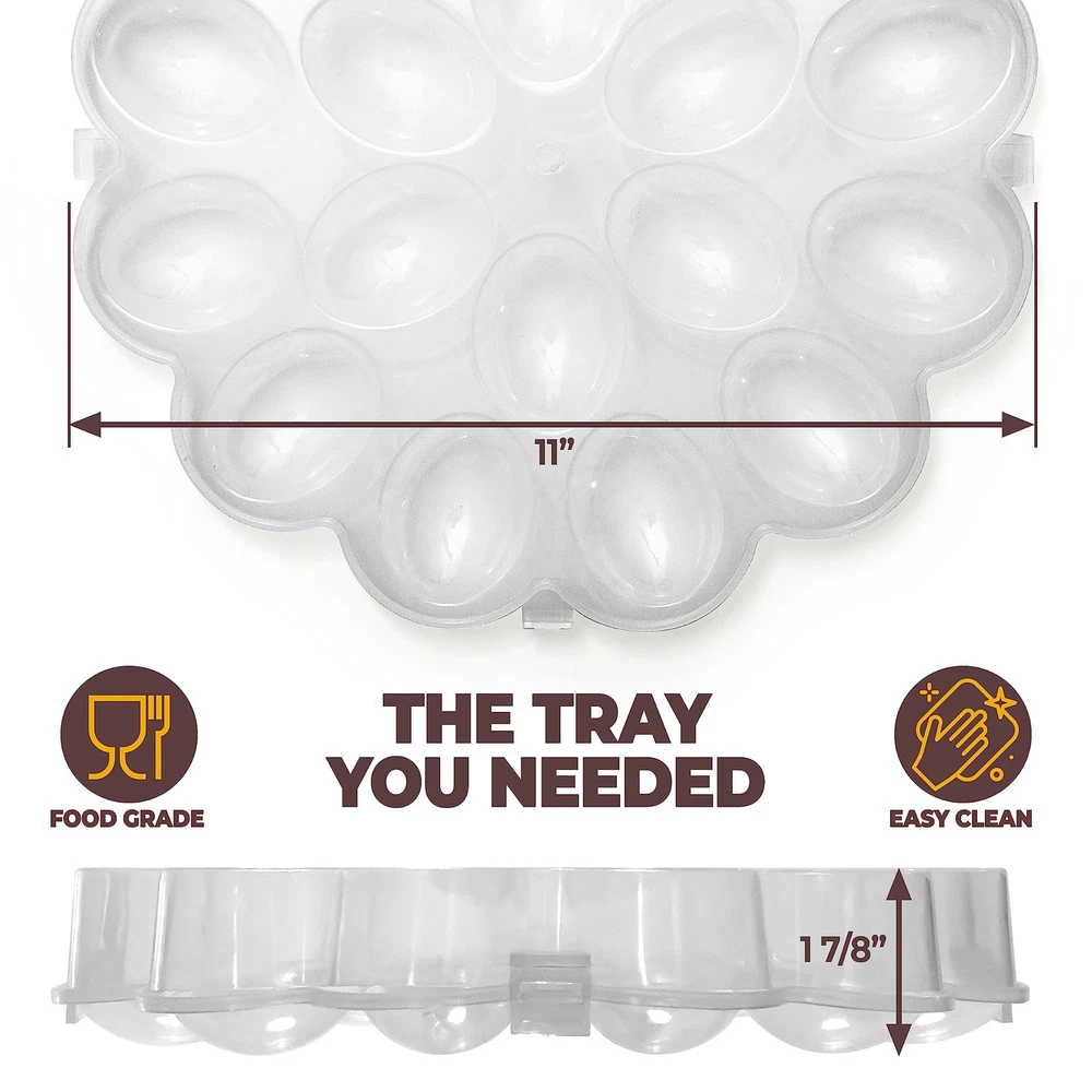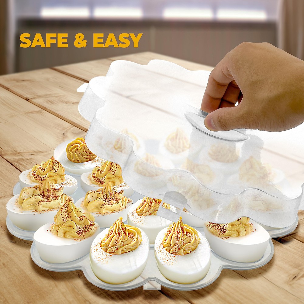 Picture-Perfect Deviled Eggs: Each deviled egg carrier with lid has 18 perfectly shaped indents to hold your deviled eggs in place, preventing them from sliding around during transport and ensuring a beautiful presentation every time with its flower design. Ultra-Secure Lid: Our deviled egg tray comes with a secure lid that snaps tightly into place, creating a tight seal that keeps your deviled eggs fresh and prevents them from spilling or sliding during transport, making it the perfect deviled egg container for your next picnic or potluck. Versatile Use: From holiday parties to buffets, this deviled egg container with lid is perfect for any event where you need to transport or serve deviled eggs, making it a must-have for your next potluck, picnic, or social gathering. Durable and Reusable: Made of high-quality, BPA-free plastic material, this deviled egg plate is not only reusable but also durable enough to withstand regular use, ensuring that you can enjoy your favorite deviled eggs time and time again. Easy Storage and Transport: With its dimensions of 11" x 11" x 2", this deviled egg container with lid is compact and stackable, making it a breeze to store in your kitchen or pantry. Plus, the sturdy handle on the lid ensures easy and secure transport to your next gathering or event.
