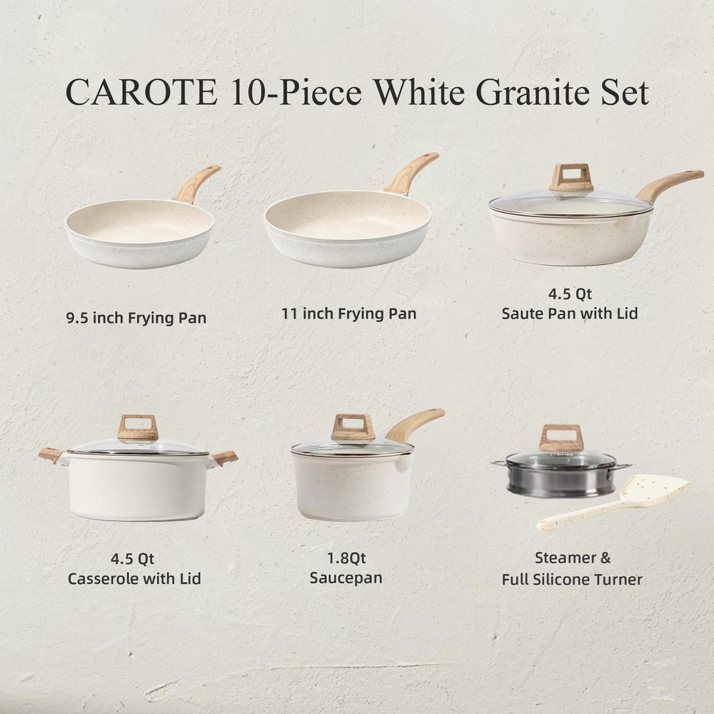 Sturdy Die-Cast Aluminum Body: The reinforced die-cast aluminum construction of this kitchen pots and pans set ensures long-term durability and reliability while maintaining a lightweight design. This lightweight feature brings convenience to your cooking experience. 10-Piece Cookware Set Includes Egg pan, 9.5 inch Frying Pan, 11 inch Frying Pan, 1.7 QT Saucepan with Lid and steamer, 4.3QT Casserole Pot with Lid, 4.5QT Saute Pan with Lid, 1* Utensil. Our favourite non-stick pots and pans set meets all your needs for everyday cooking. White Granite – A top-level, harder nonstick granite material with 10x Ultra Non-stick performance, PFOS/PFOA free, our cookware ensures your daily cooking is always safer and healthier. Easy To Clean – Just wipe it with a paper towel or rinse it with water, Less CO2 emission and Less water wasted. Recommend hand washing the cookware as it is effortless to clean. Suitable For All Stoves – Heats up quickly and evenly with an extended bottom design. A high magnetic conductive stainless steel base allows our nonstick cookware to work on all cooktops, including induction.