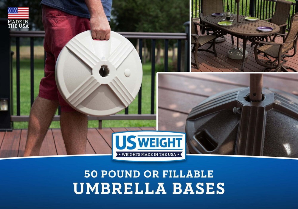 You may also like 17.72" Round Umbrella Stand Base 24.2 Lbs Market Heavy Duty Patio Outdoor US 57.49 USD Free shipping 50lbs 20" Capacity Fillable Patio Umbrella Base Heavy Duty Market Stand Outdoor 46.26 USD Free shipping Round Plastic Umbrella Base Fillable Anti Cracking & Fading Weather Resistant 39.73 USD Free shipping Round Umbrella Base Stand Water/Sand Fillable Anchored W/ Steel Pipe Garden NEW 38.49 USD Free shipping Garden Umbrella Base W/ Adaptor Weather-Resistant Stand Bronze Holder Outdoor 42.28 USD Free shipping Support your patio umbrella without worrying about cracking and fading. The US Weight Umbrella Base is crafted with a U.V. stabilized polymer that will not rust or dent and can withstand the elements in any weather climate. The base accommodates 1” and 1.50” poles and should be used with a patio table. This base can either be prefilled with 50 pounds of a solid concrete core or empty and ready to be filled with sand or gravel. The umbrella bases come in a variety of colors and prefilled or empty options. Designed to be used only with a patio table, accommodating 1” through 1.50” poles Durable umbrella base resists cracking and fading in any weather climate Prefilled with 50 pounds of a solid concrete core for years of carefree use in any weather condition Easily transport or relocate umbrella base using the EZ Grip handle 24-inch Wood & Poly Leaf Rake for Yard, Garden Lawn Cleaning Hand Tool 15.297 USD Free shipping Heavy Duty Oxygen Acetylene Hose 1/4"×50Ft 9/16"-18 B fittings Twin Welding Hose 59.77 USD Free shipping Vacuum Cleaner Power Suction Bagless Portable Upright Floor Cleaner Pet Hair US 154.13 USD Free shipping 14'' Pressure Washer Surface Cleaner Attachment Driveway Power Washer Accessory 82.27 USD Free shipping 4-Shelf Bookcase Wooden Bookshelf Adjustable Shelves Storage Bookshelf Home 80.77 USD Free shipping Baby Lightweight Infant Stroller Compact 3 Point Safety Harness with Sun Canopy 43.51 USD Free shipping US Fuel Injection Pressure Tester Kit Gauge 0-140 PSI Dual Dial w/ Case Portable 75.61 USD Free shipping 350W Meat Grinder Electric Food Processor Stainless Steel Blender Food Chopper 52.42 USD Free shipping Large Wind Chimes Outdoor Deep Tone 42" Memorial Wind Chimes Garden Home Decor 80.75 USD Free shipping Queen Comforter Set 7 Pieces Bed in Bag Microfiber All Season Soft Bedding New 53.77 USD Free shipping 48-Inch Tine Tow Dethatcher Twenty-Four Durable Spring Tines Easy Thatch Removal 165.55 USD Free shipping 4 Pack Clear Mug Set Tapered Glass Curved Handle Beverage Cup Dishwasher Safe US 27.71 USD Free shipping