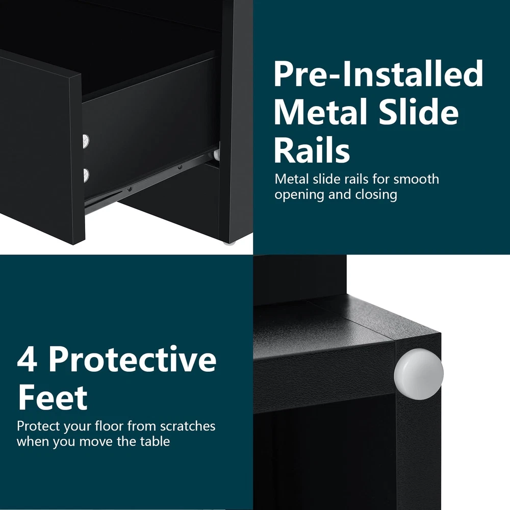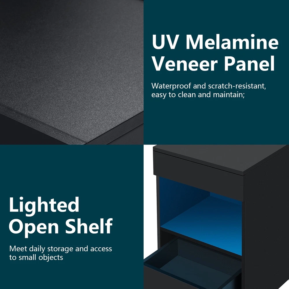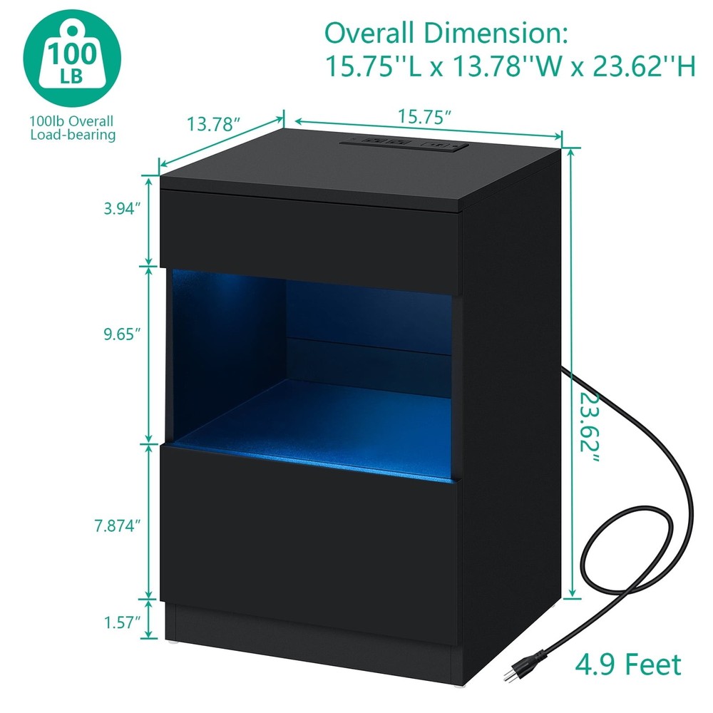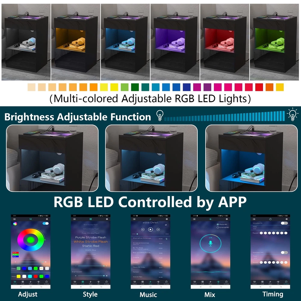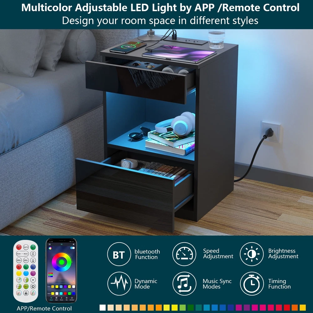 Modern nightstands with charging station has a sleek and minimalist design, adding elegance and class to your home. 2 drawer nightstand is equipped with a multifunction charging station, USB port, Type C port and 2AC Outlets to meet any charging needs.The beautiful LED light will make your home looks more modern and fashionable. Smart LED NightStands supports two ways of APP bluetooth and remote control. Black/White nightstands with light is suitable for bedroom, living room, children's room, office as a bedside cabinet, side table, coffee table, storage cabinet. Pre-mounted holes and pre-mounted slide rails allow for easy installation. High gloss led end table interprets your simple lifestyle with a stylish shape. MULTIFUNCTIONAL CHARGING STATION This LED nightstands has 2 standard plug Outlets and 2 USB ports, allowing you to charge multiple electronic devices at the same time, such as mobile phones, desk lamps, pads, computers, and more. LED LIGHT WITH Multi-VARIABLE RGB COLORS Modern open shelf nightstands comes with beautiful multi-color RGB LED light. more than 16 million colors to DIY, muitiple brightness modes to choose from. Considering the practicability, APP and button remote control can switch multiple control modes, and you can freely set the brightness, color, mode and timing function. 2 DRAWERS AND OPEN SHELF The led nightstands with 2 drawers and a top large drawer enough space for you.The large capacity of the drawer can offer plenty of space for organizing your items such as books, glasses, and earphones. This nightstands with charging station is a nice addition to your bedroom and living room to keep your space tidy. HIGH GLOSS FINISH The nightstands with charging station uses UV Triamine Board material that is safe and environmentally friendly. High-quality waterproof surface treatment, easy to clean and maintain, robust. EASY TO ASSEMBLE The package includes numbered plates, reserved hole and assembly instructions. Pre installed light strip and drawer guide rail make the assembly process more convenient.