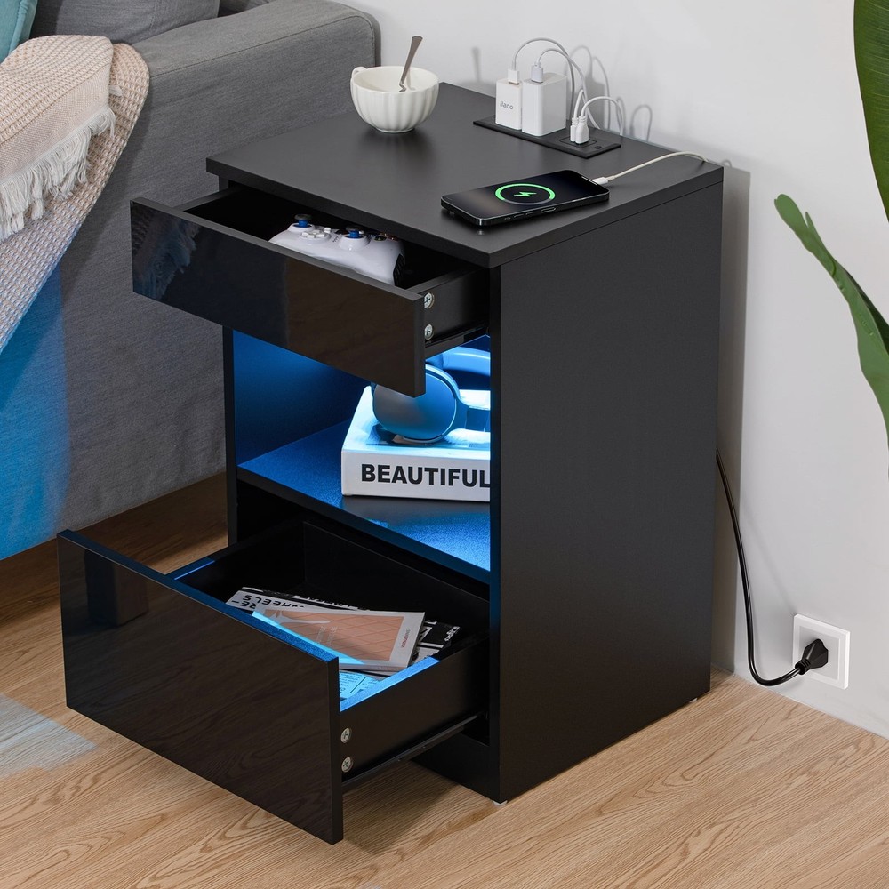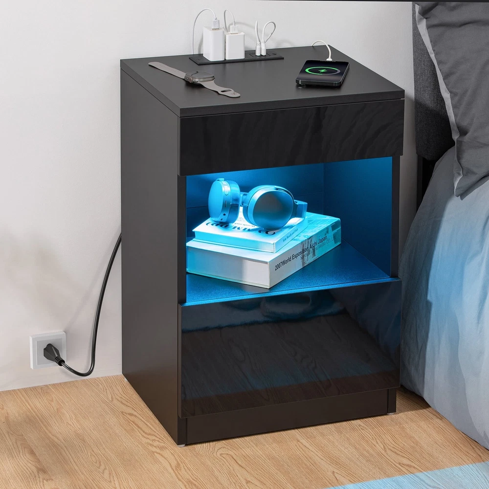This nightstand is a game-changer! The high-gloss finish looks so sleek, and the built-in USB ports and outlets make charging a breeze. The RGB LED lighting adds a cool modern vibe, and I love that it can be controlled via app or remote. Super easy to assemble, and the two drawers provide plenty of storage. Perfect for any room—stylish and functional!
