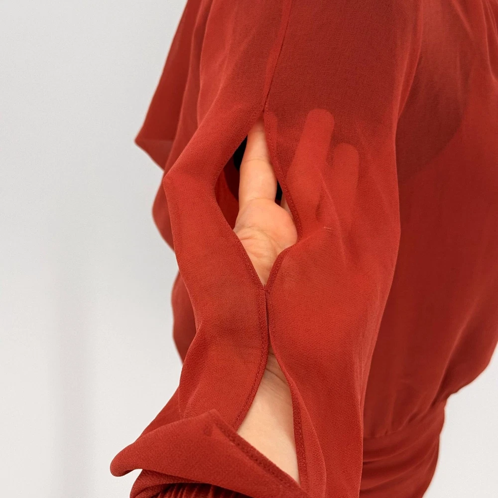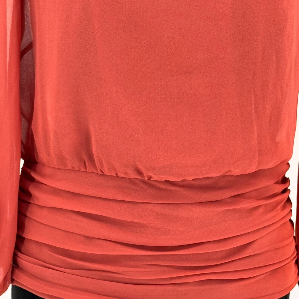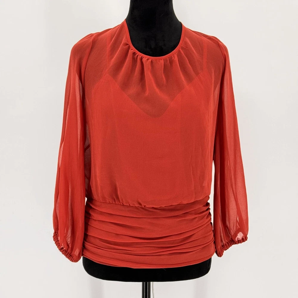 In the land of fashion wonders, this White House Black Market blouse weaves a tale of sophistication with its flowing red ochre hue. The lightweight polyester fabric, combined with the elegant draping details, offers a timeless charm. A wardrobe staple for those who appreciate elegance in simplicity. • Red Ochre Color • 100% Polyester • Long Sleeves • Ruched Waist • Keyhole Back • Round Neckline Bust = 17 1/4 inches, Waist = 16 1/4 inches, Length = 22 3/4 inches, Sleeve Length = 18 1/2 inches.