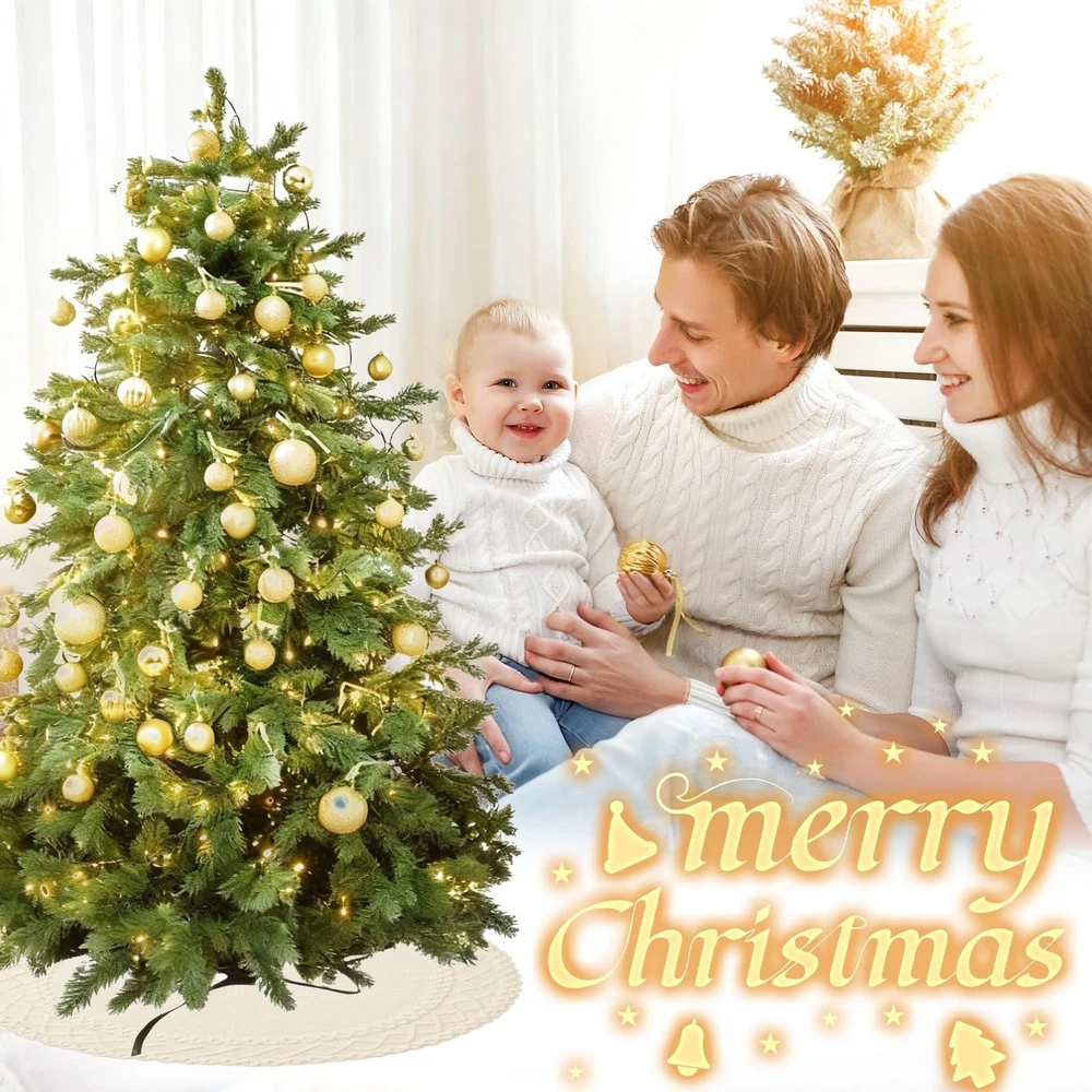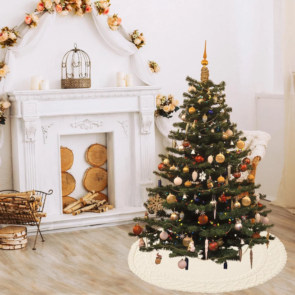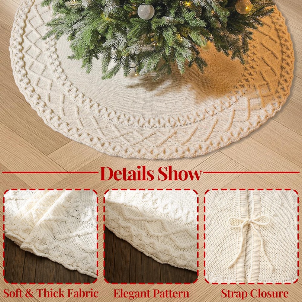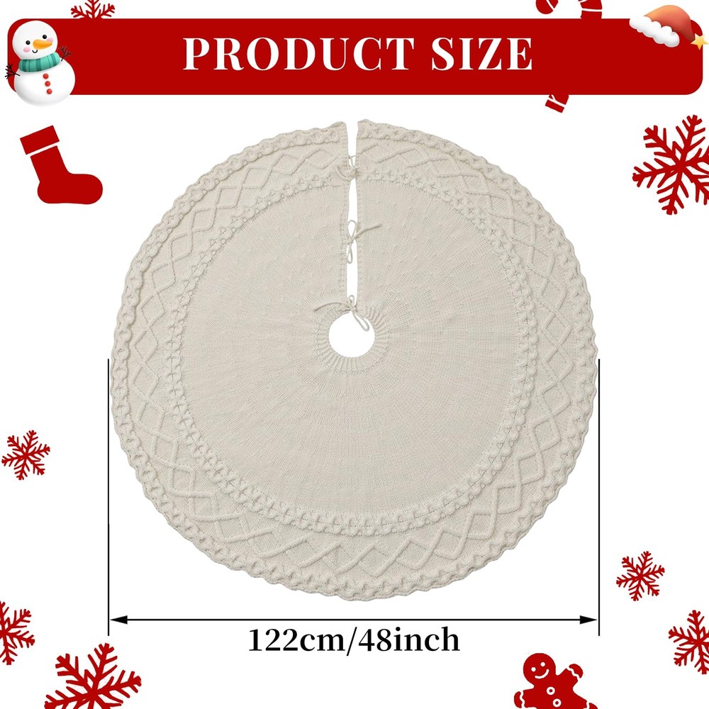 Merry Christmas - Crave that warm, welcoming farmhouse Christmas feel? Our cable knit tree skirt is your answer! Classic cable knit handcrafted Christmas collection, this tree skirt is 48 inches featuring a soft touch and authentic knitting, dress your home décor with warm and cozy vibes. Merry Christmas - Crave that warm, welcoming farmhouse Christmas feel? Our cable knit tree skirt is your answer! Classic cable knit handcrafted Christmas collection, this tree skirt is 48 inches featuring a soft touch and authentic knitting, dress your home décor with warm and cozy vibes. High-Quality Knitted Tree Skirt - Crafted with high-quality knitted heavy yarn, the Christmas tree skirt is thicker and more shaped, more durable against the ground, and not easy to fade. It protects floors from pine needles while creating that cherished, fireside ambiance. The thickened knitting process has a better shape to fit the ground, with the prepared Christmas gifts are placed for decoring your Xmas! Perfect Size - Knitted Christmas Tree Skirt measures about 48 inches in diameter, fits for 5-7 ft trees. Large enough for you to put more gifts you want on it and keep your floors clean. Packaged with a cute storage bag, you can storage it easily for next year use. Elegant Design - The edge crochet process makes this knit tree skirt different from the traditional round Christmas tree skirt, which is much more elegant. Three darling bow ties ensure it stays perfectly placed. Unwrap the magic, smooth out the journey wrinkles, and let it transform your space into a storybook Christmas scene. Xmas Decor & Warm Christmas Gift - Ideal Christmas tree decorations to decorate your Christmas tree, home, living room, bedroom, wedding, garden. Perfect gifts for men, women, family, kids and everyone you love. Bring heartwarming, down-home holiday joy to life!