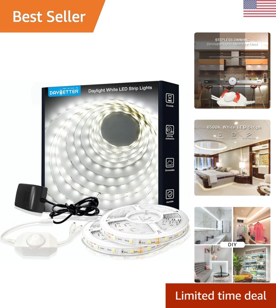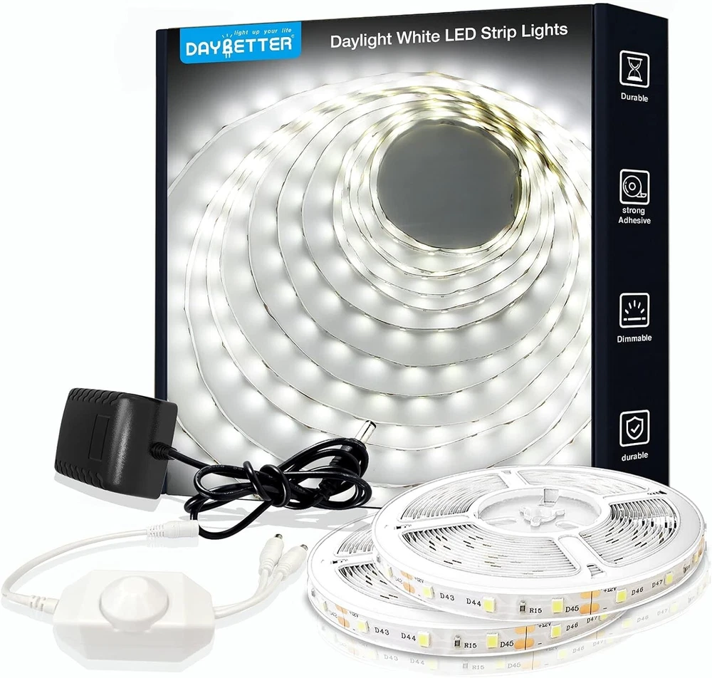 White LED Strip Light, 40ft Dimmable Bright Rope Light, 6500K 24V Light Strips, 720 LEDs 2835 Tape Lights for Bedroom, Kitchen, Mirror, Home Decoration2 Rolls of 20ft Daylight white: White led strip lights use 40ft 720 high quality LEDs and 6500K color temperature, it will help you light up those dark rooms, cabinets, mirrors and any corner Adjust brightness: The dimmer allows you to adjust the brightness of led white lights for various occasions. You can use the control box to dim or brighten your led light strip Simple installation: The installation of the strip lights is very simple, before the installation, please keep the surface dry and clean Flexible cuttable: You can also cut the length of the light strip according to your own needs, just be careful you should cut between every 3 LEDs with the cutting mark (packaging without the lights connector) Widely use: Powered by a 24V working voltage, the white led strip lights can be suitable for indoor lighting and decor LED Strip Lights White led strip lights Add to Cart Cob super led lights See Details TV led backlights Add to Cart LED strip lights Add to Cart LED lights for room Add to Cart LED lights for bedroom Add to Cart Warm led lights Add to Cart Customer Reviews out of 5 stars 2,505 out of 5 stars 2,505 out of 5 stars 1,557 out of 5 stars 13,343 out of 5 stars 21,643 out of 5 stars 49,277 out of 5 stars 2,505 Price $$ — $$ $$ $$ $$ $$ Length 40FT 60FT 100FT 100FT Roll 2 Rolls 1 Rolls 1 Rolls 2 Rolls 1 Rolls 2 Rolls 1 Rolls Color Daylight white Super daylight white RGB RGB RGB RGB Warm white Control way Dimmer Dimmer 20 key remote and app 44 key remote 44 key remote and app 24 key remote and app Dimmer Voltage 24V 24V 5V 12V 24V 24V 12V