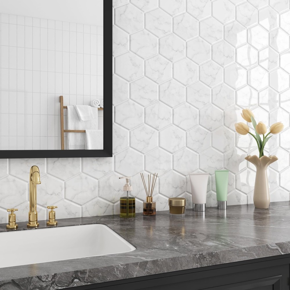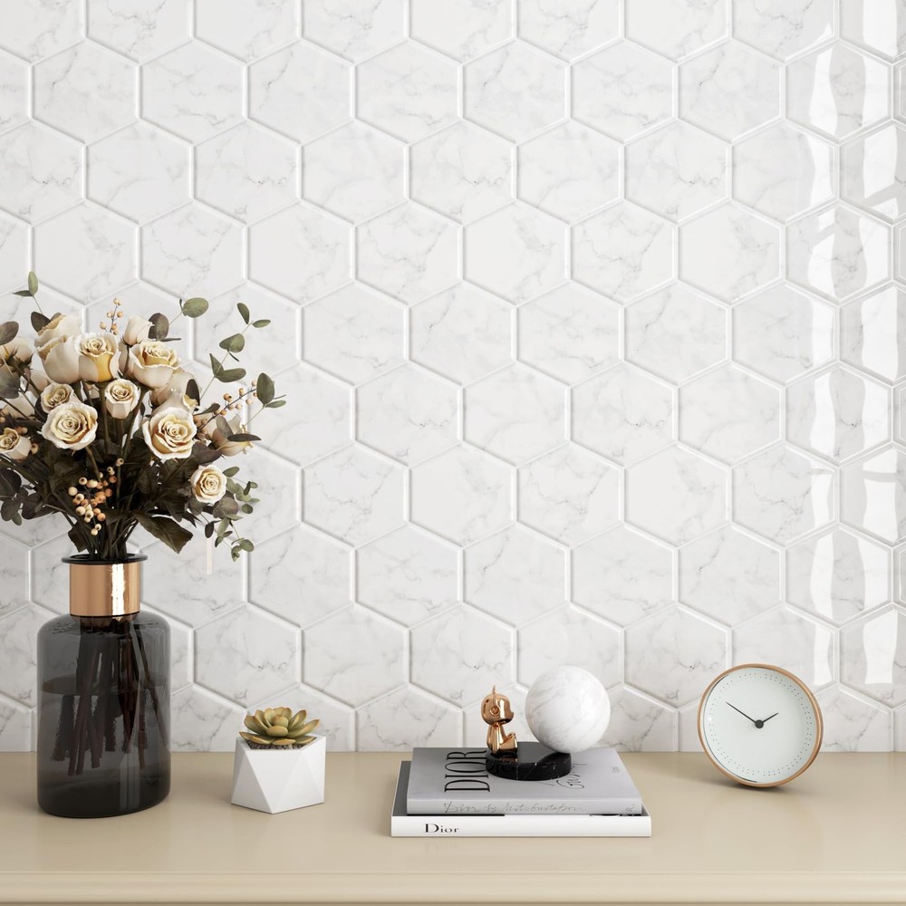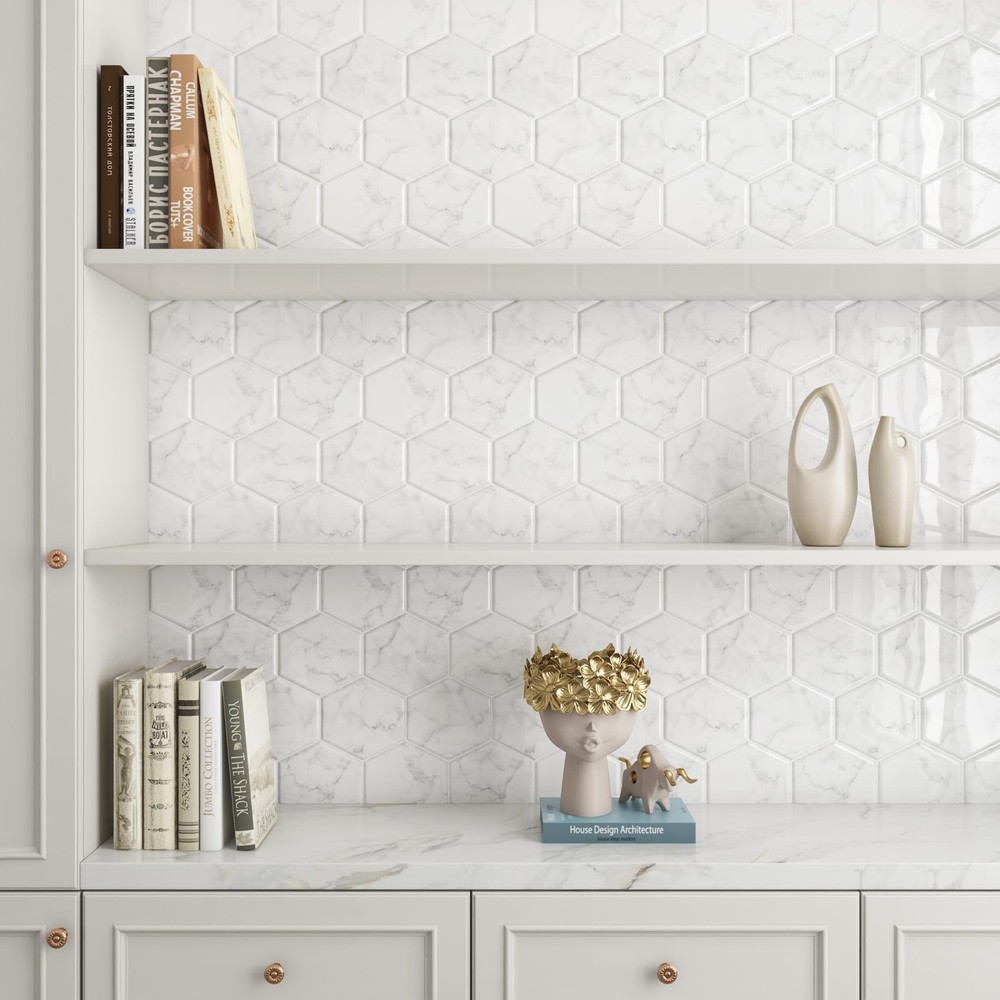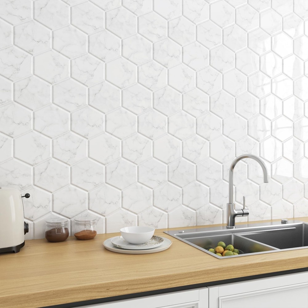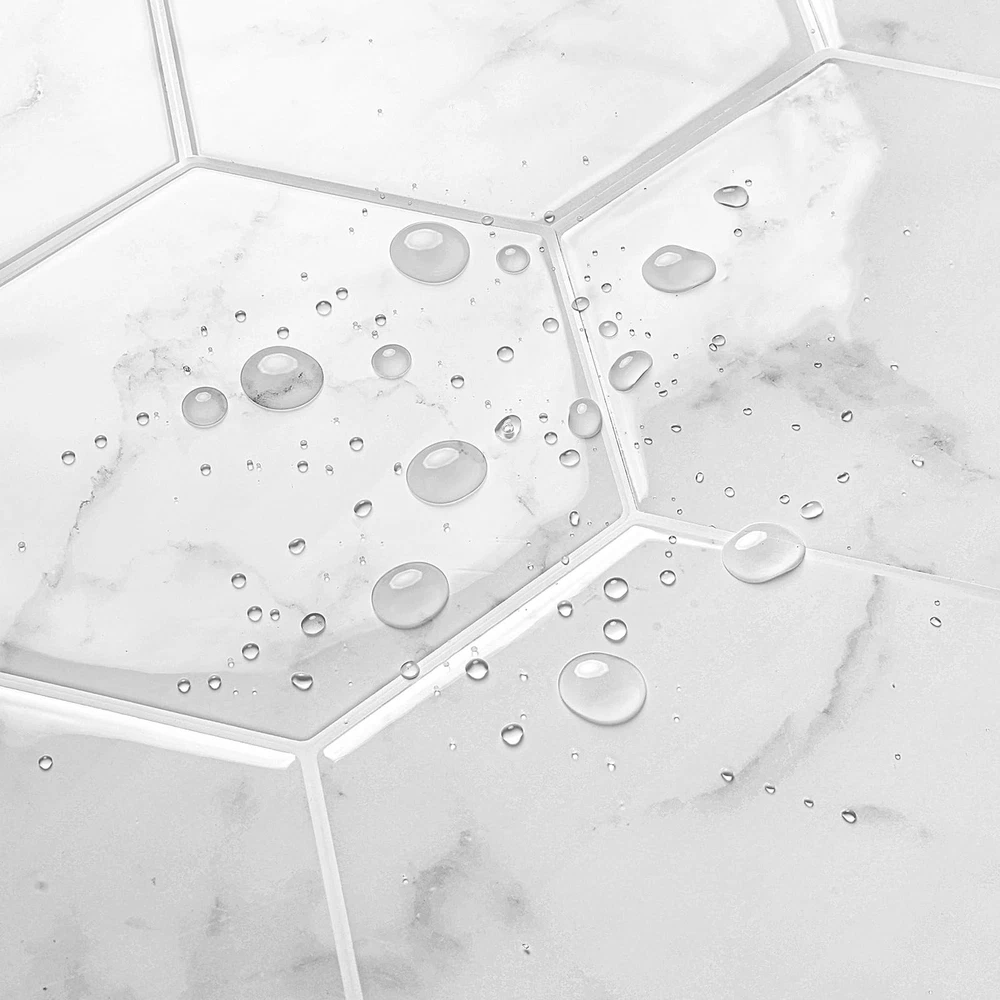 WHITE BACKSPLASH PEEL AND STICK BACKSPLASH TILE FOR KITCHEN WALL 👍 WOULD YOU WANT TO QUICKLY TRANSFORM OR DECORATE YOUR HOME? 👍 ▸White marble hexagon backsplash tiles is extra thick and durable. ▸Peel and stick tile backsplash for kitchen wall is suitable for kitchen, bathroom, laundry, accent wall, stairs, bedroom, DIY decor, living room, etc. 📝 SPECIFICATION 📝 >> Finish: Glossy >> Design: White Marble Hexagon >> Feature: Peel and Stick, Self-adhesive, Waterproof, Oil-proof, Removable, Sticky, Thick, Durable, Repositioned, Easy to Clean, Easy to Use, Bubble-free. >> Application: Suitable for decorating and transforming kitchen, bathroom, floor, countertop, coffee table, vanity, cabinet, built-ins, walls, dresser, drawer, wrapping paper, DIY project, and more. ✂️ INSTALL STEPS ✂️ 1. Firstly, clean the surface to make sure it is smooth flat and dry. Measure the area, leave an extra length before cutting the backsplash tile. 2. Secondly, Peel off the backing little by little while using a soft cloth to smooth the tiles as you go. 3. Finally, use a hairdryer to ""stretch"" the edges and seal them under the countertop overhang. 😀 WARM TIPS 😀 ▸To avoid color difference please buy enough boxes at a time to ensure they come from the same batch. ▸Product pictures may have slight differences in color from the actual product as monitors vary. ▸Please ensure that the covered surface is smooth and clean. Textured surface will affect the adhesion of the peel and stick backsplash tile. ▸Please contact us through Amazon if you are unsatisfied with the kitchen backsplash peel and stick for any reason, and we will solve it in the first time. 🐑 -【Size】:The size of each backsplash tile peel and stick is 12" wide by 12" long. 1 box of 15pcs hexagon peel and stick backsplash covers about 14.53 sq.ft. Strong coverage and a variety of styles to choose from. 🐑 -【Features】:Kitchen backsplash tiles peel and stick is durable, soft, easy to cut, waterproof, oilproof, and removable. Easy to wipe to remove stains and protect the kitchen, laundry, bathroom back splashes. 🐑 -【Application】:White marble kitchen backsplash is great for kitchen, bathroom, laundry room, stair, basement, bedroom, living room, garage, RV, fireplace, camper, and more. Both renter and homeowner friendly. 🐑 -【Easy to Use】:Peel and stick tile backsplash is nice for new users and super easy to operate! Just peel the back film and stick it to the surface you want. no grout, no glue, and removable. Easy to cut with sharp utility knife or scissors. 🐑 -【Customer Service】:If you are not satisfied with peel and stick backsplash tiles or have any other questions, please feel free to contact us and we will try our best to help.