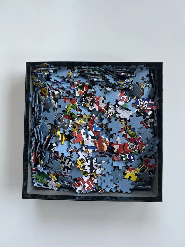The White Mountain General Mills Cereal Boxes puzzle features 1000 thicker pieces showcasing vintage cereal boxes. Item # 1261A-T Puzzle Size: 20” x 27” Pieces are put in ziplock bag. Counted to ensure complete puzzle. Smoke free, pet free home.