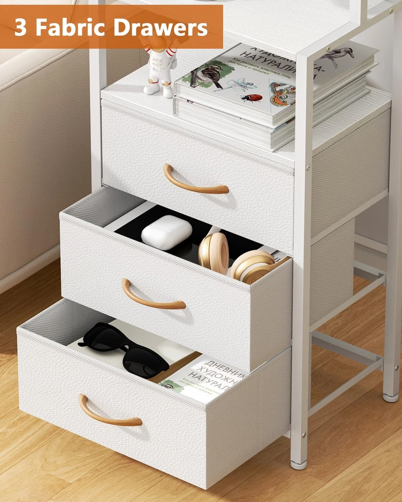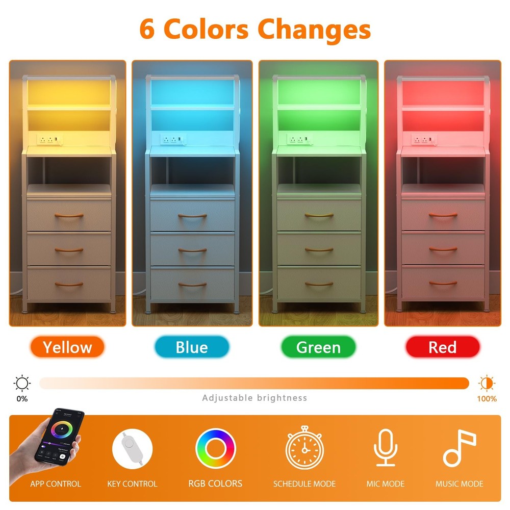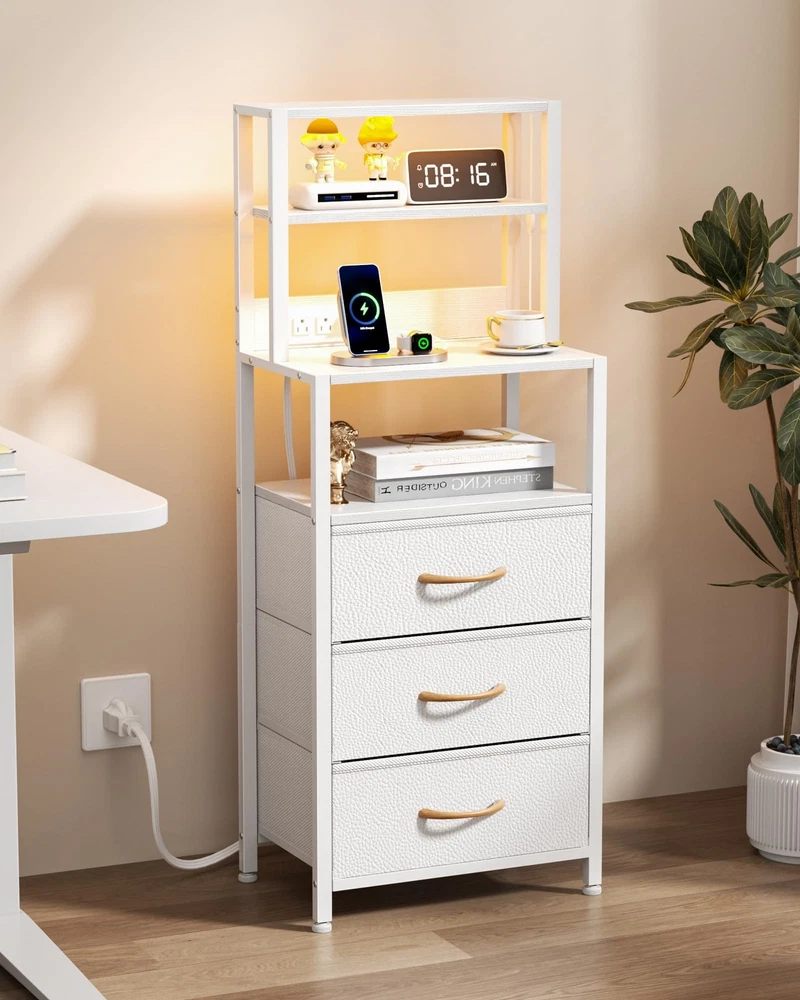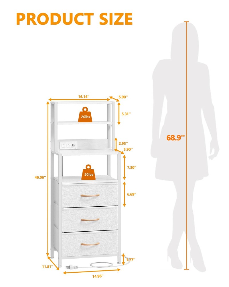 Night Stand, White Bedside Nightstand with 4-Tier Shelves and 3 Fabric Drawers, LED Bed Side Tables with Charging Station, Tall Dresser for Bedroom, Hallway, Office Tall Night Stand with 4 Storage Shelves: This dresser and bedside table is versatile and practical for every storage need. Fabric drawers for personal items and 4 storage shelves for ornaments, books, photos, remote controls and other personal items for all your storage needs. Nightstand With USB Port Charging: bedside table is equipped with 2 AC outlets, 2 USB ports and a 5 ft power cord, which can be used to charge mobile devices such as cell phones, pads, lamps, laptops and other mobile devices to meet your charging needs. Space Saving Design: The tall nightstand uses the bedside table and bookshelf 2 in 1 design, combining the bookshelf and the bedside table, effectively using the vertical space of the room, providing sufficient storage space without taking up too much floor space. Sturdy White Nightstand: This side table is made of high quality wood and a sturdy metal frame, and the drawers are made of fabric. Four adjustable feet not only increase stability, but also protect the floor from scratches. The second shelf can hold 20 pounds, the fourth shelf can hold 50 pounds, and each drawer can hold 10 pounds. Easy To Assemble: The 3 fabric drawer bedroom tables package includes all labeled parts, tools, and detailed assembly instructions to help you complete the installation more easily in a short time. Please feel free to contact us if any doubts about our storage nightstand! Tall Nightstand with 4-Tier Shelves, Night Stand with 3 Fabric Drawers and Charging Station, Bedside Nightstand with Bookshelf, Bed Side Table for Living Room, Bedroom, Home Office Shipping We offer FREE shipping on all orders! We ship within Three business days of payment, usually sooner. We use a selection of shipping services such as UPS, FedEx, USPS etc. We only ship to the lower 48 states, no APO/FPO addresses or PO Boxes allowed. Local pickups and combined shipping options are not provided at this time. Return You can return a product for up to 30 days from the date you purchased it. Any product you return must be in the same condition you received it and in the original packaging. Please keep the receipt. Payment We accept payment by any of the following methods: PayPal Please pay as soon as possible after winning an auction, as that will allow us to post your item to you sooner! Feedback Customer satisfaction is very important to us. If you have any problem with your order, please contact us and we will do our best to make you satisfied. Contact Us If you have any queries, please contact us via ebay. We usually respond within 24 hours on weekdays. Please visit our eBay store to check out other items for sale! Thank you for shopping at our store.