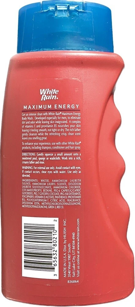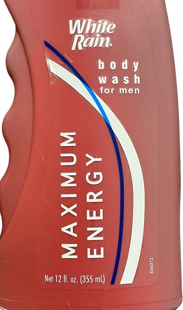 White Rain Men Max Energy Body Wash. Very hard to find Old Formula. New, 12 Fl Oz Bottle is faded from age. Free standard shipping. Lot # 1020
