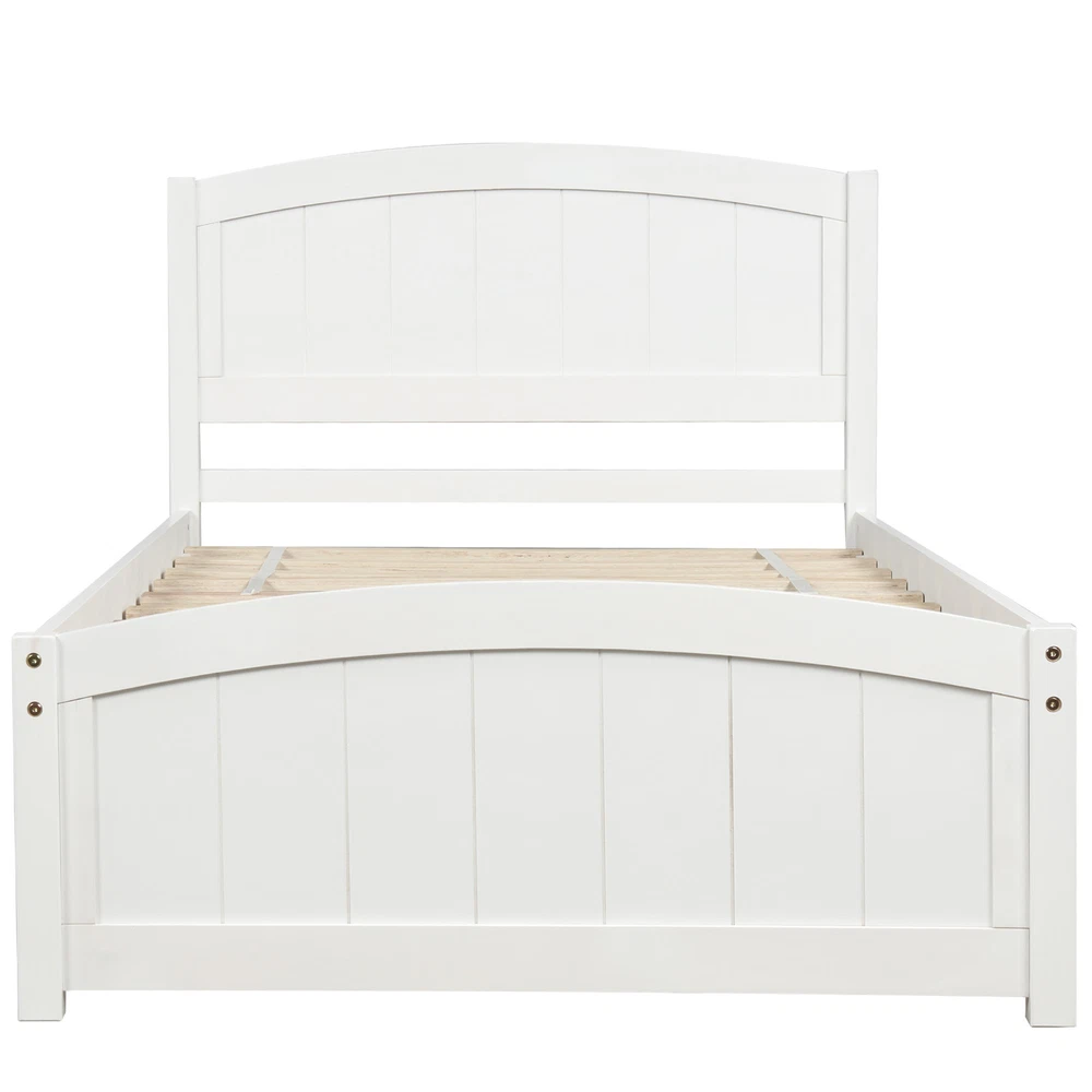 We welcome you to shop with us. Our greatest desire is your satisfaction. This Wood Platform Bed with Headboard/Footboard is a minimalistic, stylish bed frame that works well with a variety of decorating styles and makes it easy for you to enhance and improve your space. This platform bed features a headboard, a lower footboard and wood slats for support. The beautiful walnut finish lends an elegant look makes this bed frame an excellent addition to any bedroom, do not miss the chance take it home today. Every inch of this modern platform bed is designed with your comfort in mind. Featuring strong, solid pine wood and ten supporting slats, this bed is built to last, ensuring it will accompany you for many years. Included head and footboard are not only classically designed but allow you to increase your comfort level and ensure no pillows or blankets will fall during sleep. Specification Material Pine wood, plywood, All dimensions 79.5"L X 41.7"W X 35.4"H Weight 77.16 lbs Weight capacity 275 lbs. Color White, Walnut, Espresso number of slats 10 Country of Origin Vietnam Notes: Manual measurement has been used,there may be some reasonable error.All the pictures are taken by actual samples, slight chromatic aberration may occur due to lighting or display. [Classic and Stylish Design] This bed is designed with a clean, classically inspired silhouette that gives off a of subtle elegance. It masterfully blends with all styles of home decoration, and helps to complete and enhance the look of any bedroom. [Solid construction] pine wood construction, supplying you with the combination of strong, durable material and light weight, ensuring freedom to move your furniture conveniently. Designed with headboard and footboard which are not only stable but also safe for your kids. [Stability] Ten evenly spaced, solid wood slats blend naturally into the already sturdy frame to give added ground-up support that provides stability and piece of mind. Enjoy many years of relaxation and family fun, secure in this meticulously designed wood platform bed. [Assembly] Some simple assembly is required, clear and detailed instructions and all necessary tools are provided. If you have any questions, please don’t hesitate to contact one of our friendly customer service representatives. [Dimensions] Outer dimensions: 79.5”L X 41.7”W X 35.4”H. Inner dimensions:76”L X 38.2”W.