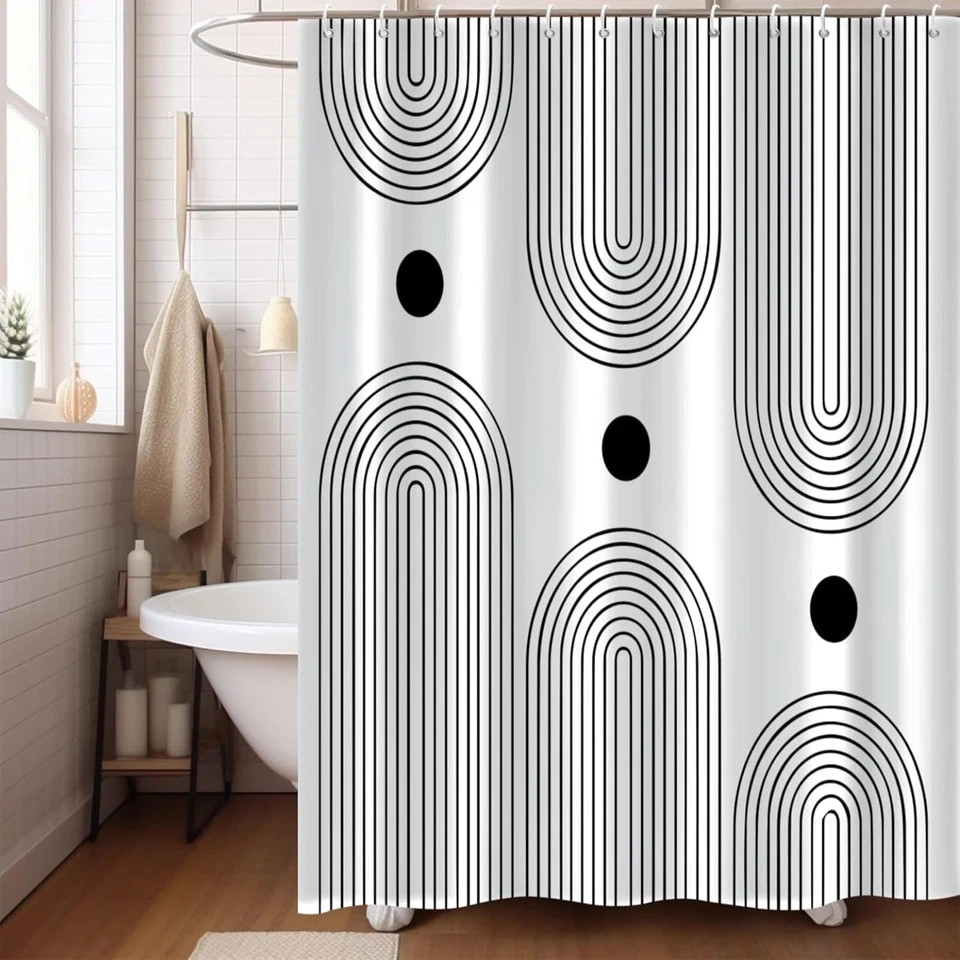 PREMIUM MATERIAL: The black and white modern shower curtain adopts premium fabric, easy to clean, machine-washable, waterproof, durable, no peculiar smell, good wrinkle resistance, smooth PRIVACY PROTECTION: The black and white modern shower curtain is thick enough to protect your privacy. The bathtub shower curtain allows you to enjoy the shower without outside distractions, make you relax body and soul WATERPROOF: Black and white modern shower curtain with excellent waterproof performance, it is beneficial to the separation of wet and dry. It also means the curtain is quick-drying, so you barely spend much time on caring GREAT DECOR: We use HD printing technology, the pattern is clear, printed with a unique pattern, this black and white modern shower curtain gives an eye-catching look in your bathroom. Whether it is at home, RV, apartment, or hotel, suitable for any bathing place EASY USE & CARE: Our black and white modern shower curtain with rust-resistant metal grommets on the top, with 12 plastic hooks, use the C-hooks to quickly hang the shower curtain on the pole. You can machine or hand wash to keep it clean