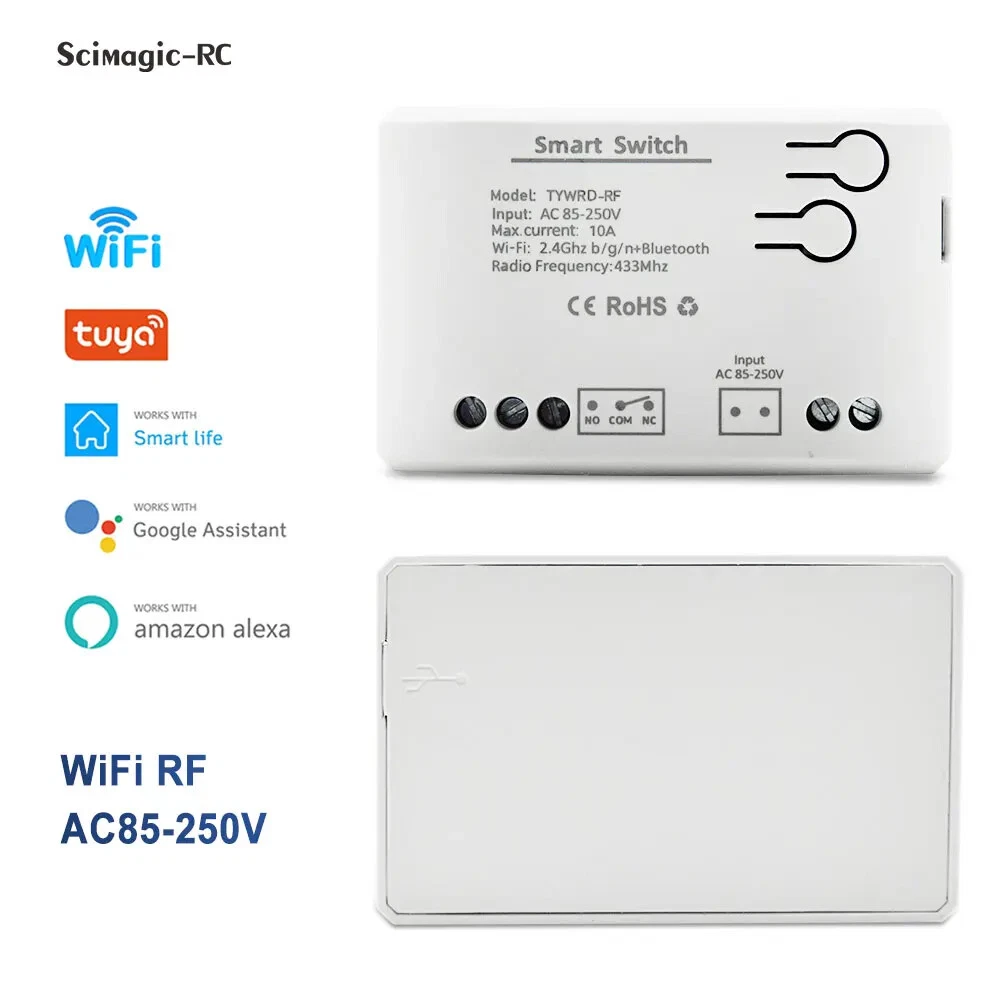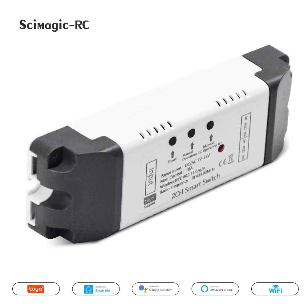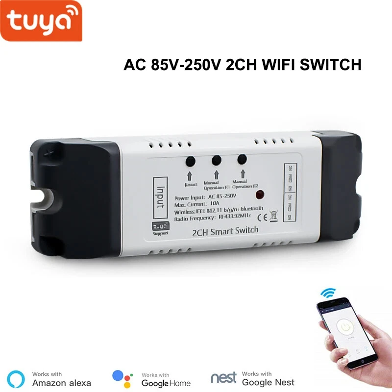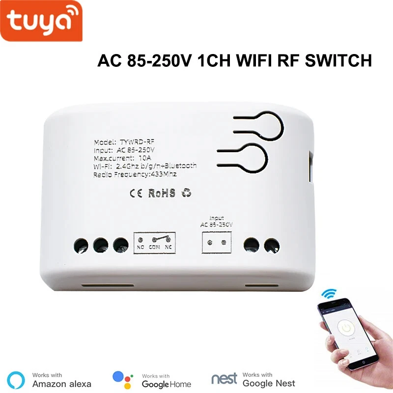 Tuya smart WIFI Wireless Smart Home Switch Remote Control with Amazon This product is a wireless switch, supports inching /self-locking mode. Users can add the device to the APP Smart life in order to remotely control connected home appliances or devices. 1、In self-locking mode, customers can remotely turn on/off connected devices immediately. 2、When in inching mode, customers can have two wiring ways to select, and you can set the inching time in APP . 3、WIFi control model, no need to program. No matter where you are, you only need to download a APP to connect the wifi and control the cloud. 4、RF mode , you can control the board with RF433 remote controller. Tuya 1/2/4CH Wifi Smart Switch Use for 1.Remotely give a pulse signal to turn on/off Lights,Lamps and other home appliance. 2.Remotely give a pulse signal to turn on/off Garage Door,Door Access. 3.Remotely give a pulse signal to control DC Motor,AC Motor to Forward and Reverse. Features: *App Support: Free iOS and for Android mobile Tuya APP/Smart Life APP. *Sync Status: Real-time device status provided to App. *Remote ON/OFF: Turn 4 electrical devices on/off remotely from anywhere. *RF Remote control: Turn on/off by 433MHz RF Remote indoors. *3 Working Modes: Switch among interlock/self-locking/inching modes. *Independent control: Control each gang separately in Tuya APP/Smart Life APP. *Supports remotely turn on or off connected appliances, for example light, electric kettle, electric rice cooker, electric curtain, Garage door opener,Motor,etc. *Timing: Supports 8 enabled countdown/single/repeat timing tasks to turn on/off at specified time. *DIN Rail Mounted: Great for industrial control. *Voice Control: Compatible perfectly with Amazon Alexa, for Google Home, for Google Nest,IFTTT. *Share Control: Control your smart home together with your family. Note: Please make sure to select the right model before buying ,or leave us a message before shipping Noted : Your have the correct wif password. Your smart phone or tablet must have access to APP store or google play. Your router is MAC-open. Your smart phone or tablet has connected to a 2.4g wifi with internet. Default inching time 1s , you can set inching time from 2s to 3600s in APP ( smart life / tuya smart). Features: Input voltage : DC/AC 7-32V , AC 85-250V,Micro USB 5V input. Max current : 2200W/10A. WiFi standard : WiFi 2.4 ghz b/n/g. Size : 1CH 69*41*20mm,2CH 10*35*20mm,4CH 78*74*20mm. The life of Relay Model is more than 1,000,00. Default inching Function: Press the open relay by mobile phone, then cut off the pull-on imediately, you can set the inching time in APP , it has the timing-share function at the same time. Self-locking when press the inching and locking button with the light on. Press open relay to pull-on, press close relay to cut off. Include: 1* wifi module 1* manual Overview: This product is a 4 channels universal WiFi wireless smart switch with RF 433MHz module, for your smart home system to remotely and automatically turn on/off home appliances and electronic devices by phone APP. It also can be controlled by RF remote controller indoors. It can connect and control four appliances on APP at the same time, and you can independently turn on/off each of the four gangs. It also supports timing turning on/off the appliances at a specified time, and share to others so that you can control your smart home together with your family. You can also voice control your home appliances by Amazon Alexa, and for Google Home/Nest,IFTTT, and enjoy intelligent life and make your home smarter.