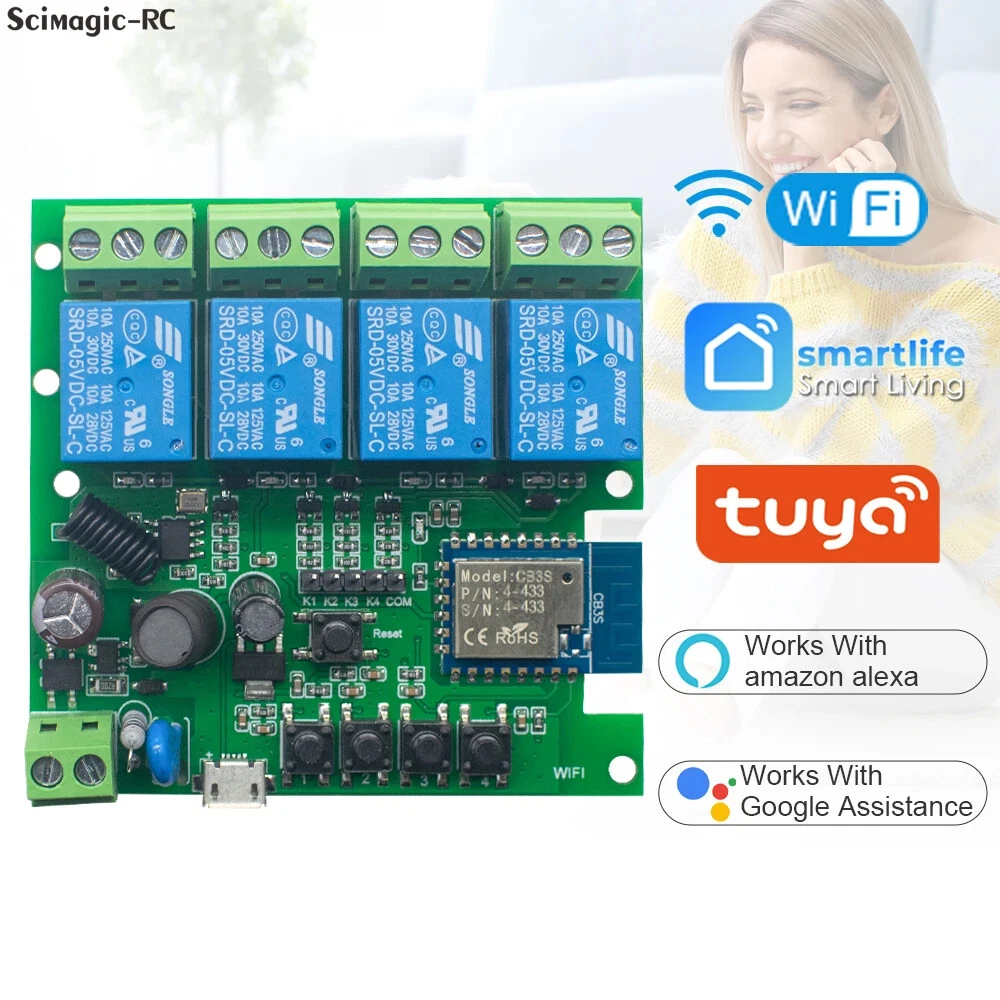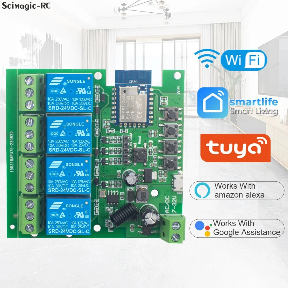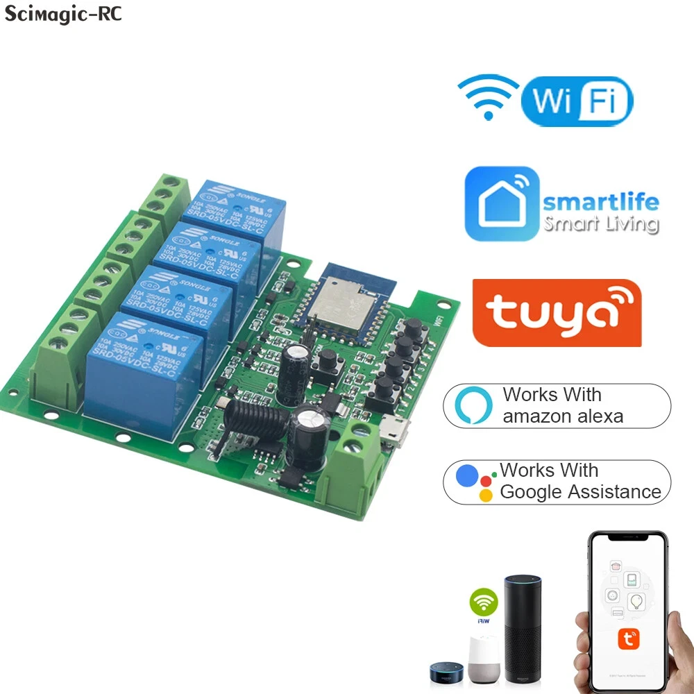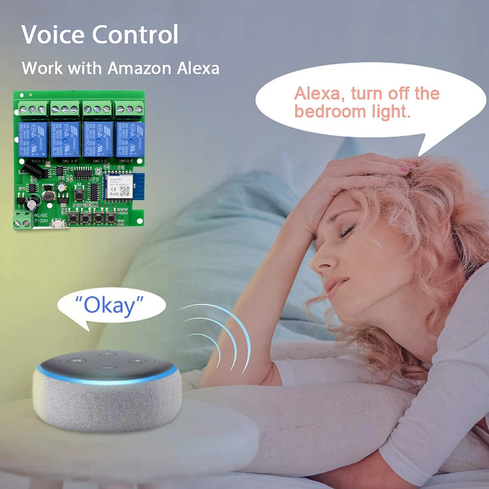Tuya smart WIFI Wireless Smart Home Switch Remote Control with Amazon This product is a wireless switch, supports inching /self-locking mode. Users can add the device to the APP Smart life in order to remotely control connected home appliances or devices. 1、In self-locking mode, customers can remotely turn on/off connected devices immediately. 2、When in inching mode, customers can have two wiring ways to select, and you can set the inching time in APP . 3、WIFi control model, no need to program. No matter where you are, you only need to download a APP to connect the wifi and control the cloud. 4、RF mode , you can control the board with RF433 remote controller. Tuya 1/2/4CH Wifi Smart Switch Use for 1.Remotely give a pulse signal to turn on/off Lights,Lamps and other home appliance. 2.Remotely give a pulse signal to turn on/off Garage Door,Door Access. 3.Remotely give a pulse signal to control DC Motor,AC Motor to Forward and Reverse. Features: *App Support: Free iOS and for Android mobile Tuya APP/Smart Life APP. *Sync Status: Real-time device status provided to App. *Remote ON/OFF: Turn 4 electrical devices on/off remotely from anywhere. *RF Remote control: Turn on/off by 433MHz RF Remote indoors. *3 Working Modes: Switch among interlock/self-locking/inching modes. *Independent control: Control each gang separately in Tuya APP/Smart Life APP. *Supports remotely turn on or off connected appliances, for example light, electric kettle, electric rice cooker, electric curtain, Garage door opener,Motor,etc. *Timing: Supports 8 enabled countdown/single/repeat timing tasks to turn on/off at specified time. *DIN Rail Mounted: Great for industrial control. *Voice Control: Compatible perfectly with Amazon Alexa, for Google Home, for Google Nest,IFTTT. *Share Control: Control your smart home together with your family. Note: Please make sure to select the right model before buying ,or leave us a message before shipping Noted : Your have the correct wif password. Your smart phone or tablet must have access to APP store or google play. Your router is MAC-open. Your smart phone or tablet has connected to a 2.4g wifi with internet. Default inching time 1s , you can set inching time from 2s to 3600s in APP ( smart life / tuya smart). Features: Input voltage : DC/AC 7-32V , AC 85-250V,Micro USB 5V input. Max current : 2200W/10A. WiFi standard : WiFi 2.4 ghz b/n/g. Size : 1CH 69*41*20mm,2CH 10*35*20mm,4CH 78*74*20mm. The life of Relay Model is more than 1,000,00. Default inching Function: Press the open relay by mobile phone, then cut off the pull-on imediately, you can set the inching time in APP , it has the timing-share function at the same time. Self-locking when press the inching and locking button with the light on. Press open relay to pull-on, press close relay to cut off. Include: 1* wifi module 1* manual Overview: This product is a 4 channels universal WiFi wireless smart switch with RF 433MHz module, for your smart home system to remotely and automatically turn on/off home appliances and electronic devices by phone APP. It also can be controlled by RF remote controller indoors. It can connect and control four appliances on APP at the same time, and you can independently turn on/off each of the four gangs. It also supports timing turning on/off the appliances at a specified time, and share to others so that you can control your smart home together with your family. You can also voice control your home appliances by Amazon Alexa, and for Google Home/Nest,IFTTT, and enjoy intelligent life and make your home smarter.