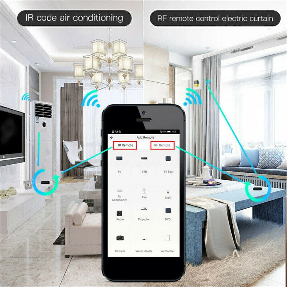 Product Description If you have any questions, please contact customer service first, do not open disputes easily, thank you! Features: 100% Brand New and High Quality! Newest version with RF and IR highly compatible:All-in-one IR and RF remote control devotes to activating Air conditioners, TVs, fans, DVDs, STBs, TV BOXes etc Infraed devices and even RF appliances as RF light,RF switch, RF roller blinds etc with one single remote control;storage of thousands of IR codes.(Support IR 38KHZ and RF 433/315MHz) Multiple remote control RF protocol ensures a better user experience for controlling different 433MHz RF devices as curtain\shades motor,light switch;Local IR code for faster response. WiFi/4G App Remote Control from Anywhere:Equipped with MOES new smart controller,you may control IR and RF devices with free mobile "Smart Life/Tuya" App anytime from anywhere(Compatible with for Android & for iOS).Control your appliances in advance when you are away from home.Turn your smart phone into a universal remote in an easier way. Hands-free Voice Control: for Alexa,set A/C to 77 degrees Fahrenheit. A simple voice command can activate the controller to remotely control most Infrared and RF Control Devices,such as A/C, FAN ,TV, DVD, STB, TV BOX and RF protocol devices.(Furthermore compatible brands or devices ,please check attached list or Smart Life App.) Customized DIY Copy Function: If you can not find device brand in "smarlife"App, Programable DIY learning function may help to copy same function from original remote. Most IR and RF remote control Devices will be applicable such as fireplaces, heater, ceiling fans. Specifications: Power Input: DC 5V/1A(Micro usb2.0) Model: RF-R1 Stand-by Power: ≤0.4W Controlling Distance: Horizontal direction ≤8m, Opposite Direction ≤15m(Finally effect by environment) IR control direction: Multiple Way Operating Temperature: -10℃~50℃ Operating humidity: ≤85%RH Connection type: 2.4GHz 802.11b/g/n Carrier: 38KHZ APP SUPPORT: for Android 4.0/for iOS 8.0 above Wireless Frequency: 2.4GHz RF:433/315MHz Dimension: 7*7*4.8mm/0.27*0.27*0.18in Package Includes: 1* Universal IR remote control 1* power cable About Us We accept all payments authorized by eBay. About Us We accept all payments authorized by eBay. powered by