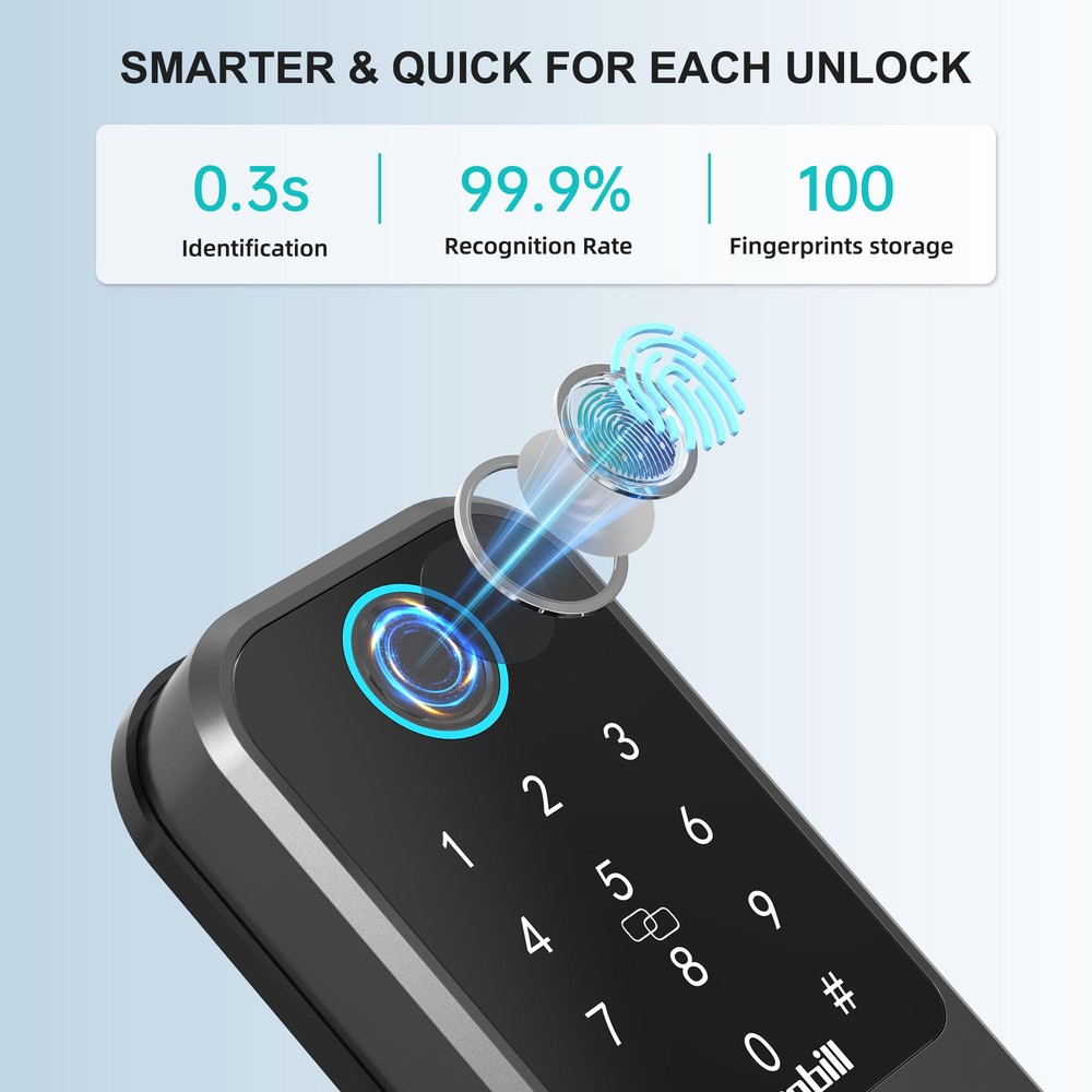 【9-in-1 Smart Keyless Entry Door Lock】Integrates with Next Lock App. Features fingerprint recognition, passcodes, IC fobs, keys, auto-lock, 1-touch locking, WiFi, Bluetooth, and voice control. Manage your lock easily from anywhere with the app. 【Voice-Controlled Security for Your Home】Smart Lock integrates smoothly with front/back doors. Includes G2 gateway for 2.4GHz WiFi. Control with Alexa or Google Home voice commands. Easily upgrade your home security with this smart lock. 【WiFi Remote Unlock/Lock】Remotely unlock ’s fingerprint door lock—perfect for vacations or when away. Keep the gateway within 16ft (10ft if walls block) of the lock and router for seamless 2.4GHz WiFi. Stay connected and in control from anywhere. 【Biometric Unlock Revolution】Unlock your smart deadbolt in 0.3 seconds with a fingerprint. Store up to 100 fingerprints in the Next Lock App for guests and backups. Say goodbye to lost or copied keys, and enjoy hassle-free access. 【Grant Flexible Temporary Access】Offer temporary access codes for dog walkers, guests, housekeepers, or staff. Assign up to 250 passcodes and revoke them anytime. No more worrying about extra keys floating around, you're in control. 【Auto-Lock & 1-Touch Locking】Never worry about forgetting to lock your door again. Set the auto-lock to engage 1-900 seconds after closing, or tap the "#" sign on the keypad for immediate locking. Perfect for busy lifestyles or added peace of mind. 【Low Battery Alerts & Type-C Emergency Charging】Monitor battery life in the Next Lock App. Get notified when battery drops below 20%. Includes a Type-C backup charging port for temporary power, ensuring you're never locked out due to a dead battery.