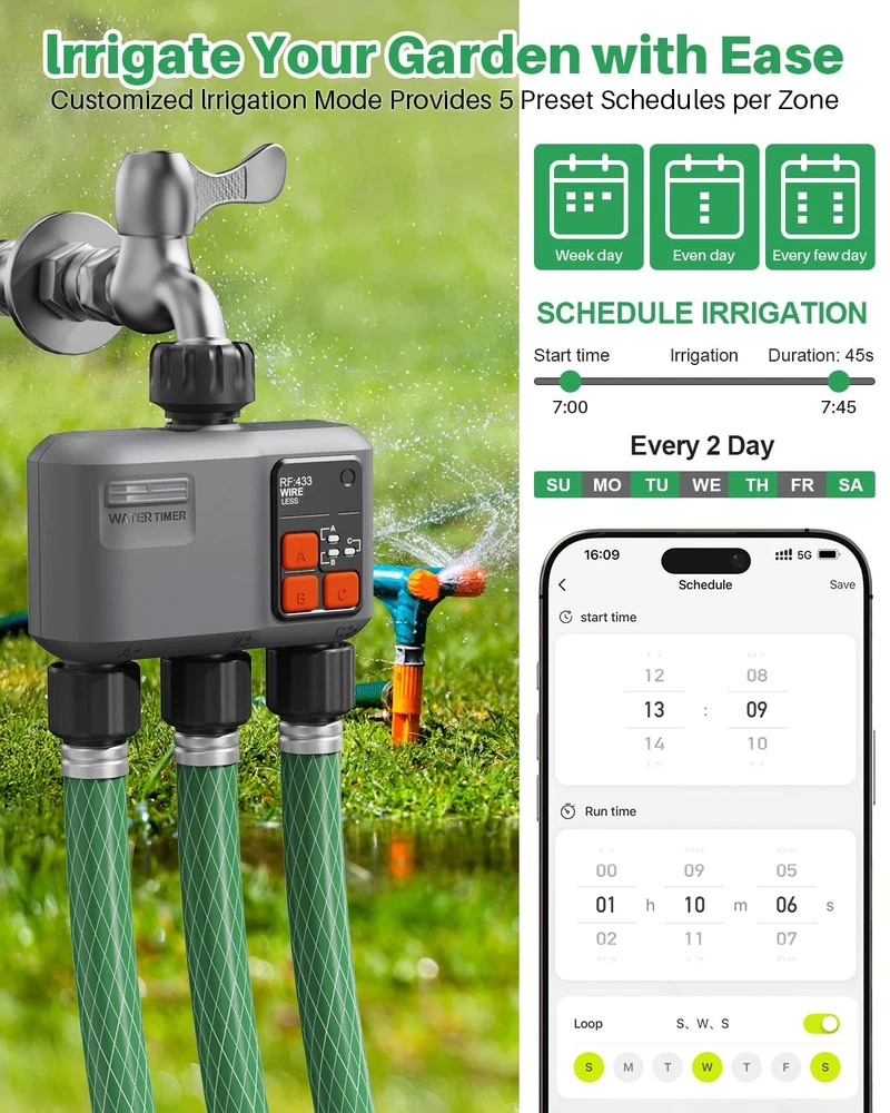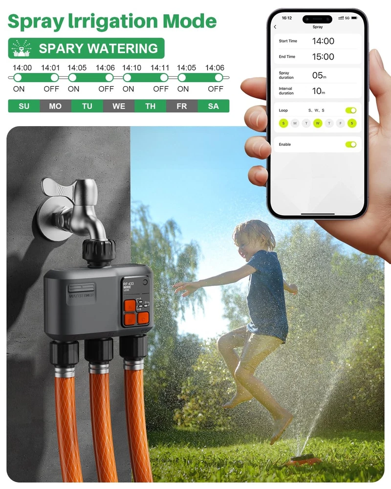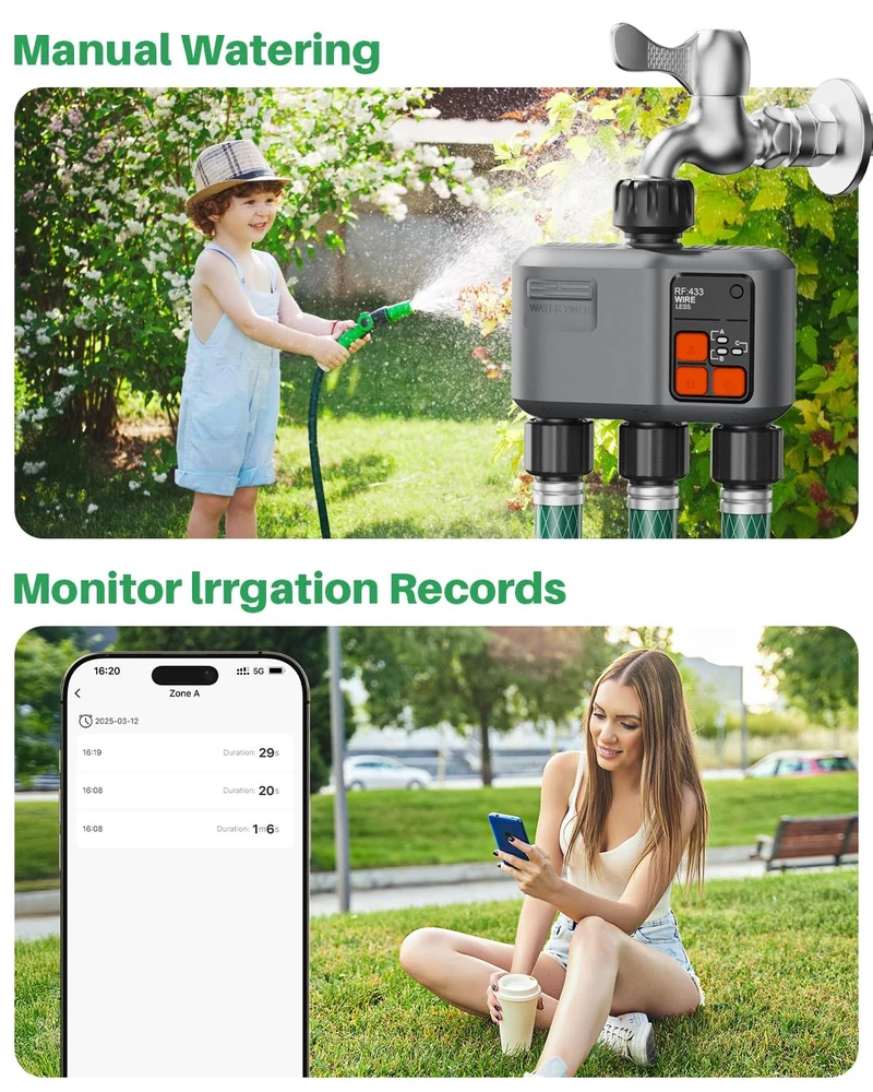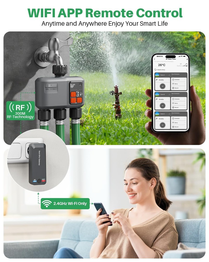 WiFi Sprinkler Timer 3 Zone with 984 Feet RF Gateway, 3 Outlet Smart Water Timer for Garden Hose with Rain Delay/Manual/Automatic,WiFi Water Hose Timers for Garden & Lawns 984 feet (300 M) Ultra-long Distance Connection, Wider and More Stable Coverage: The Wifi water timer uses advanced RF technology, the gateway and the water timer is up to 984 feet (300 meters), easily cover large areas of gardens and courtyards.Allows for true remote operation and easy garden irrigation management. APP Remote Control & Voice Control, Easier Garden Management: Add the WiFi sprinkler timer to the WiFi gateway (2.4GHz WiFi only) via the "Smart Life" APP, you can remotely control the watering plan (watering frequency, duration) anytime and anywhere. It also supports Alexa and Google voice control, making it easy to manage your garden with just your voice. 3 Outlet Independent Control, Easy Control Different Areas: WiFi hose timer with 3 independent irrigation valves. Each valve can be individually programmed. Through different outlets, different watering plans can be set up separately to meet the irrigation needs of different areas such as lawns and gardens. 3 Irrigation Modes for Precision Watering & Water Savings: The water timer for garden hose has a timed irrigation mode and a spray mode. In irrigation mode, up to 5 watering procedures can be customized per outlet and the duration can be adjusted. The spray mode allows flexible adjustment of runtime and interval time. Both modes support weekly cycle frequencies. Help you fully save water bills. Rain Delay & Irrigation Record, Smarter Management: This smart hose timer 2 Outlet has a rain delay function and supports 1-7 day watering delays to avoid waste during rainfall. Have a separate watering log page that details the start time, duration and end time of each watering. Manual Mode, Flexible Operation is More Convenient: The WiFi hose timer also supports manual mode, which allows more flexibility to use the control button to start or stop watering at any time. Emergency watering can be quickly started in special circumstances to ensure plant safety. Extensibility & Waterproof, Built a Smart Irrigation System: This WiFi water timer for garden hose can be expanded to connect with multiple smart timers (no more than 4 recommended), easily covering a larger area of the garden; IP55 waterproof, durable, stable operation even in bad weather outdoors, ideal for building a smart garden irrigation system.