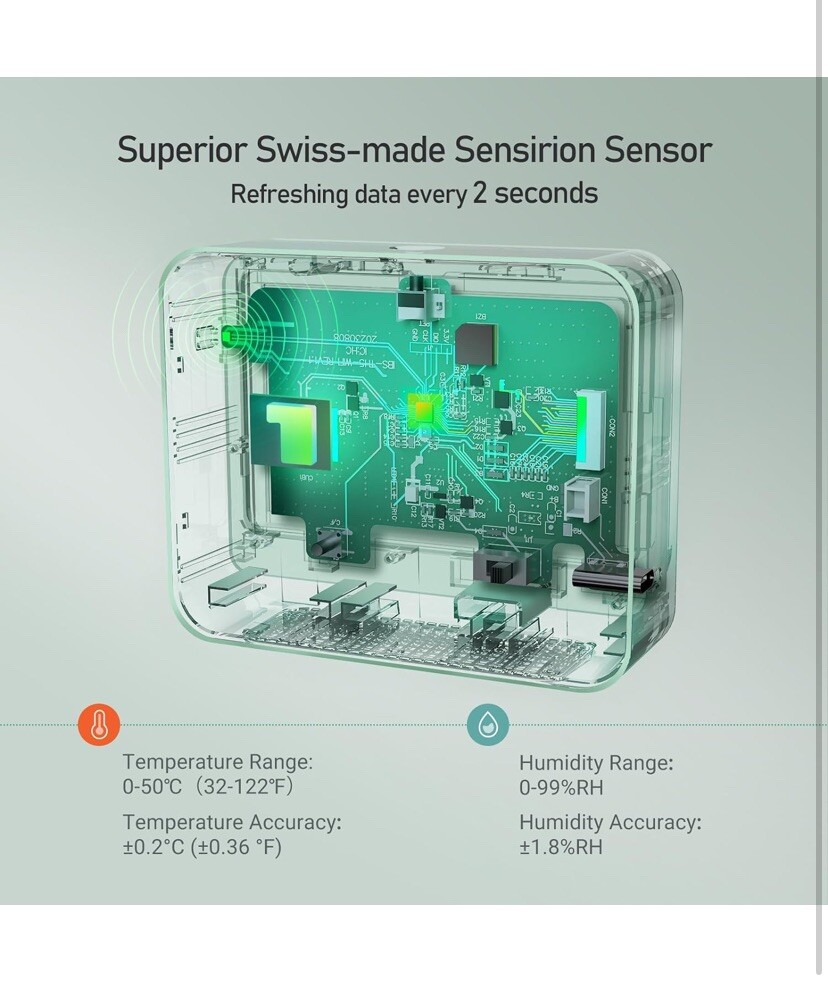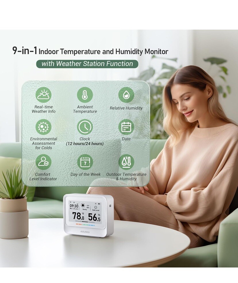 Multifunctional WiFi Thermometer Hygrometer】: It's a temperature and humidity monitor with a comfort color bar, but also displays time, date, and week, and supports weather forecast and environmental assessment for colds. 【Real-Time Weather and Forecast】: The smart weather station will automatically sync weather data, get real-time weather information and check tomorrow's weather forecast at any time. 【Large & Easy to Read Display】: This WiFi temperature sensor has an ultra-big electronic ink display screen of 3.71 inches; Features high contrast, ultra-wide viewing angle, and is easy to read. 【WiFi Remote Monitoring】: Connect this remote temperature monitor to a 2.4GHz WiFi, you can view temp and humidity anytime anywhere on the INKBIRD app. Free data storage and export for up to 2 years. 【High Precision Sensor】: The WiFi temperature monitor uses an advanced Swiss-made Sensirion sensor that quickly refreshes data every 2 seconds. Temperature accuracy: ±0.36°F/±0.2°C; Humidity accuracy: ±1.8%RH. 【Long Battery Life】: The built-in 2000mAh rechargeable battery the temperature and humidity sensor can work continuously for 12 months after a full charge. Longer battery life makes the indoor thermometer for room temperature more environmentally friendly and convenient. Perfect for bedroom, wine cellars, basements, etc.