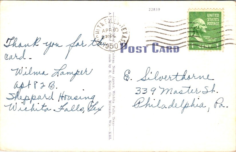 Material:PaperContinent:North AmericaCity:Wichita FallsEra:Linen (1930-1945)Original/Licensed Reprint:OriginalCountry:United StatesPostage Condition:PostedType:Printed (Lithograph)Number of Items in Set:1Region:TexasSubject:Post OfficeCountry of Origin:United StatesTheme:Architecture, Cities & Towns, Community Life, Domestic & Family Life, Occupational, Post OfficeUnit of Sale:Single Unit