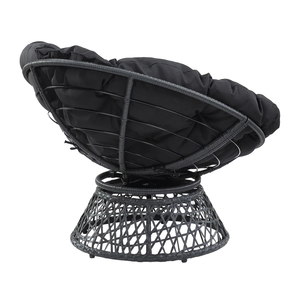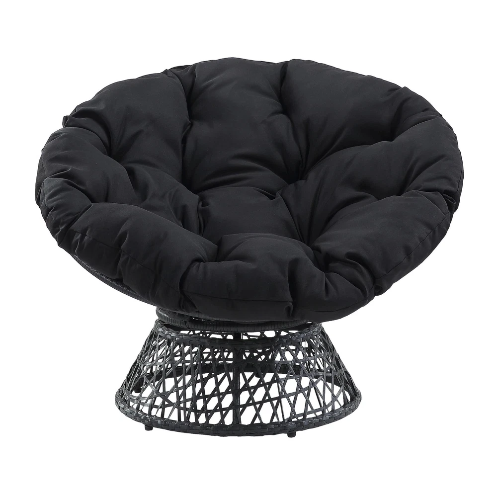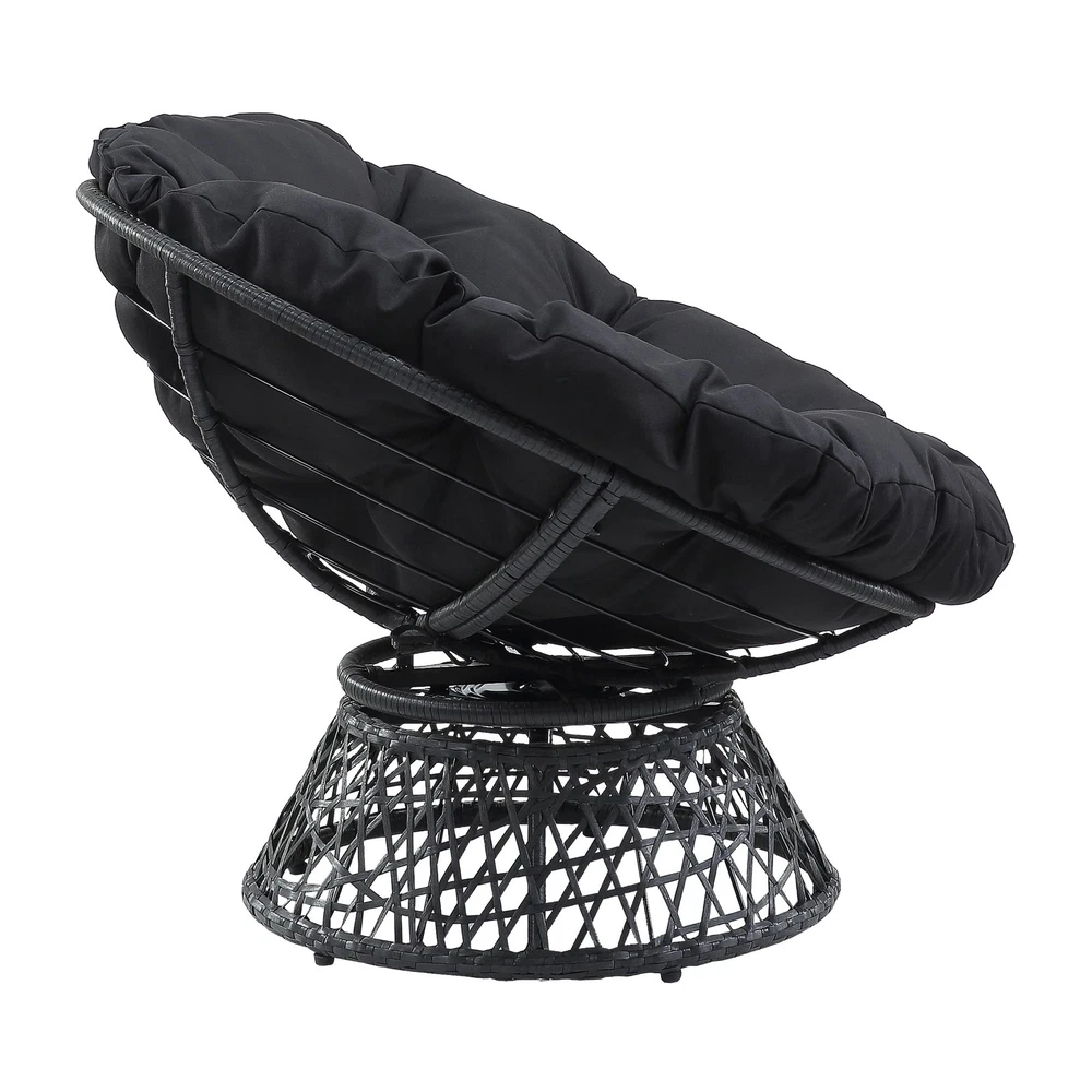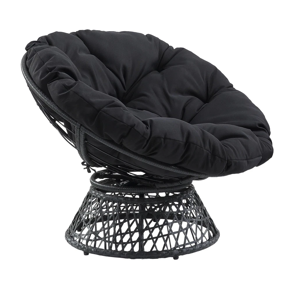 Create a laid back vibe in your home with our twist on the classic papasan chair design. Nest into the generously large Dacron-filled cushion. Enjoy the boho styling of our durable resin wicker wrapped over a metal frame. Complete with a 360° swivel to twist and turn to your heart’s content. Tune in to a time when listening to your favorite albums and sipping on a cool, refreshing drink was your only ambition for the day. Add a bit of fun to your living room, family room or dorm with our easy, casual Papasan Chair. Available in several exciting colors and finishes. Durable, well built and just plain fun! Enjoy the boho styling of our papasan chair made with durable resin wicker wrapped over a metal frame. Lounge and twist and turn to your heart’s content with virtually frictionless 360 degree swivel. Nest and relax into the generously large high quality soft Dacron-filled button tufted cushion. The seat cushion is easy to remove dust and debris since it is tied on the frame by straps. Overall Size: 40” W x 36” D x 35.25” H; Seat Size: 40” Diameter x 4.5” T; Back Size: 40” W x 18” H x 4.5” T