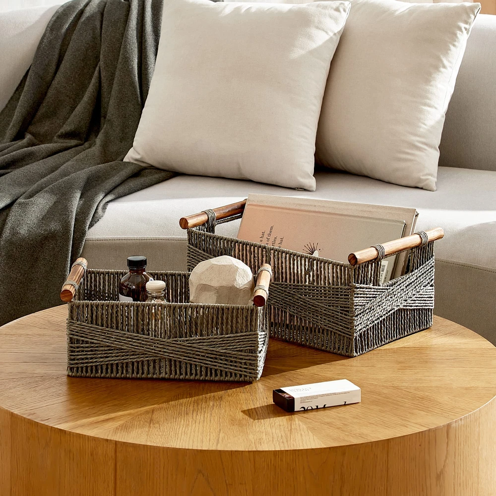 100% RECYCLABLE MATERIAL - Made from recycled paper ropes, wood handles, and built-in iron frames, these storage baskets are designed with a sustainable purpose and are also sturdy to use. MINIMALIST STYLE - Each basket is in a succinct finish of intersecting lines for a touch of whimsy. Meanwhile, the built-in wire construction ensures the stability of the set. The neutral color makes these baskets for organizing matches with any interior style. HANDMADE BASKET - Handmade by skillful craftsmen, this storage basket set is lightweight yet durable. The handles have been delicately carbonized, creating a charming unfinished wood appearance. The distinctive wooden texture adds to the box's overall visual appeal and brings a touch of rustic charm to any living space. VERSATILE STORAGE SOLUTIONS - With iron frames inside to enhance sturdiness, this set is strong enough to hold towels, makeup, books, etc, making it ideal for cluttered spaces like the nursery, living room, bedroom, and home office. PORTABLE - A lovely flexible basket trio, great for carrying around with durable wood handles and a spacious room for storing items. Size:L- 14.6”L×9”W×6.5”H, S- 13”L×7.5”W×5.5”H