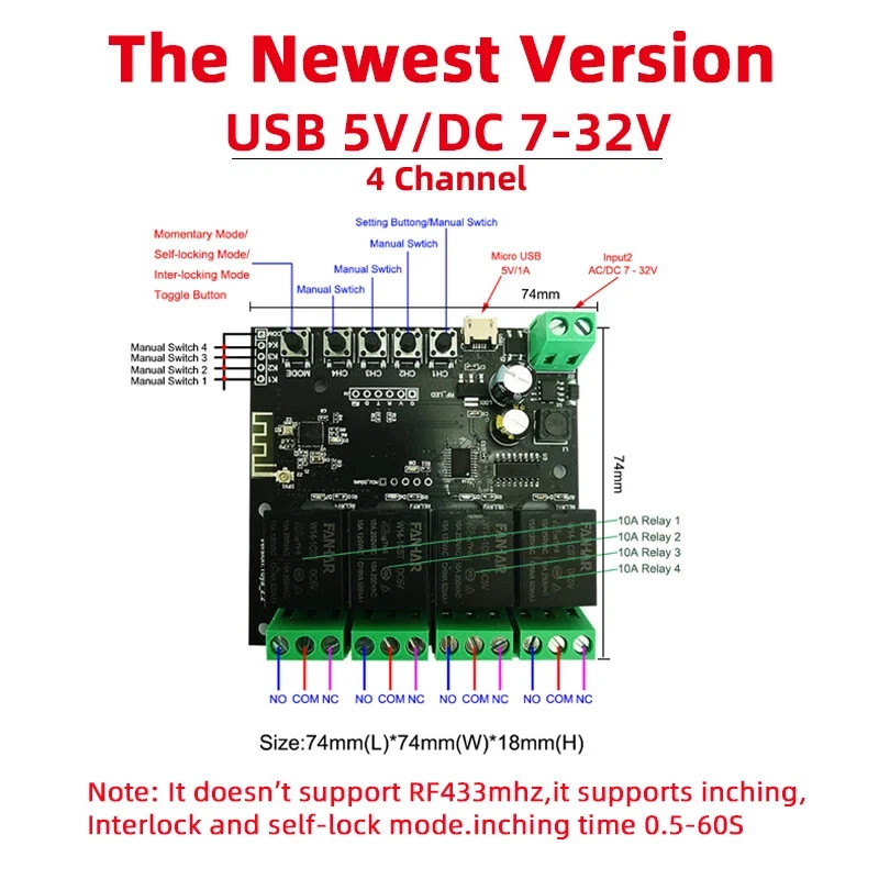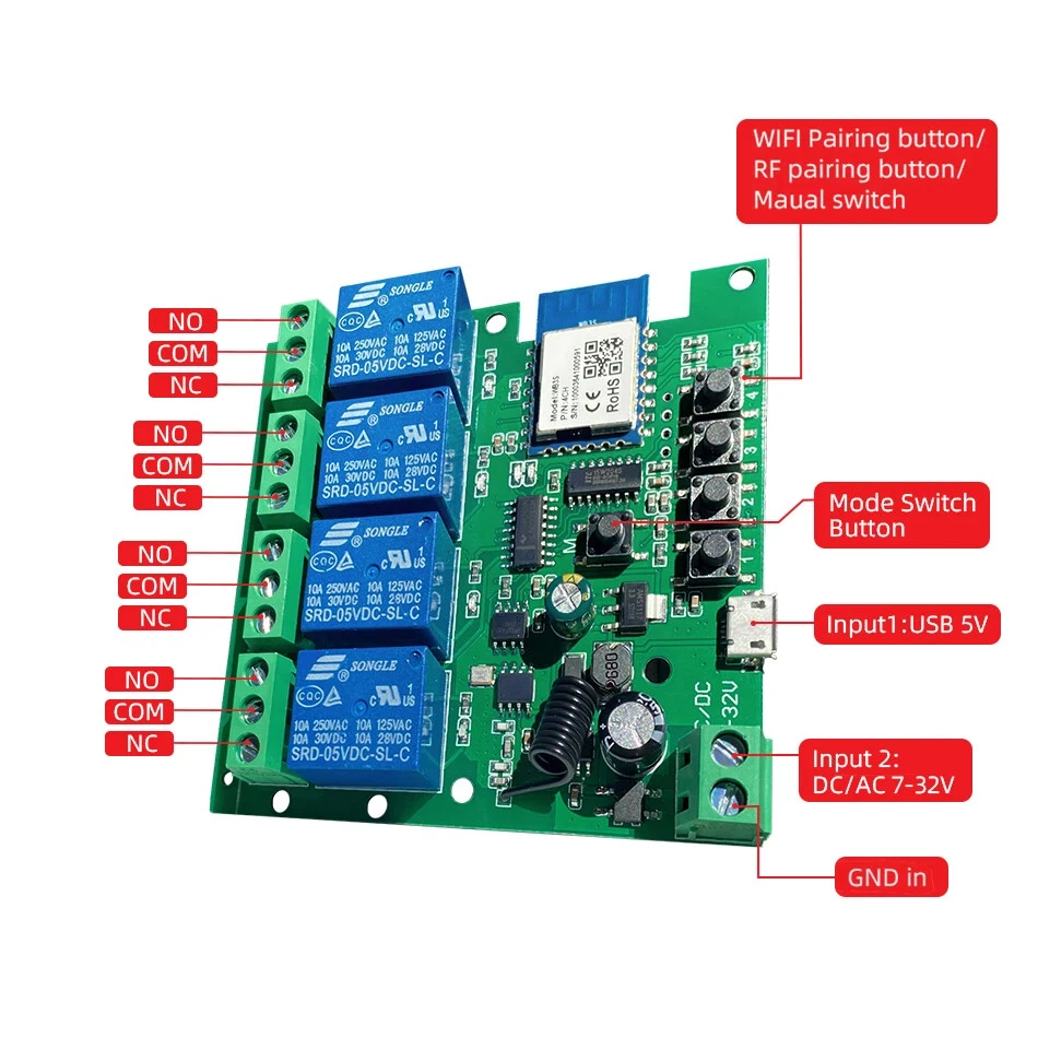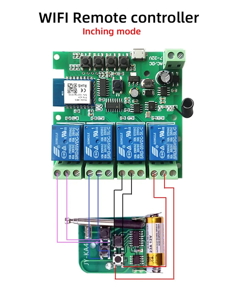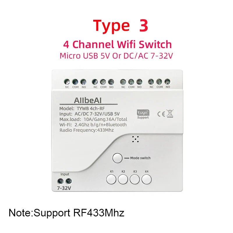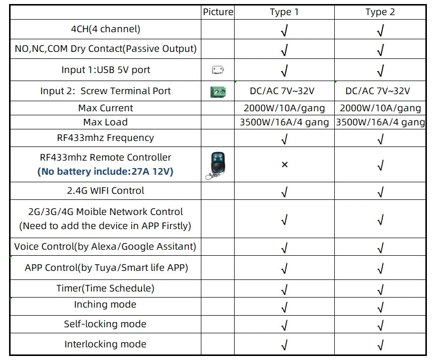 Package Listing Type 1: 4 Channel Wifi RF433 Relay Type 2: 4 Channel Wifi RF433 Relay+RF433 Remote Controller Type 3 : 4 Channel Wifi RF433 Relay+Case Shell Type 4: 4 Channel WIFi RF433 Relay+Case Shell+RF433 Remote Controller Type 5: 2 Pieces RF433 Remote Controller,no wifi relay Type 6 2 Pieces RF433 Remote Controller,no wifi relay Use For 1.Remotely give a pulse signal to turn on and turn off Lights,Lamps and other home appliance. 2.Remotely give a pulse signal to turn on and turn off Garage Door,Door Access 3.Remotely give a pulse signal to control DC Motor,AC Motor to Forward and reverse Overview Type 1,2 The RF433 remote controller (receiver) don't include battery battery type;27A 12V,The picture of the battery is in the end of the page. The WIFI module can be controlled by fix code EV1527 RF433 remote controller,and it can't controlled by rolling code remote controller. Note The relays is passive output(dry contact), No matter how many power you supply in the input, the output don't have any voltage, you also need to supply power in output. The power supply in the input just can make PCB board work.if you do not supply power in output, the connectted device can't work. 3 Working Modes 1.Self-locking : each channel could be switched on/off seperately.You also can turn on/turn off all channel at the same time. 2.Interlocking mode : Switch on any channel , other channels will be switched off automatically . 3.Inching mode(jog mode) : Switch on one channel,the channel will be automatically closed after 0.5 seconds .Other channel is same as the channel. If you need to change the mode,you need to press the mode button or active other working mode in the app. How to Change the Inching Time If you need to change the inching time. You need to press the mode button to enter into self-locking mode or interlocking mode,so you can change the inching time on the APP. The inching time only available in the self-locking or interlocking mode) The time range is 2-3600 seconds. Features: 【Two Input Ports】 You could choose USB 5V port or the screw terminal port to supply power in the input to make the pcb board board work. 【Dry Contact/Passive Output】 No matter the power you supply in the input, the output don't have any voltage If you do not supply power in output port, the connectted home appliance can't work, you also need to supply power in output. 【Timer】 The connectted home appliances can be automatically turned on/off according to the time schedule. Each channel can set different time schedule. Different Ways to Control the WIFI Module 【APP Remote Control】 You can control the connectted home appliance in Tuya or smart life APP anywhere and anytime.Such as light, electric kettle, electric rice cooker, electric curtain, etc. 【RF433 Control】The WIFI Module support RF433 Frequency,and you can control the WIFI module by RF433mhz remote controller. 【 Mobile Phone Control】 When you go outside or at home,You could control the module in your smart phone by 2.4Ghz WIFI or 2G/3G/4G Mobile Network. (Note:The router need to online and the WIFI module need to keep a close distance with the router) 【Voice Control 】 Compatible with Alexa and Google Assistant, you can use the voice control to turn it on/off the connectted home appliances . 【Share Control】 One device can control by Multiple phones,you can share the wifi module with your family member. 【Group Control】 one phone can control Multiple smart device.You can add the wifi module and other smart device in a group,and then turn on/off all smart device at the same time. 【Scene Linkage】 Creating smart scene to trigger ON/OFF all WIFI smart home appliances by departure mode, home mode, temperature, humidity, or other conditions. Description: Input1: USB 5V Port Input 2 :(screw terminal port): DC/AC 7-32V Output:Passive Output(Dry contact) Working frequency: 50-60Hz RF433 Frequency Working temperature: -20-70℃ Wifi standards/ protocol :IEEE 802.11b/g/n, WIFI 2.4Ghz Total load power(Output): 2000W/10A/gang Max Load(Output):3500w/16A/4 gang Max current(Output):`10A Size: 75*73*20 mm APP Remote Control You can remote turn on/off household appliances and set timing schedules to turn on/off the household appliances via app Tuya/Smart life anywhere anytime. such as lights, celectric curtains ,electric curtains fans. so you can enjoy an high-tech life. Timer Via app,you can set time schedules to automatic turn on/off the household appliances , such as lights, celectric curtains ,electric curtains fans. so you can enjoy an high-tech life. Case(Shell) Included Type 3 and type 4 include case(shell),and you can use it in different environment. Product Detail Wiring Diagram for Light/Lamp Wiring Diagram for RF433 Remote Controller Wiring Diagram for AC/DC Motor Only one motor can run each time. You can't run two motor at the same time. If you need to connect two motor at the same time, you can set interlocking mode to make sure only one motor to run each time. Wiring Diagram for Door Access Wiring Diagram for Electric Motor Lock The Electric Motor Lock must have K-, K+, GND, +12V ports. 2. K+ must be connected to the 12V port How to pair RF433 remote controller with with the devices. 1.Press the RF433 pairing button for 4 seconds,and wait until the blue led indicator turn on. 2.press any key of RF433 remote controller, and then you can pair the channel with one key of RF433 remote controller successfully If you need to pair other key of the RF433 Remote controller and other channel, you need to repeat the step. How to clear the pairing RF433 remote controller with with the devices. 1.Press the RF433 pairing button for15 seconds,and wait until the blue led indicator turn off. If you need to clear the pairing between other key of the RF433 Remote controller and other channel, you need to repeat the step. Battery of RF433 Remote Controller(Not included)
